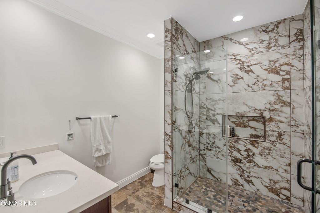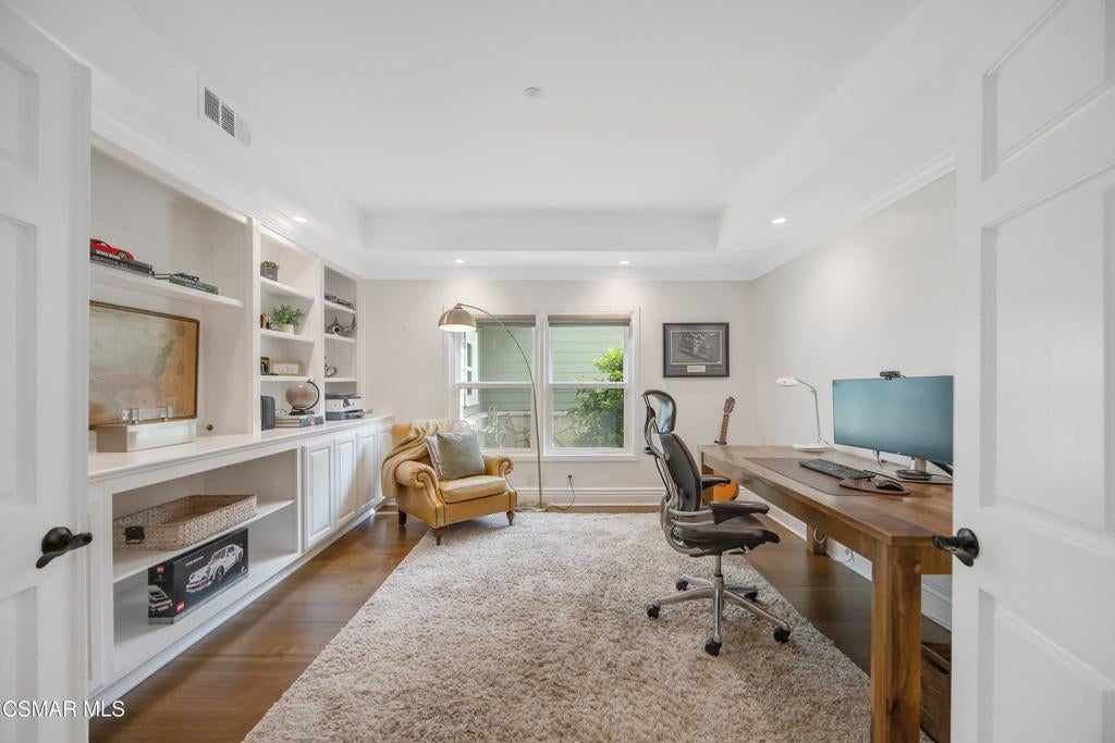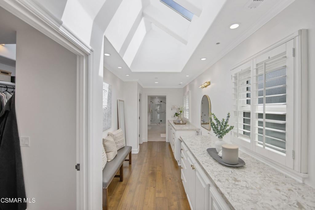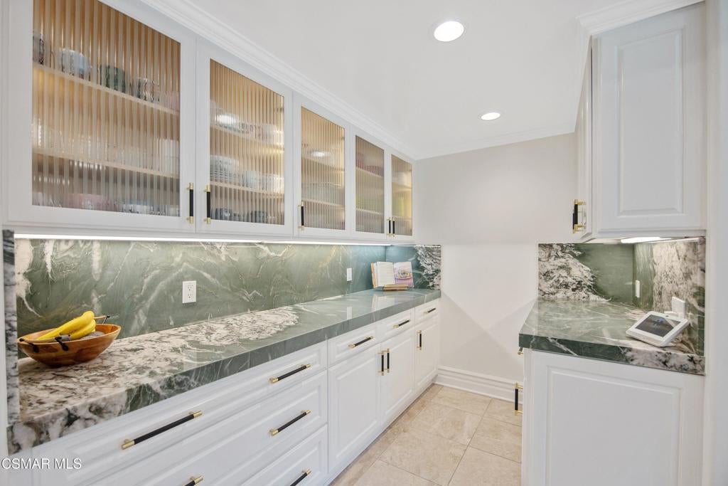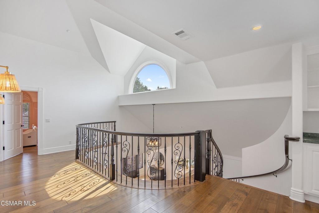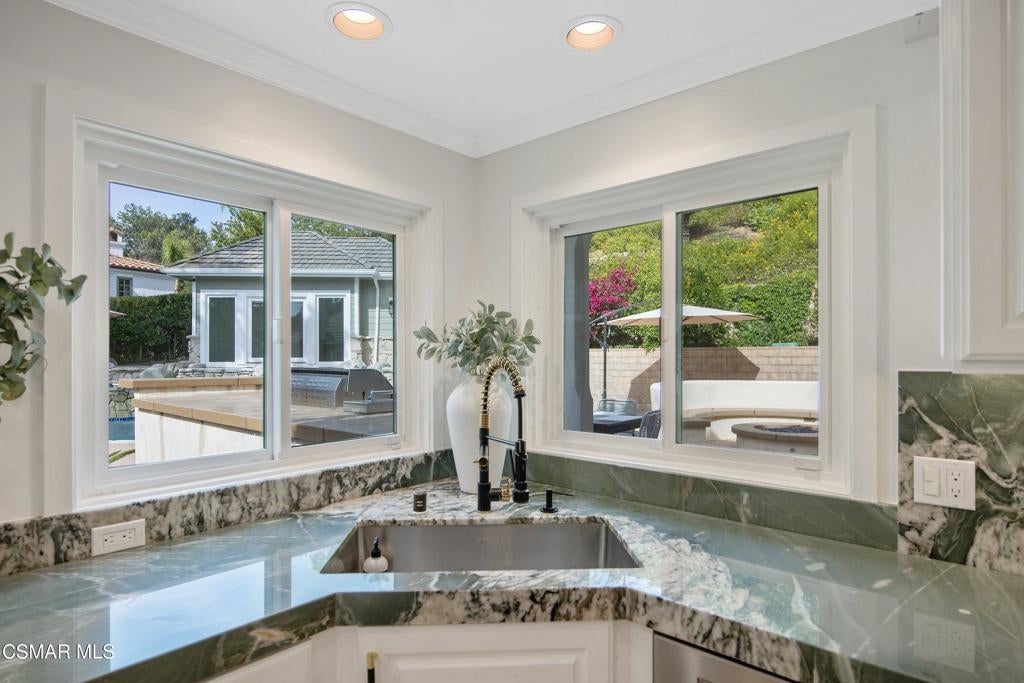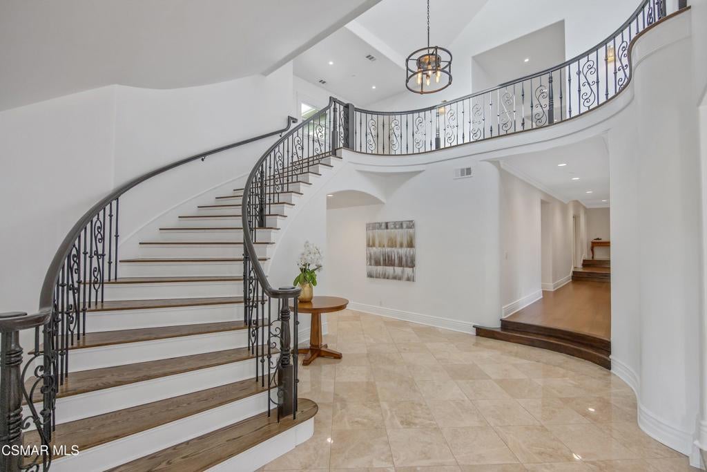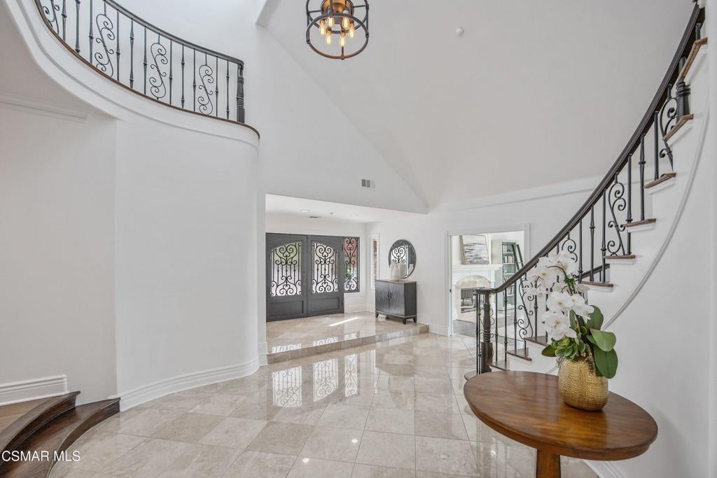 A Masterfully Reimagined North Ranch Estate. Set on a quiet three-quarter-acre lot in North Ranch's coveted Whitehawk neighborhood, 1401 Pathfinder is a study in refined luxury and thoughtful design. Spanning just under 6,300 square feet, this five-bedroom, six-bath residence w/ pool house has been completely transformed to feel elevated, effortless, and timeless.Enter through striking wrought-iron double doors and into a dramatic entry framed by a sweeping curved staircase, soaring ceilings, and natural light pouring in through custom windows. The formal living room, tucked behind pocket doors, balances sophistication and warmth with custom windows and a statement marble fireplace framed by twin custom bookcases. Throughout the home, curated architectural details- custom wainscoting and board-and-batten, newly installed hardwood floors, and elegant marble accents create cohesion and depth.Each bedroom is designed as a true retreat, featuring high ceilings, custom California Closets, and beautifully renovated ensuite baths finished with marble and custom tile. Two ensuite bedrooms on the main level offer private outdoor access, reinforcing the home's easy indoor-outdoor flow.The kitchen, redesigned in 2023, is both striking and highly functional. Wolf appliances, marble surfaces, custom cabinetry, an oversized island, and a walk-in pantry make it equally suited for everyday living and elevated entertaining. The adjoining breakfast area adds charm and practicality with traditional detailing, additional built-ins, and prep space.Anchoring the main level is an expansive great room that opens seamlessly to the kitchen and backyard. With soaring ceilings, a massive custom bar and bar area and a bold statement fireplace, it's the heart of the home--a space designed for gathering, celebrating, or unwinding in style.A downstairs office features built-in bookcases and offers the versatility to function as a den, library, or private workspace. The formal dining room has been thoughtfully reimagined as a private indoor gym, offering remarkable flexibility. This space easily accommodates large-scale formal dining, a recreation room, or a playroom, adapting effortlessly to your lifestyle.A well-appointed laundry room with sink and ample storage is conveniently located just outside the attached four-car garage, creating an efficient and practical transition space for daily living.Upstairs, three additional ensuite bedrooms await. Two open to a wraparound balcony overlooking the backyard, while the primary suite stands apart as a true sanctuary- generous in scale, offering a cozy seating area by its corner fireplace, and paired with a spa-inspired bath featuring a dual-head shower and soaking tub. Newly installed skylights shine natural light throughout.Outdoors, the property is designed for both relaxation and connection. A tropical lagoon-style pool and spa, gas fire pit with generous built-in seating, and a versatile pool house create an environment ready for hosting or peaceful evenings at home. Two 250 year-old oak trees and refreshed landscaping add privacy and serenity across the expansive grounds. Just minutes from North Ranch Country Club, premier golf, scenic trails, and everything Westlake Village has to offer, 1401 Pathfinder delivers space, privacy, and elevated living in one exceptional offering. Rarely does a home combine this level of design, scale, and setting. This is North Ranch living at its finest.