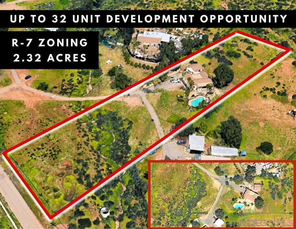 Up to 32 Unit Development Opportunity! 2.32 Acre R-7 Housing Community, Townhome, or Multifamily Development Opportunity. Parcel was recently approved for up-zoning to R-7 by the City of Santee as part of the 6th Cycle Housing Element. R-7 Zoning allows for 7 to 14 units per gross acre. It is a Medium Density Residential General Plan designation. Per the city's zoning code, the R-7 zone "is intended for a wide range of multiple family residential development types including detached units in planned residential development at the lower end of the density range and attached units at the higher end of the density range." Maximum lot coverage is 55%, maximum height is 35 feet/three stories, and there is no minimum lot size. NEW CONSTRUCTION COMMUNITIES IN DEMAND! Property is located in close proximity to in demand housing development communities such as Mastercraft Residential's Walker Trails, Summit Santee's Noble Way, Pardee Homes' Castlerock, Kb Homes' River Village and townhome/condominium development communities such as Presidio Cornerstone's Laurel Heights, Pardee Homes' Weston, City Ventures' Caribbean Way, Kb Homes' Prospect Fields, and William Lyon Homes' Riverview, just to name a few. Recent New Construction Community Home sales boast a closing range between $905,500 and $1,300,000. Recent New Construction Townhome/ Condominium Communities boast a sales closing range between $738,000 and $964,000.00 PRICE & TERMS: All offers will be considered. Suggested due diligence period is 60 days. Offers contingent upon entitlement may be considered.