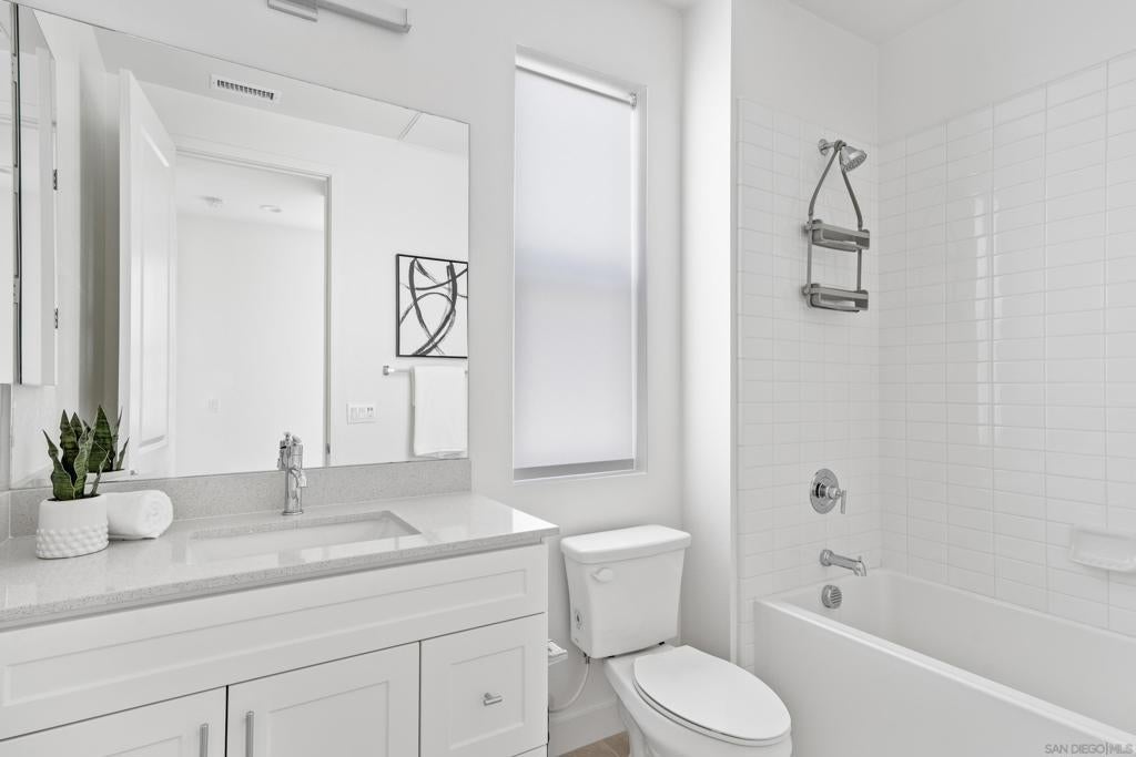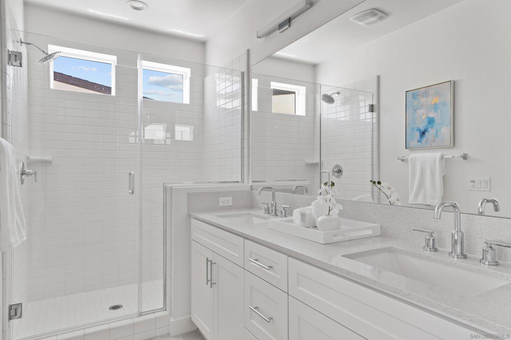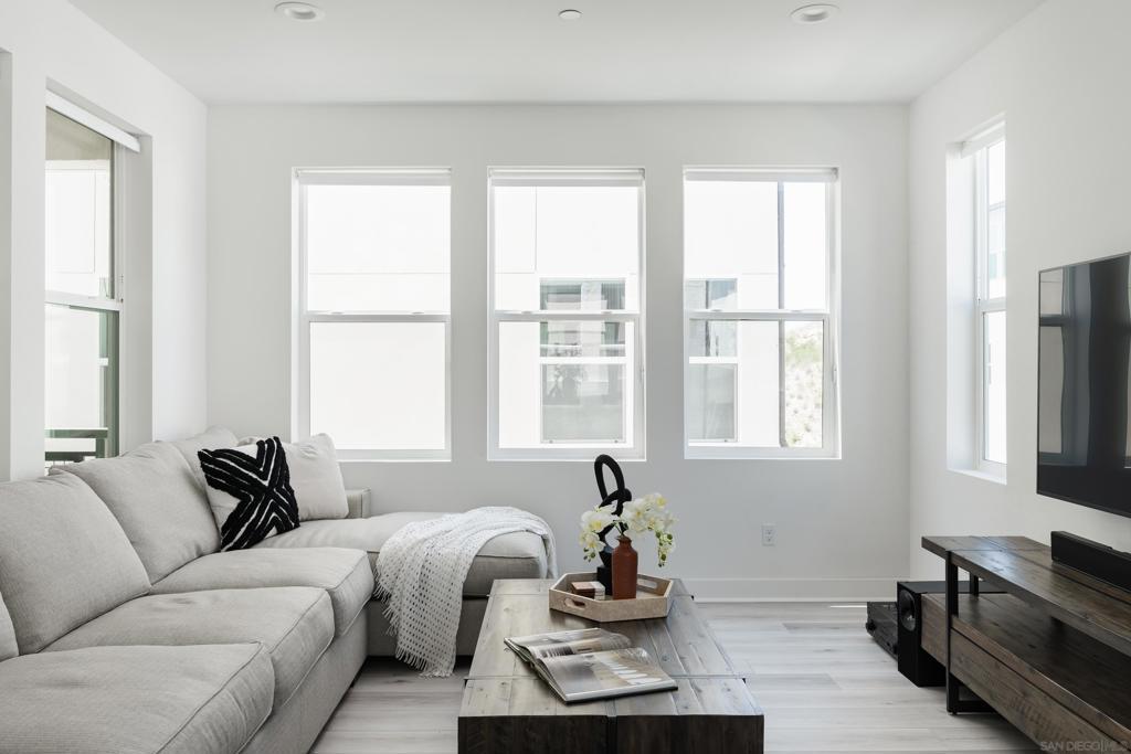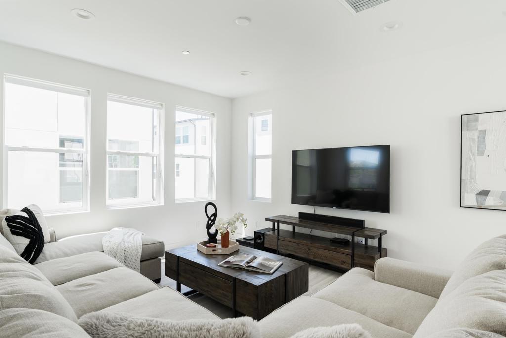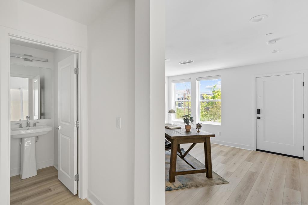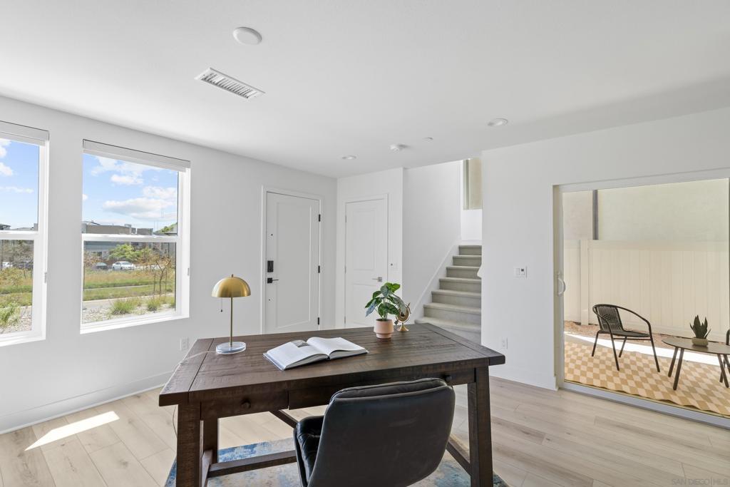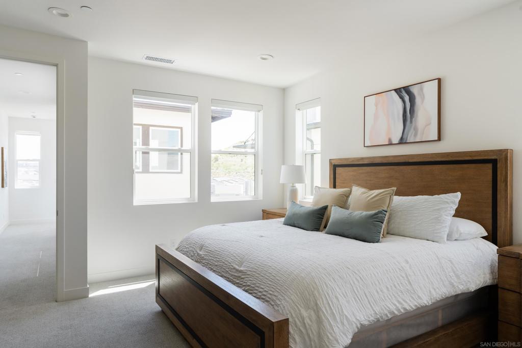 Welcome to the highly sought-after 3 Roots Community of Sorrento Mesa. This stunning new construction residence boasts immaculate condition throughout, showcasing modern architecture and luxurious finishes at every turn. With 3 full bedrooms plus an office space, this home offers ample room for both relaxation and productivity. Solar provides huge savings. The open floor-plan creates an inviting atmosphere, perfect for entertaining guests or simply enjoying day-to-day living. The attached 2-car garage provides convenient parking. Enjoy your large backyard patio or unwind on the spacious balcony off the kitchen and living area—ideal for al fresco dining. Abundant natural light streaming in through ample windows, while maintaining privacy from every angle. With no home directly in front, your view is of lush greenery, adding an extra layer of tranquility and seclusion. This home seamlessly blends indoor and outdoor living, allowing you to connect with nature without ever leaving the comfort of your own home. The ultimate lock-and-leave lifestyle, in this meticulously crafted home, offering unparalleled convenience and security for your peace of mind. The epitome of wellness and convenience at the 3Roots Community! Residents enjoy a plethora of amenities designed to promote a balanced lifestyle and foster community engagement. Explore the tranquil beauty at the three meticulously curated parks—Wisdom Park, Wellness Park, and Wonder Park—ideal for relaxation, reflection, and outdoor activities. Embark on invigorating adventures along the scenic Community Trails, including Carrol Canyon Creek and Bruce Brown Community Park, perfect for walking, jogging, or biking. Indulge in resort-style living with access to resort style pool oasis, complete with a lap pool, inviting cabanas, and sun-drenched lounging areas. For those seeking an active lifestyle, state-of-the-art Fit and Recreation Center offers everything you need, from cutting-edge exercise equipment to engaging community classes and events, ensuring you stay motivated and inspired on your wellness journey. Conveniently situated near freeways, shopping destinations, dining options, pristine beaches, and the San Diego International Airport, this home offers unparalleled accessibility to all the amenities and attractions that make San Diego living truly extraordinary. Experience the perfect blend of comfort, convenience, and community at this exceptional residence in the coveted 3Roots Community.