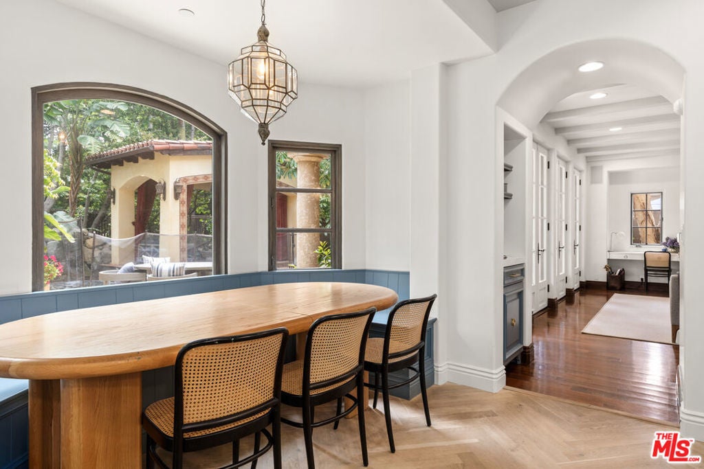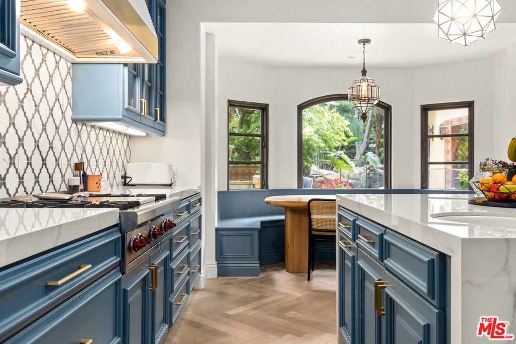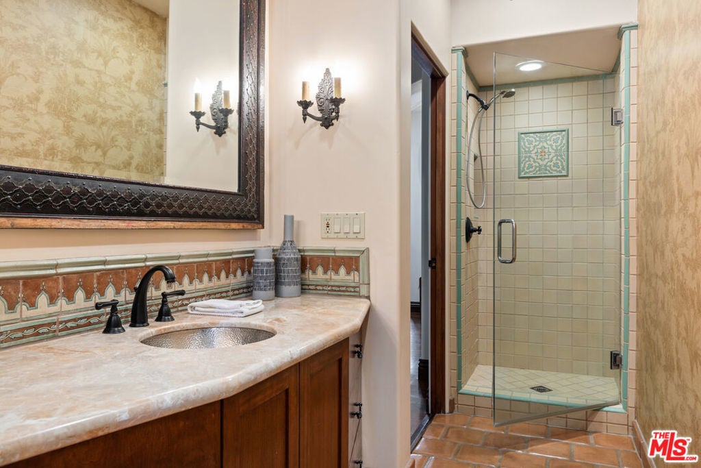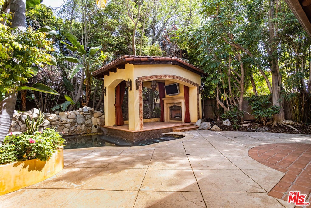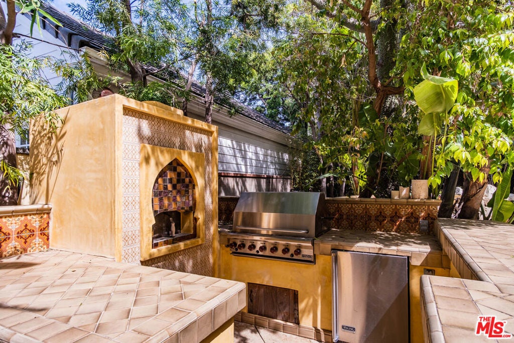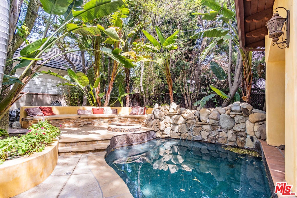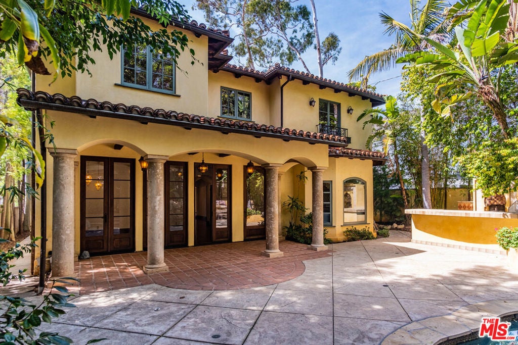 Located in the heart of Pacific Palisades, this chic custom designed Spanish-style luxury home awaits you. This spacious 4 bedroom (3 bedrooms upstairs, 1 downstairs) 3 bathroom abode offers you a spacious and remodeled open kitchen with top of the line appliances and a custom built-in breakfast nook. The Spanish modernized design includes beamed ceilings, leaded stained glass window, cast stone fireplace, forged iron work, and sophisticated lighting fixtures throughout. Off the kitchen which is adjoining to the living room, is the resort like backyard which offers an extraordinary entertaining space. The pool wraps around the outdoor casita, which is complete with a fireplace, TV and outdoor dining/lounge area. There is an outdoor kitchen with Wolf BBQ and authentic Italian pizza oven, seating area, and fire pit. The two car garage has been converted into an additional room/ den or play area. Close proximity to the Caruso Village, designer shops, high-end dining and luxurious amenities that Caruso Village has to offer.