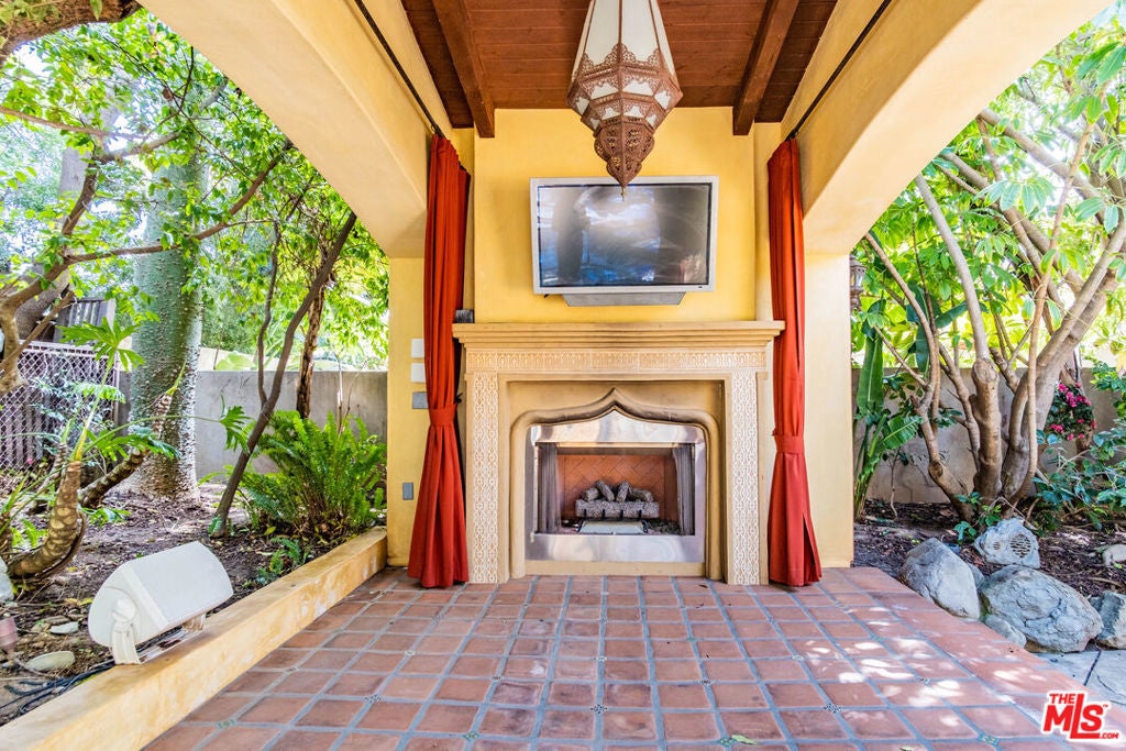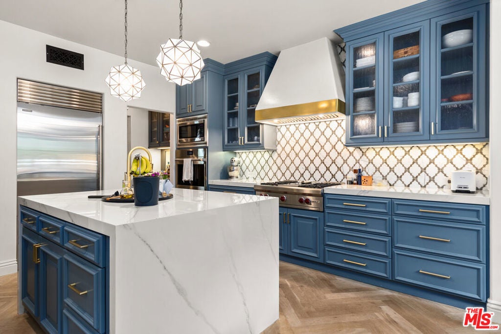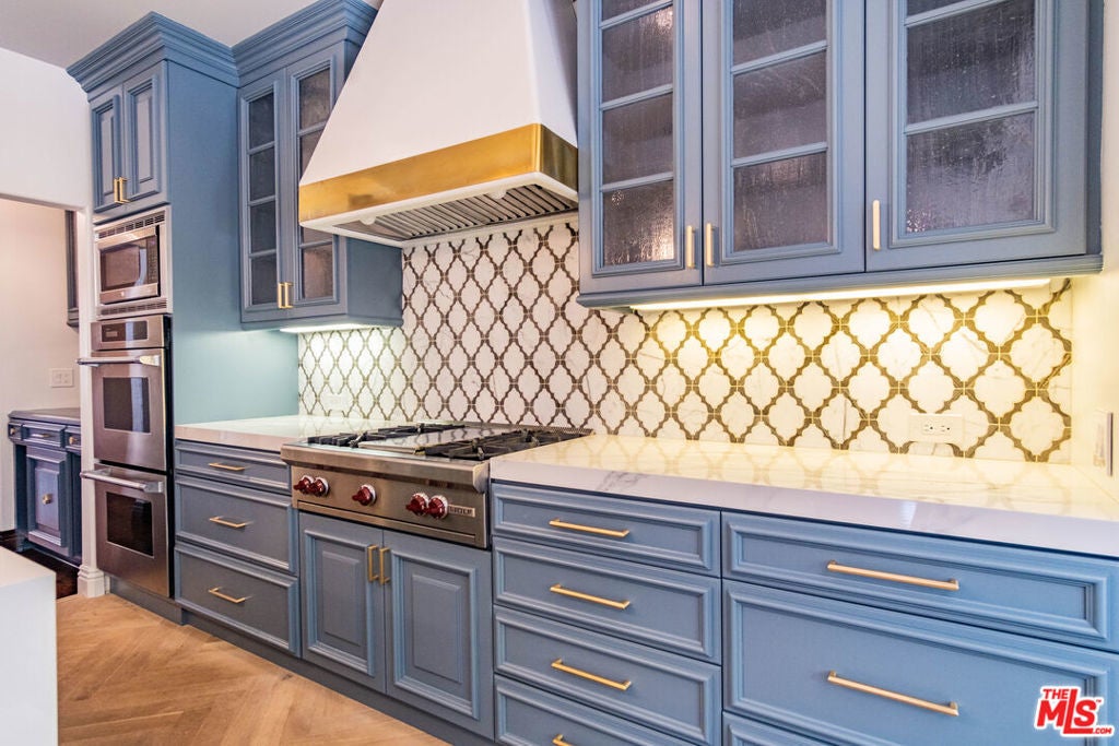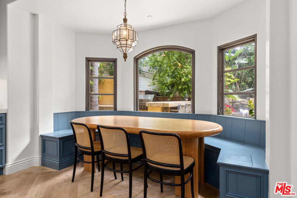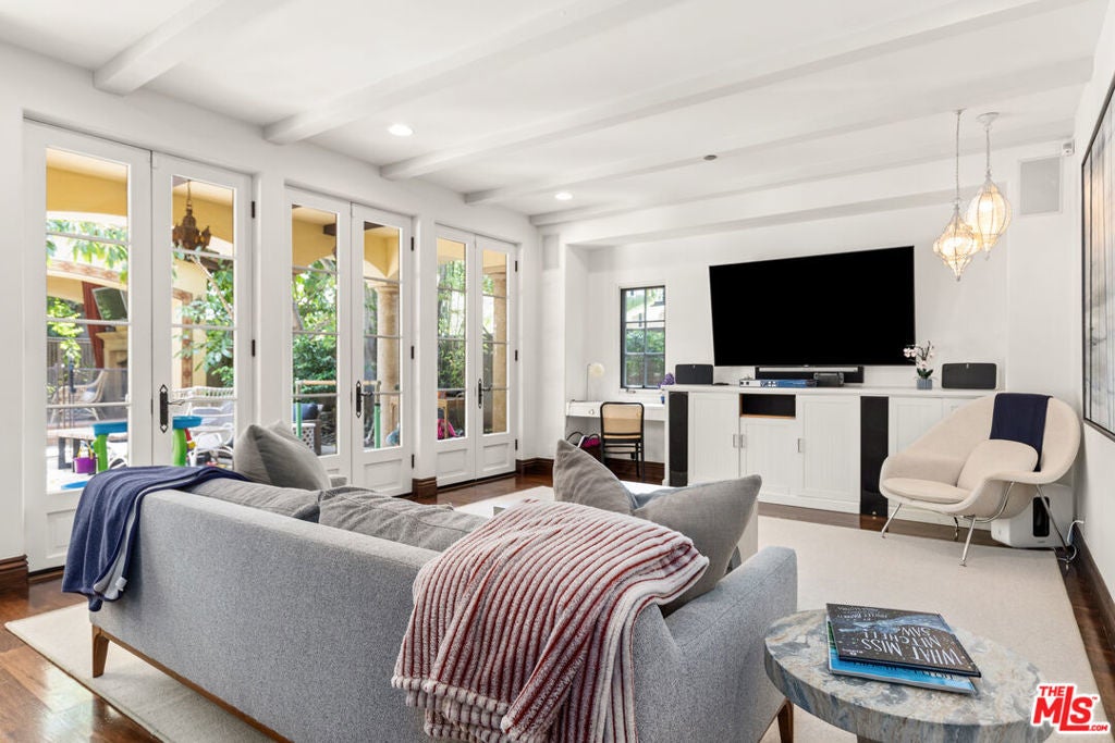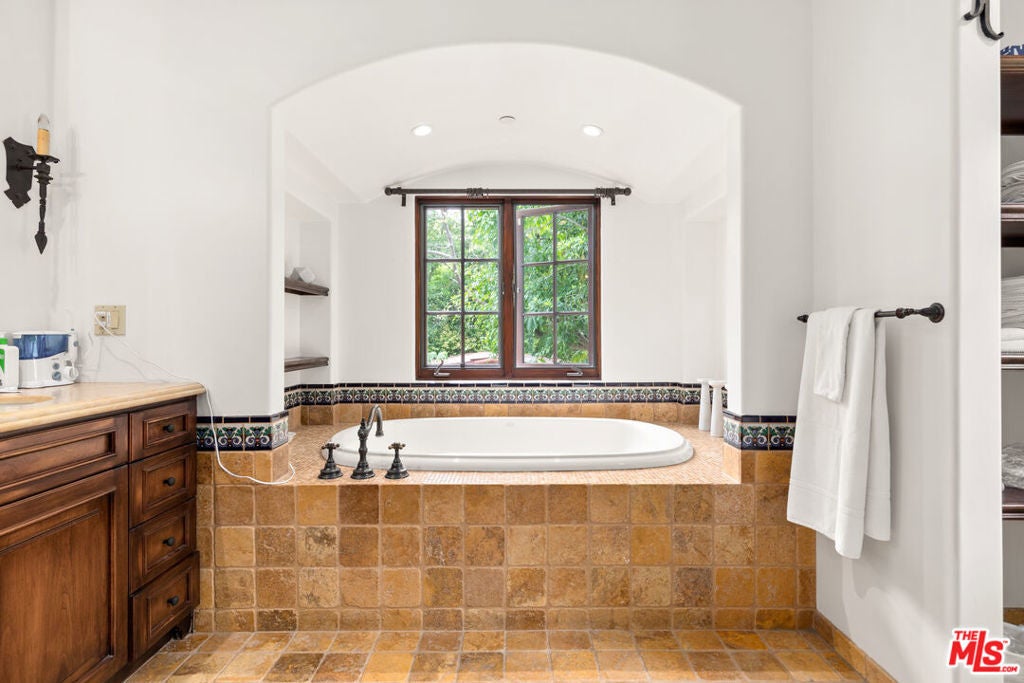 Located in the heart of Pacific Palisades, this chic custom designed Spanish-style luxury home awaits you. This spacious 4 bedroom (3 bedrooms upstairs, 1 downstairs) 3 bathroom abode offers you a spacious and remodeled open kitchen with top of the line appliances and a custom built-in breakfast nook. The Spanish modernized design includes beamed ceilings, leaded stained glass window, cast stone fireplace, forged iron work, and sophisticated lighting fixtures throughout. Off the kitchen which is adjoining to the living room, is the resort like backyard which offers an extraordinary entertaining space. The pool wraps around the outdoor casita, which is complete with a fireplace, TV and outdoor dining/lounge area. There is an outdoor kitchen with Wolf BBQ and authentic Italian pizza oven, seating area, and fire pit. The two car garage has been converted into an additional room/ den or play area. Close proximity to the Caruso Village, designer shops, high-end dining and luxurious amenities that Caruso Village has to offer.