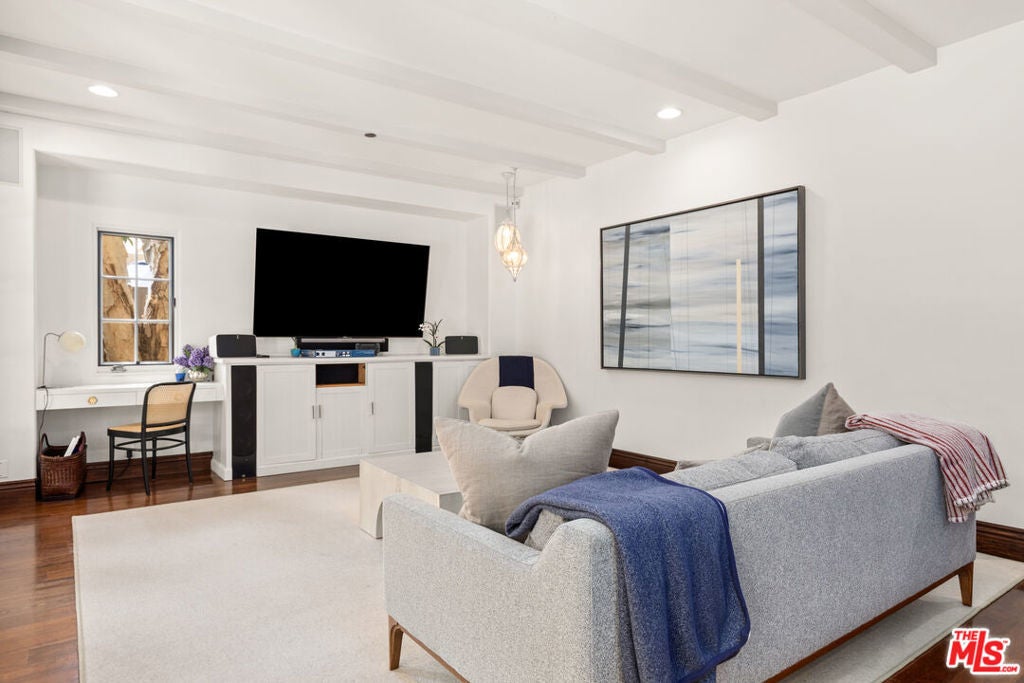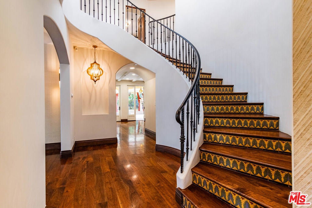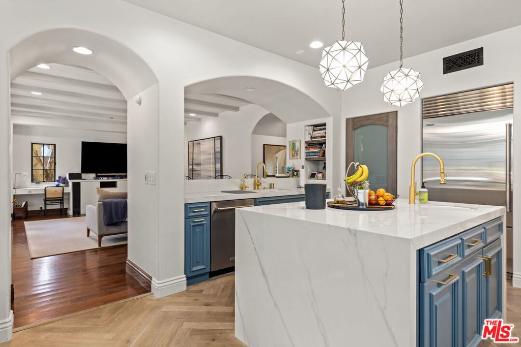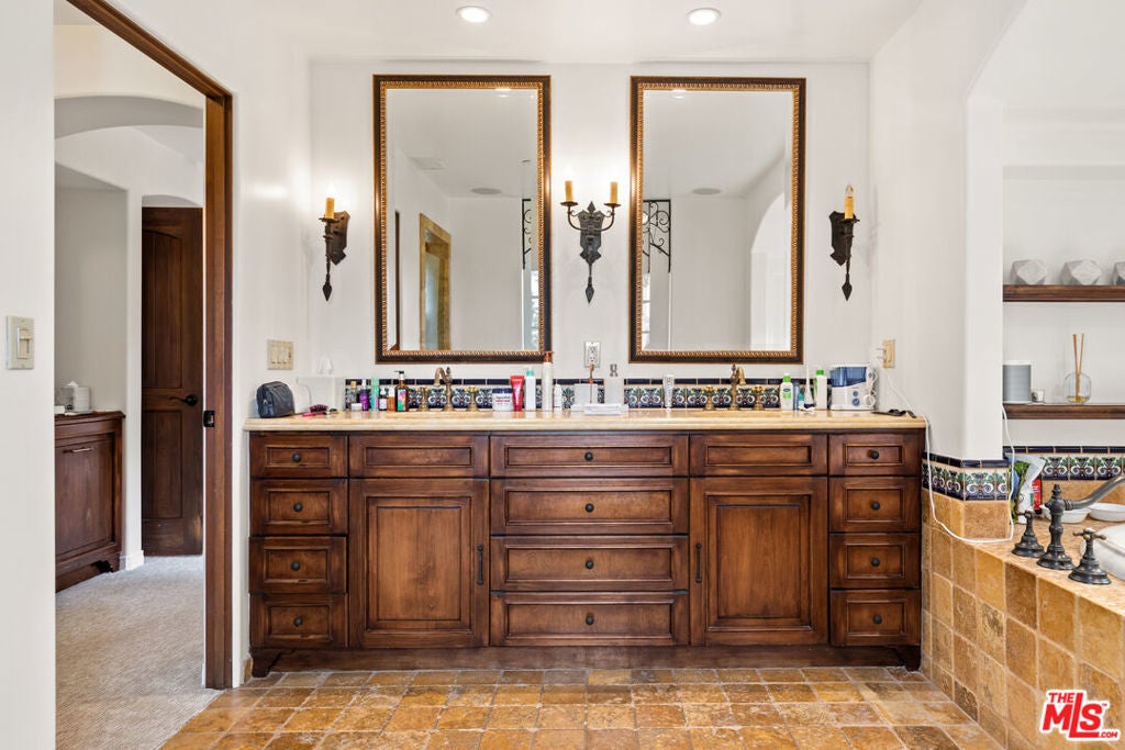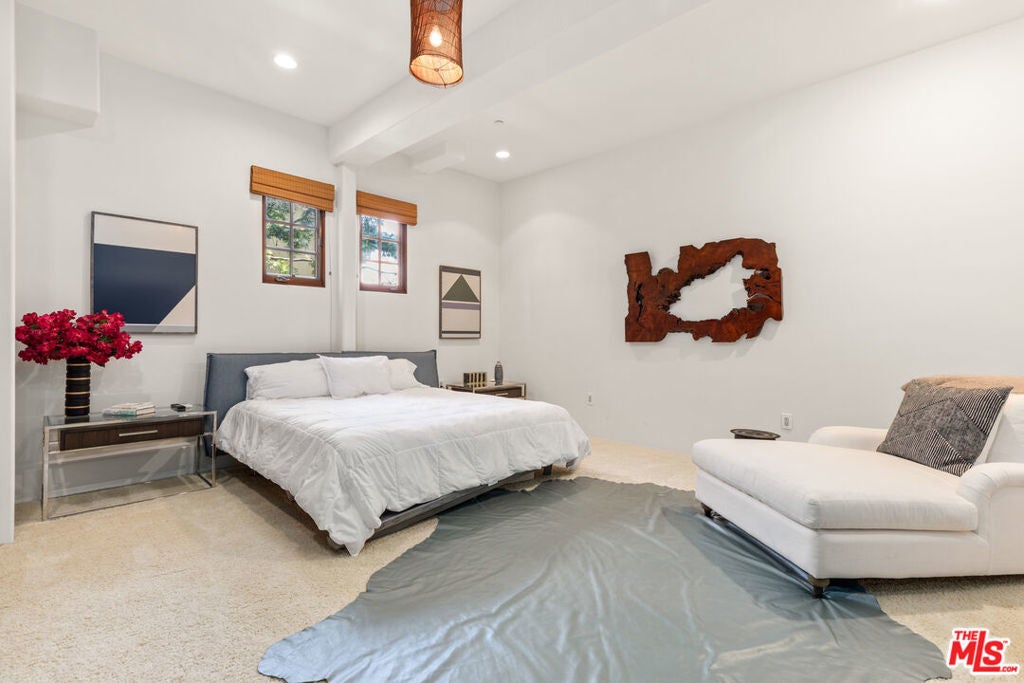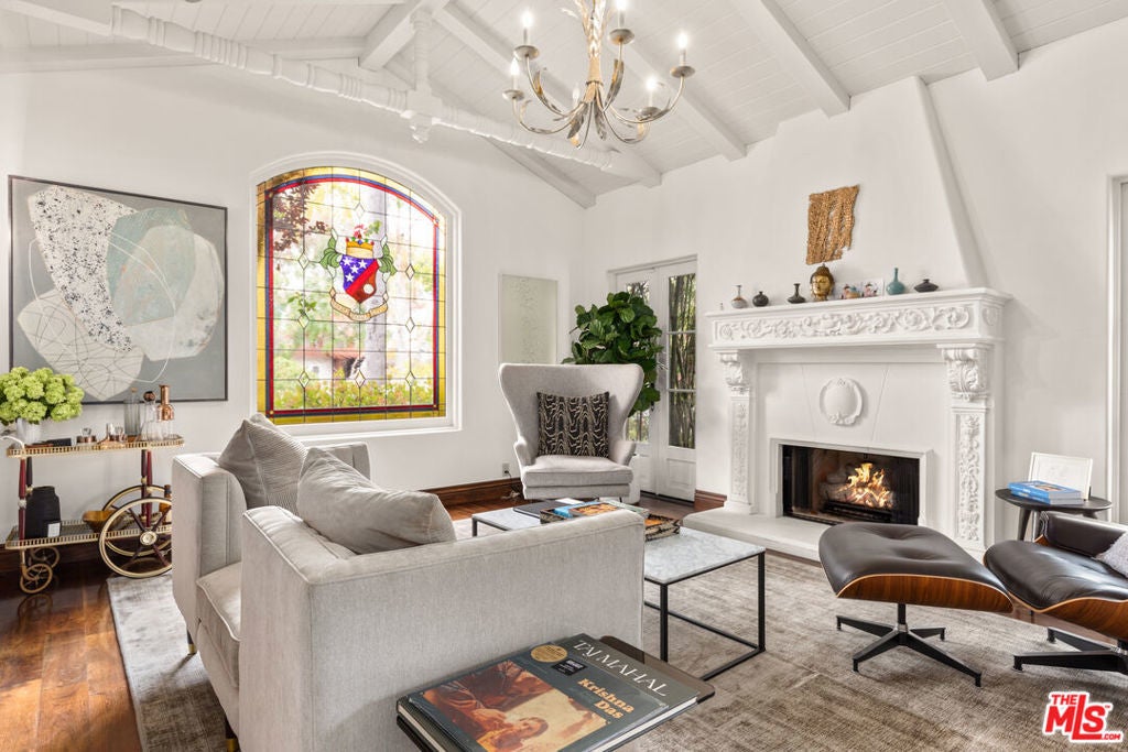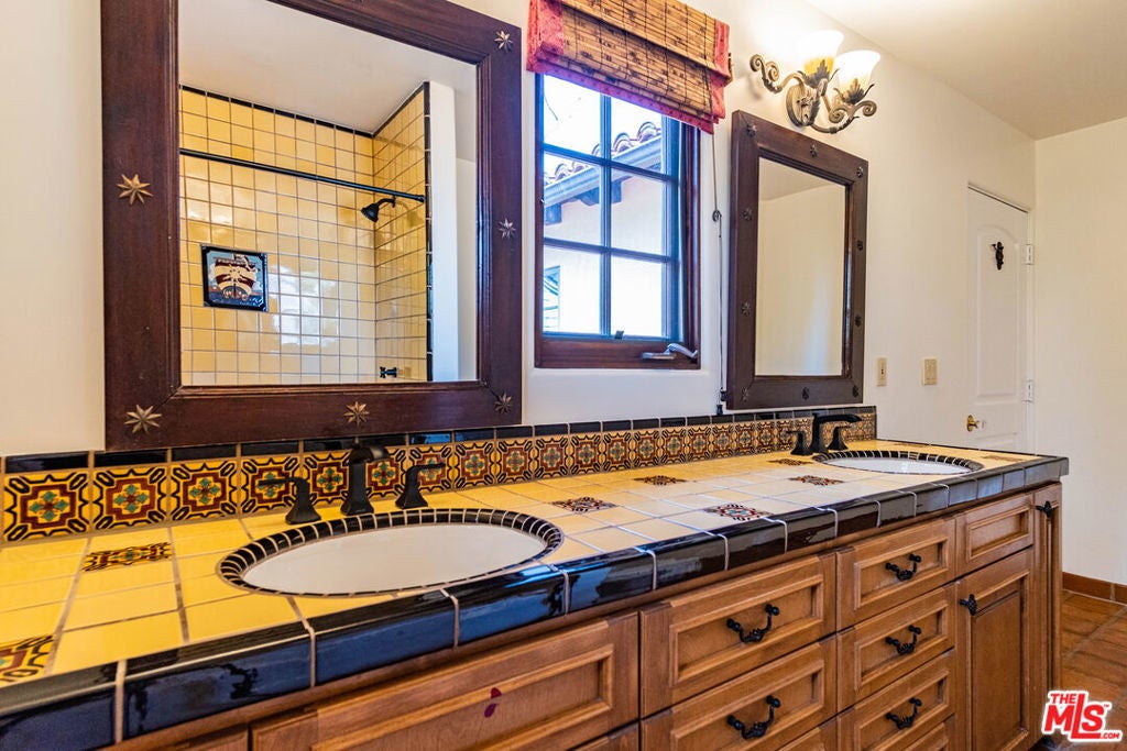 Located in the heart of Pacific Palisades, this chic custom designed Spanish-style luxury home awaits you. This spacious 4 bedroom (3 bedrooms upstairs, 1 downstairs) 3 bathroom abode offers you a spacious and remodeled open kitchen with top of the line appliances and a custom built-in breakfast nook. The Spanish modernized design includes beamed ceilings, leaded stained glass window, cast stone fireplace, forged iron work, and sophisticated lighting fixtures throughout. Off the kitchen which is adjoining to the living room, is the resort like backyard which offers an extraordinary entertaining space. The pool wraps around the outdoor casita, which is complete with a fireplace, TV and outdoor dining/lounge area. There is an outdoor kitchen with Wolf BBQ and authentic Italian pizza oven, seating area, and fire pit. The two car garage has been converted into an additional room/ den or play area. Close proximity to the Caruso Village, designer shops, high-end dining and luxurious amenities that Caruso Village has to offer.