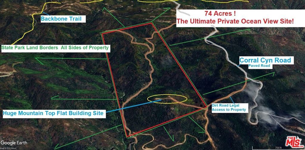 The Ultimate Malibu Mountain Retreat Site -74 Acres ! No One will ever be your neighbor with State Park Land bordering all sides of this property. Closest Neighbors large Retreat Site sold for over $10m. Incredible ocean and mountain views from the flat building site on this property . There is a maintained dirt road to the property off of Corral Canyon to this property offering easy and legal access . If you are looking for the last reasonably price huge estate site or mountain top Castle in Malibu where you are King and Queen of the Malibu Hills .. this is it!