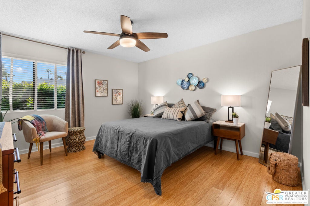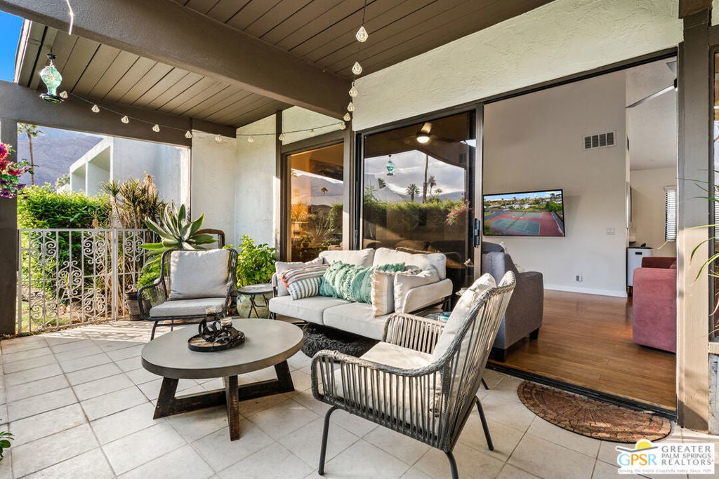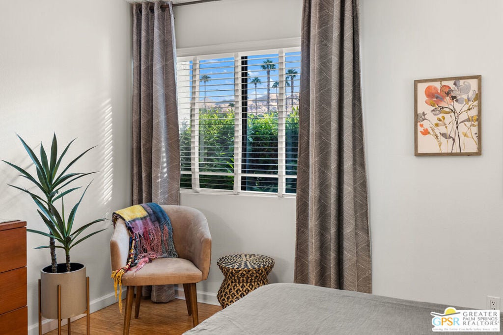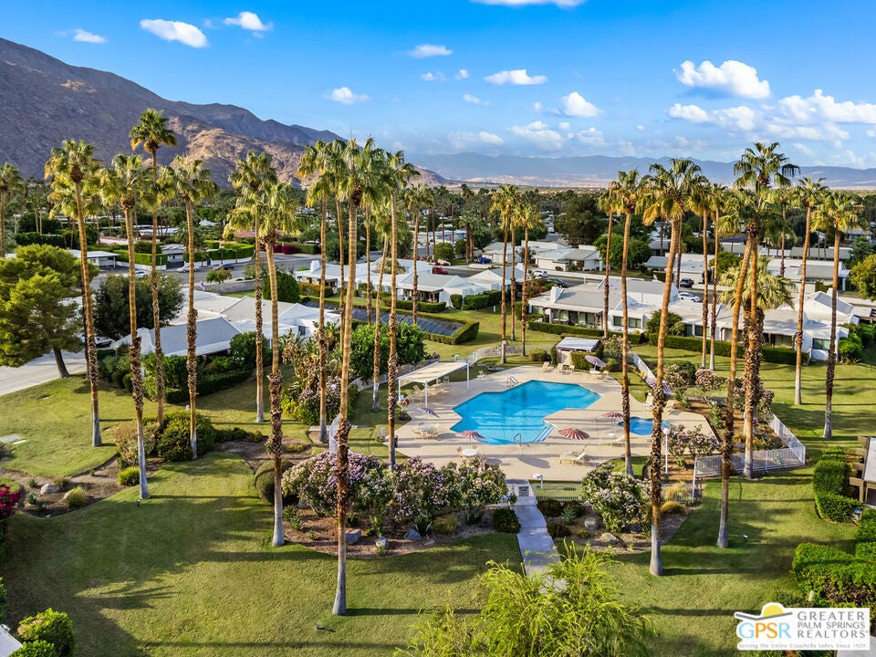Views Views Views! Please take a look at these beautiful mountains from East to South to West from your own spacious private patio, the living room, the dining area and both bedrooms ! Hugh Kaptur was the architect. Amazing opportunity to own this single level end unit on Indian Lease Land expiring in 2036 with a proposal on the table to extend it to 2070 or even 2090. A 1200 sq ft two-bedroom two-bathroom condominium located in South Palm Springs in the center of Casa Sonora with a detached enclosed one car garage and gorgeous community pool and hot tub area, pickle ball, tennis courts and dog park! Wonderful HOA maintained green belts, many mature fruit trees, lots of overflow parking, and the minimum rental period is 30 days.