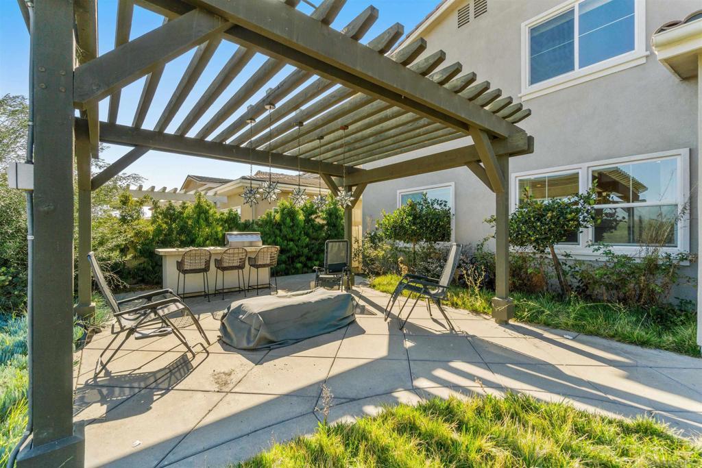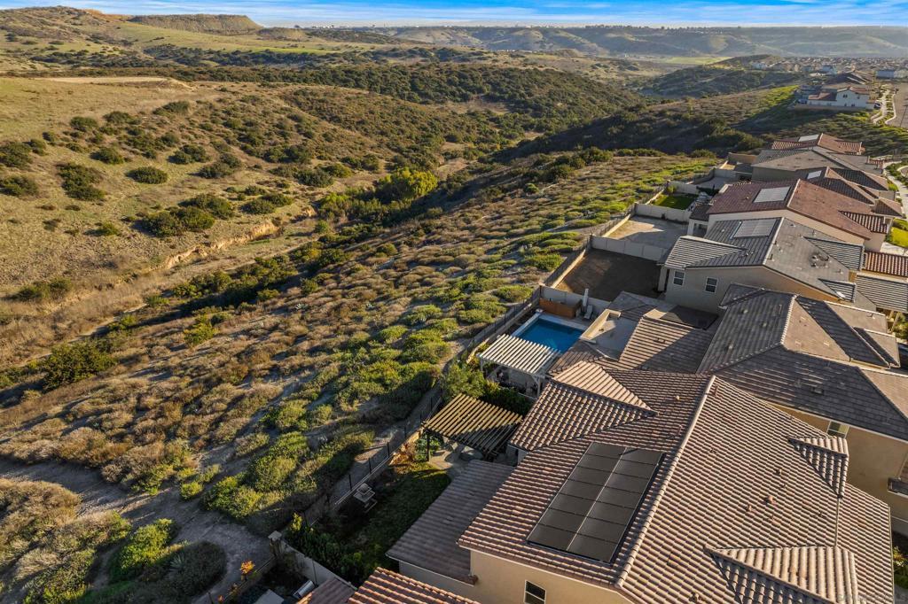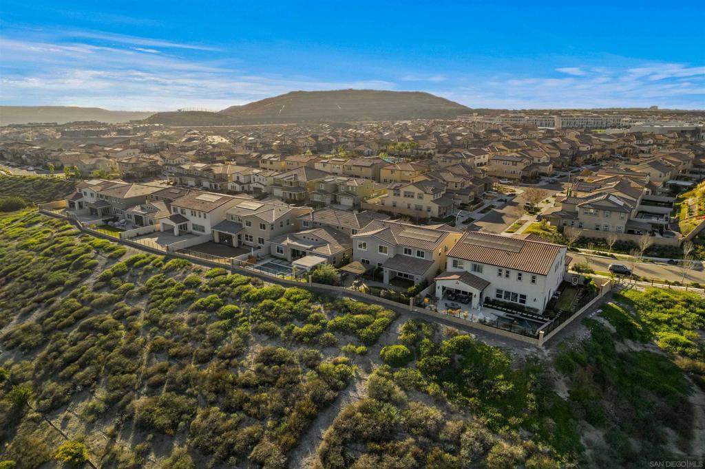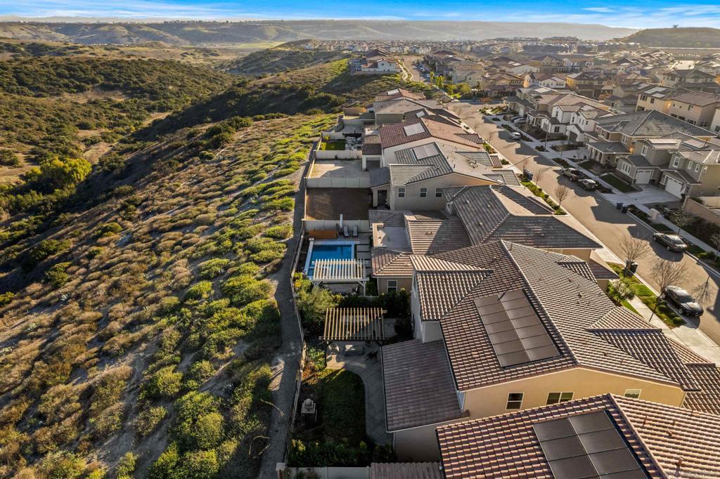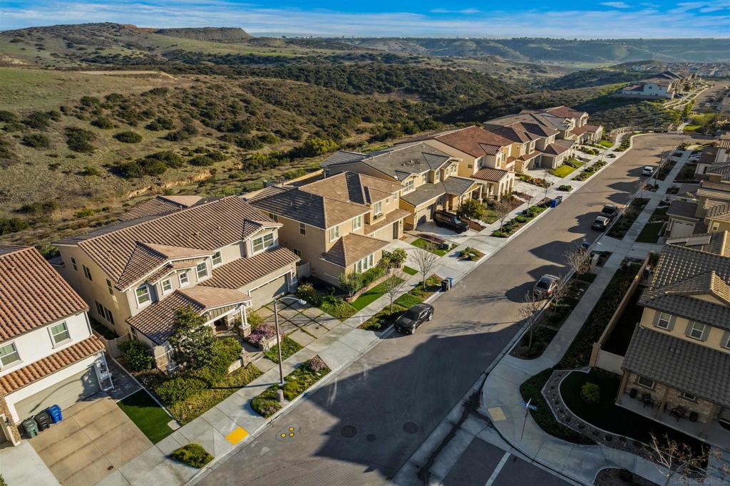 Discover luxurious living at Bella Sitia an exclusive coveted Montecito Community of Otay Ranch. This exquisite previous Model Home is move-in ready with PAID SOLAR & FULL Bed/ Bath Downstairs. This 5 bed/4.5 bath home showcases stunning architectural craftsmanship designed for those who love to entertain. Greet each day with breathtaking unobstructed canyon views experiencing serene sunrises & enchanting sunsets from your spacious California room seamlessly merging indoor elegance with outdoor charm. Inside exceptional attention to detail includes rich hardwood flooring, custom crown molding, an elegant curved staircase & beautifully crafted wood ceilings. The open-concept design features a gourmet kitchen with crisp white shaker cabinets, gleaming quartz countertops, a chic backsplash, modern pendant lights & a large center island ideal for culinary enthusiasts. Premium appliances, including double ovens, built-in microwave & cooktop, complement the abundant cabinetry & spacious walk-in pantry. Retreat upstairs to your luxurious primary suite highlighted by spectacular canyon vistas, integrated audio speakers, a cozy retreat area & a spa-inspired bathroom featuring dual sinks, marble floors, separate tub, custom-tiled shower & an expansive walk-in closet. Additional comforts large 2nd bedrooms some with private baths, a tech center, spacious laundry room with cabinetry & sink, 3 car garage. The landscaped backyard offers the perfect setting for gatherings, complete with a custom concrete patio, covered outdoor entertaining space, built-in BBQ & bar. As part of the Montecito Community residents enjoy exclusive amenities such as a resort-style clubhouse, sparkling pool and spa, recreation center, and proximity to top-rated schools & delightful restaurants. Bella Sitia isn’t just a place to live it’s your forever dream home. Call us today & experience this masterpiece firsthand!