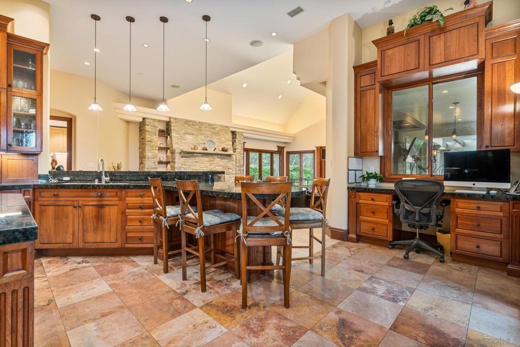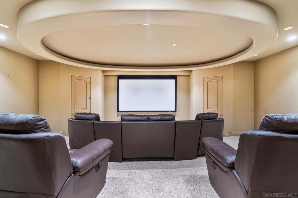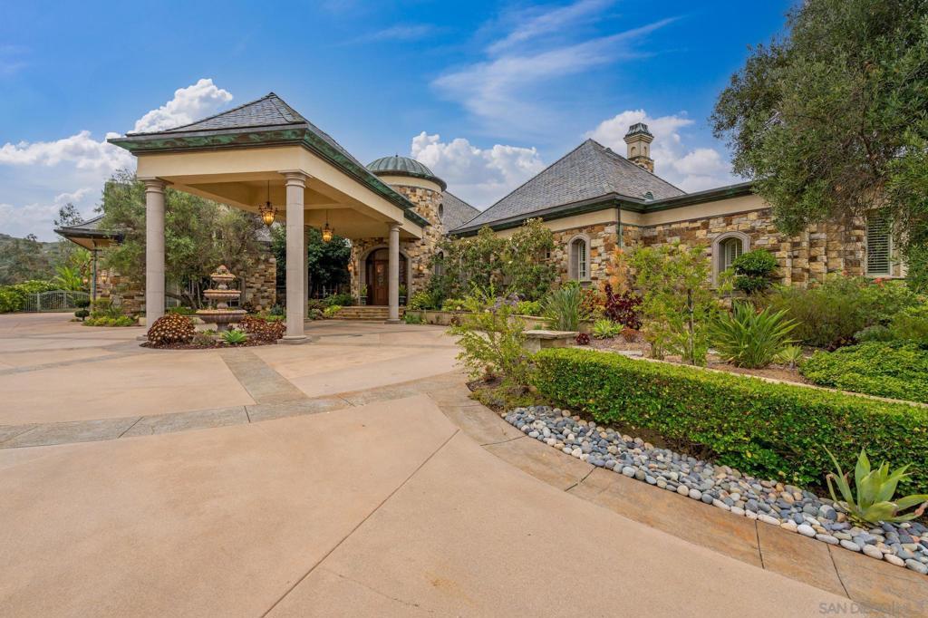 Experience the pinnacle of luxury living at 14380 Ciera Court, a Tuscan masterpiece perched on an elevated cul-de-sac lot in Poway’s prestigious guard-gated community, The Heritage. Crafted with sophistication and designed for both grand entertaining and intimate everyday living, this custom estate spans approximately 11,744 sq ft on a serene lot with panoramic views. The architectural design showcases classic tuscan elements—a stucco exterior, slate-tiled roof, and grand arched entryways—while soaring ceilings and expansive windows flood the interior with natural light. An open-concept layout highlights a chef’s kitchen with oversized island, seamlessly flowing into spacious living and formal dining areas. On the main level, the primary suite serves as a private retreat, featuring a spa-like bathroom and dual walk-in closets. Upstairs, three generous en-suite bedrooms with walk-in closets surround a versatile bonus loft—ideal as a study area, teen lounge, or additional family gathering space. A private attached casita offers the perfect space for guests or multigenerational living. A true rarity in The Heritage, is the expansive finished basement adding a new dimension of living: enjoy your own private movie theater, game lounge, wet bar, and wide-open space perfect for large-scale entertaining. Step into resort-style outdoor living with a vanishing-edge pool, spa, outdoor kitchen, covered loggia with fireplace, and lush landscaping—framed by sweeping views.