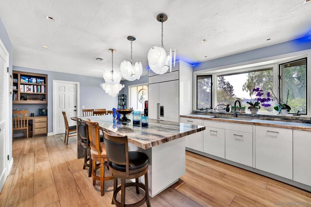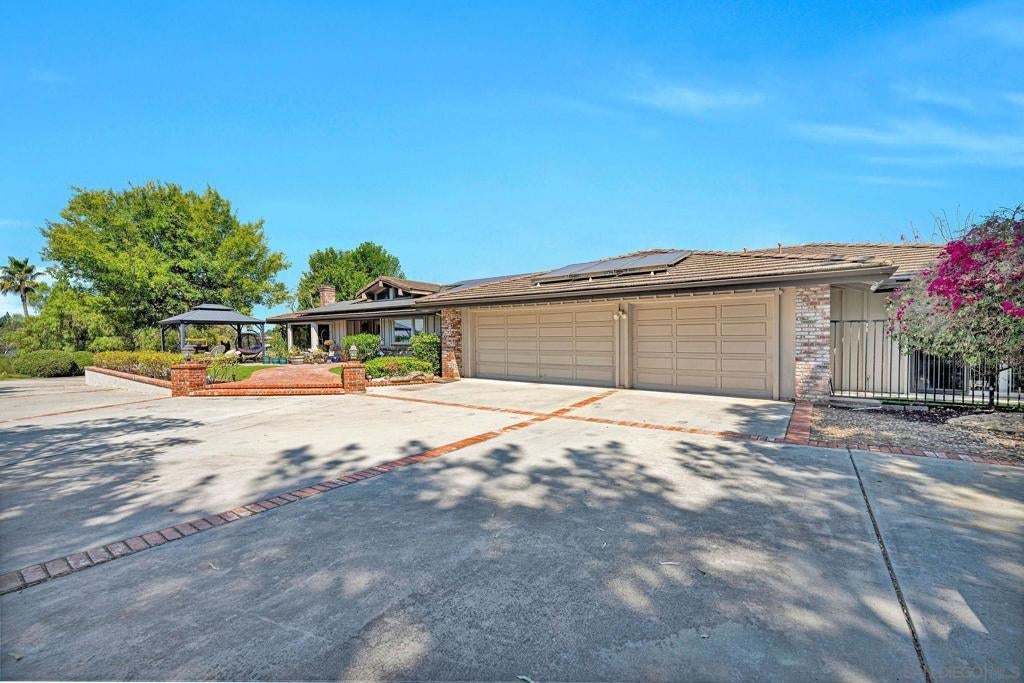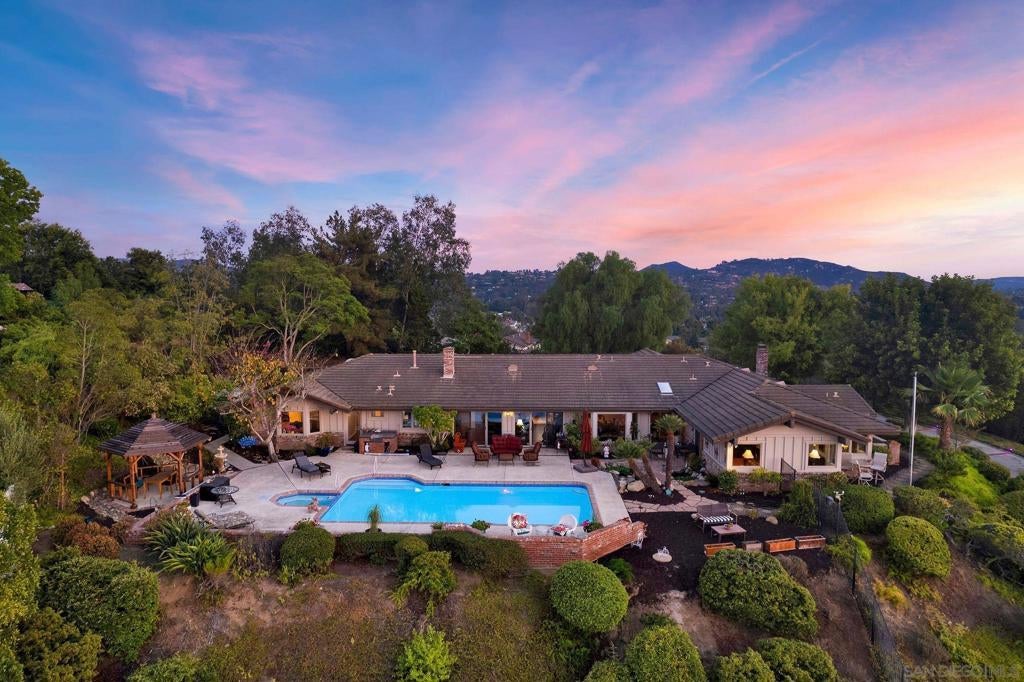 Perched atop a private Poway mountaintop on just over one acre, this 3,750 sq. ft. single-level residence captures 270° panoramic views of mountains, valleys, and twinkling evening lights. Designed for both serene living and sophisticated entertaining, the home offers four bedrooms, 3.5 baths, and a thoughtful split-bedroom layout for privacy. The remodeled chef’s kitchen features Wolf appliances, a $20K Sub-Zero refrigerator, a six-burner gas range with pot filler, dual ovens, a convection microwave, a warming drawer, a workstation sink, and Brazilian stone counters with a waterfall edge. Soft-close European cabinets, custom lighting design, and generous storage elevate the space. Expansive living areas showcase exposed-beam ceilings, two wood-burning gas fireplaces, and seamless flow to outdoor spaces. The primary suite offers a private retreat, five view-filled windows, and direct access to koi ponds and tranquil gardens. Resort-style grounds include a large pool and spa with colored lights, a volleyball setup, a redwood gazebo, a koi pond with a waterfall, orange and grapefruit trees, walking paths, and multiple vantage points for breathtaking sunsets. The three-car garage with a partial workshop, a wide driveway, and ample storage completes the package. Located minutes from top-rated schools, local wineries, and convenient amenities, this property blends privacy, prestige, and the quintessential Southern California indoor-outdoor lifestyle. ****SEE THE MATTERPORT TOUR HERE ON THE MLS! SELLER STATES THE FOLLOWING HOME IMPROVEMENTS: Over $300 K in upgrades $150 K Custom Kitchen $ 60 K flooring Hardwood carpet and ceramic tile in Master bath (had dirty white carpet) long tiles. $ 27K landscaping, painters handyman window washers (labor plus six big urns). $10K front gazebo, pavers and artifial grass $ 7 K retiling pool and spa / $4k heater $14 K long, extra deep lattice fencing $ 15 K back gazebo $ 1,500 chandilier enteryway $ 2,300 bidet smart toilet and seat in master $ 2 K Hunter blinds $ 2 K colored in front room and inset lights in master $ 3 K wired in security camera (3 outside, 3 inside) $ 2 K outside collored lights and labor $ 3 K plants and bushes and trees $ 1 K new smart thermostat