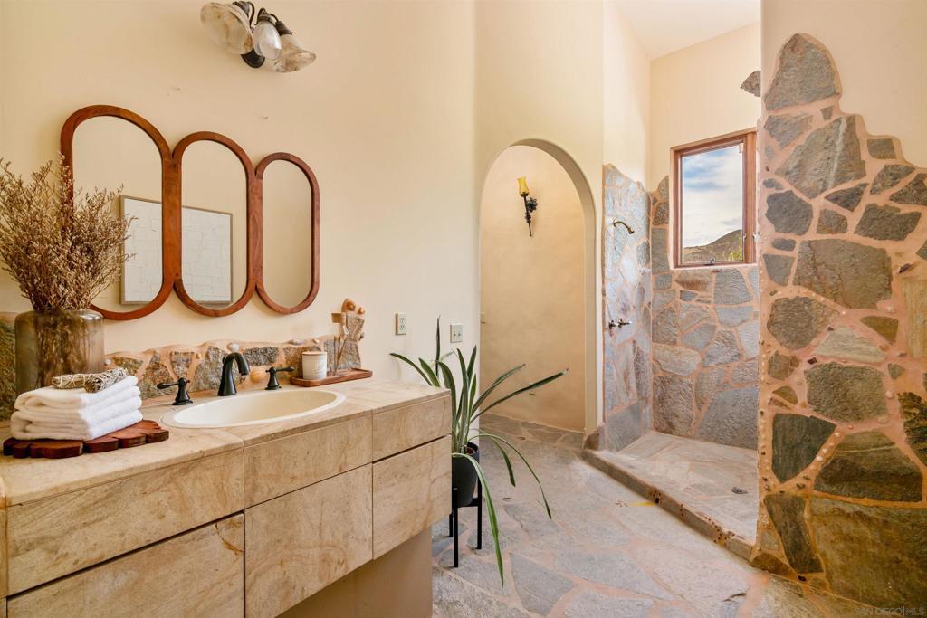 Perched high on Alta Loma Drive in eastern San Diego County, The Boulder House is a forward-thinking green home and a rare creation by Hubbell & Hubbell, the acclaimed father-and-son team of the late celebrated artist James Hubbell and his son, architect Drew Hubbell. Recognized with architectural honors and featured in multiple publications, including The Los Angeles Times, this residence stands as both a work of art and a pioneering model of sustainable living. Blending artistry with innovation, the home features new ceramic tile floors, custom tile work, vaulted ceilings, and arched windows that flood the open layout with natural light. At its heart, the residence is literally built around a 14-foot natural boulder, a dramatic centerpiece in the great room that cools and humidifies in summer and radiates warmth in winter. Above, a central tower fan enhances airflow, drawing heat up and out in warmer months and recirculating warmth in cooler seasons. Roof overhangs and arched arcades minimize solar gain while honoring California’s historic mission style. Super-insulated straw bale walls act like a thermos, keeping interiors comfortable year-round while exceeding California’s Title 24 standards by 41 percent. Recent upgrades include a newly re-plastered pool, freshly recoated exterior limestone, a new high-efficiency tankless water heater, new water softener, new well pump and renewed septic. Privately set against protected land and a wildlife sanctuary, the property offers unmatched seclusion, sweeping mountain views, and timeless architectural design.