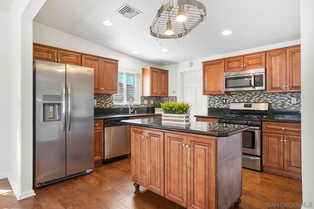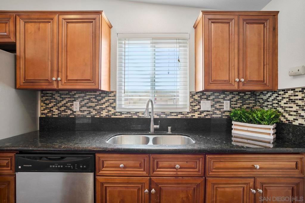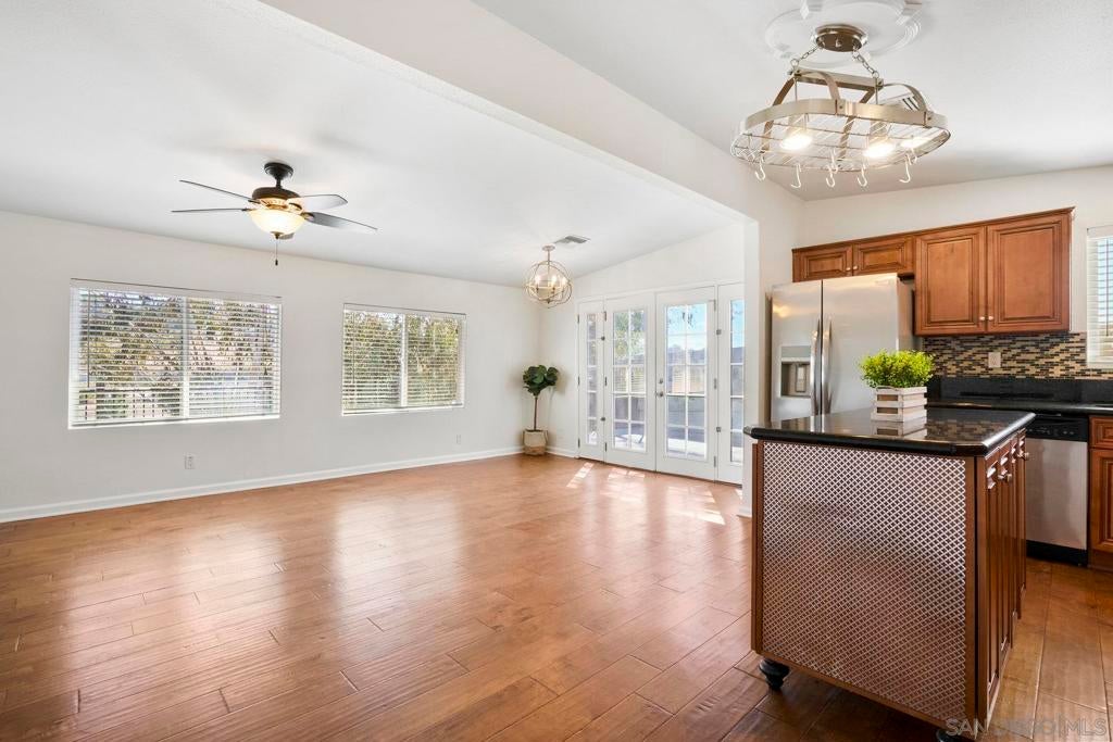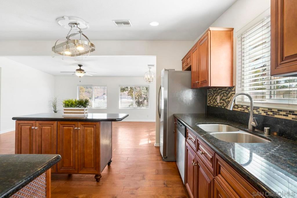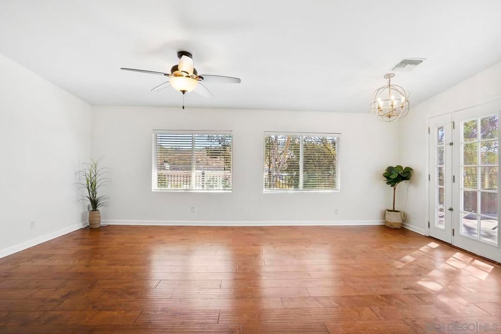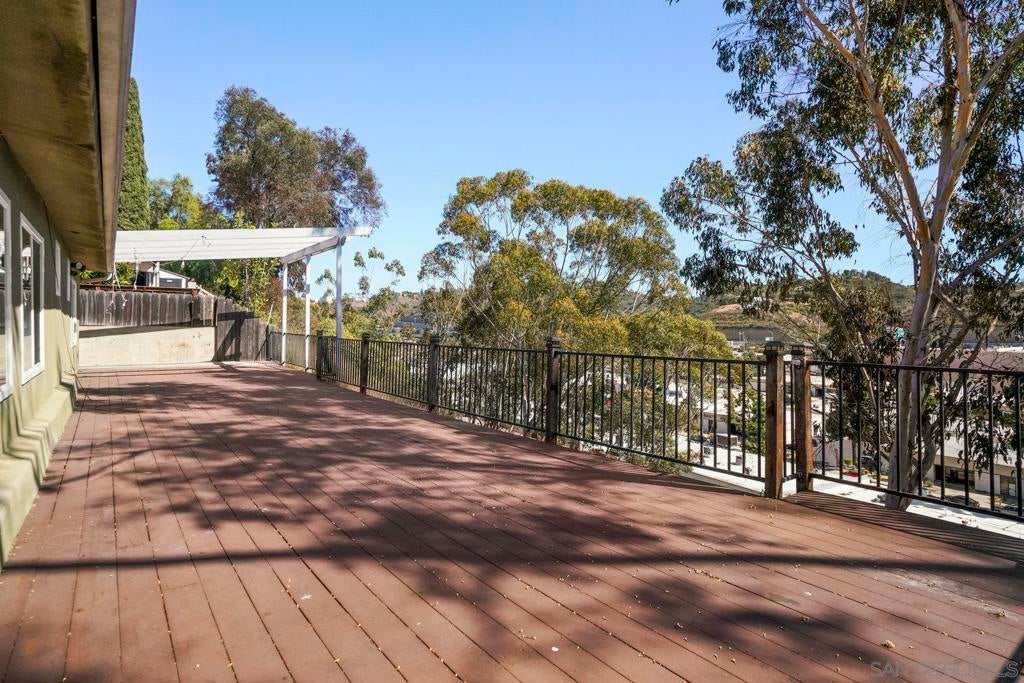 This spacious single level home offers 4 bedrooms and 3 bathrooms, combining comfort and convenience in a central San Diego location. Step inside to an open floor plan filled with natural light, featuring large windows, wood style flooring, and French doors that lead out to a private patio and large deck, perfect for indoor/outdoor living. The kitchen is designed for both everyday living and entertaining, complete with granite countertops, a stylish backsplash, stainless steel appliances, and a movable island for added flexibility. The primary bedroom provides everyday comfort with plenty of natural light, while three additional bedrooms give you plenty of space for family, guests, or a home office. Outside, enjoy a low-maintenance yard, shade sails, and a large deck overlooking the canyon with treetop views.This home also comes equipped with paid-off solar panels, offering potential savings on your electric bill. Conveniently located near freeways, schools, shopping, and dining. This home offers a great opportunity to own in San Diego.