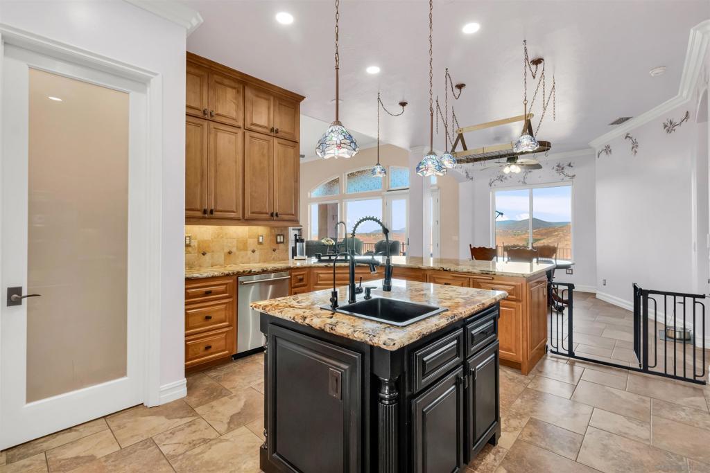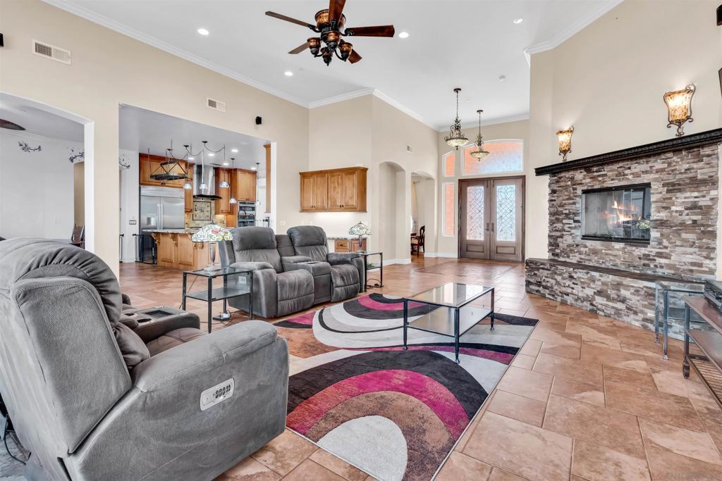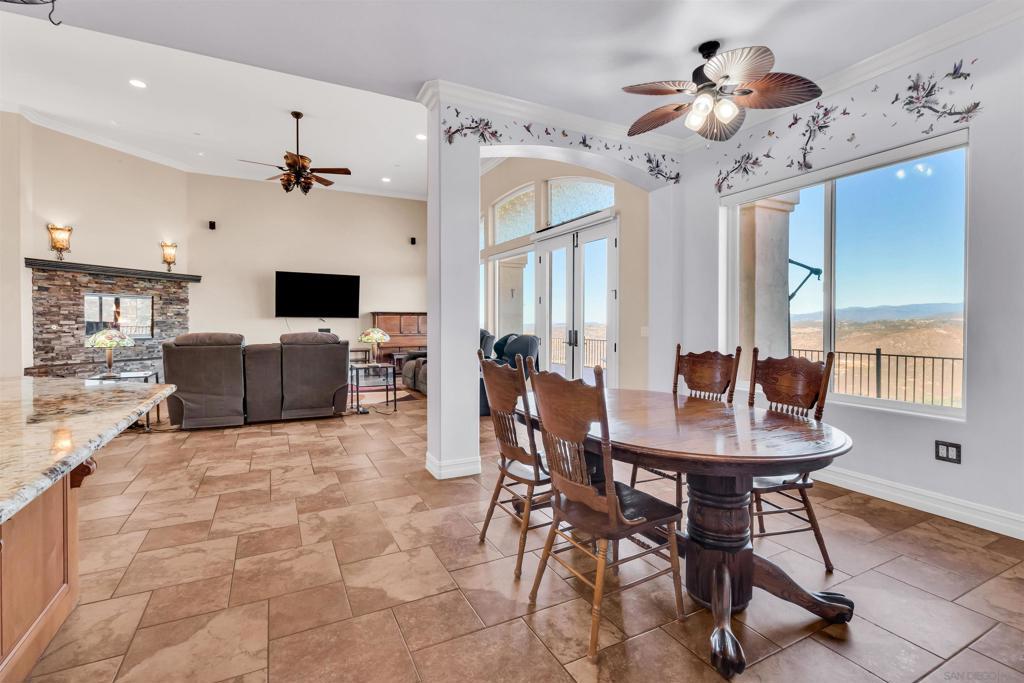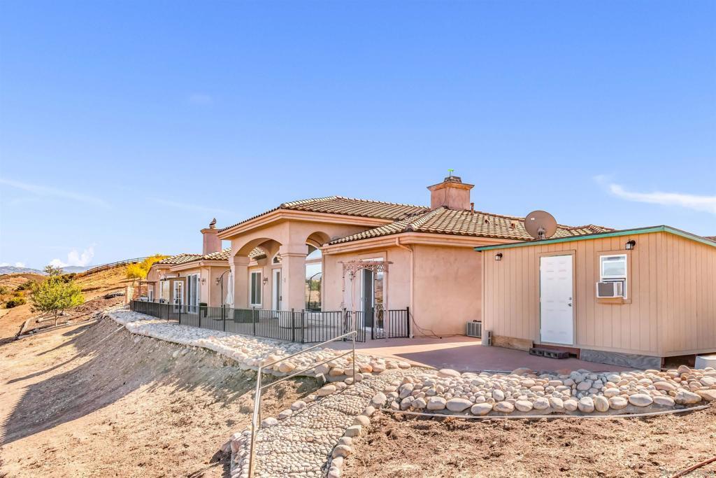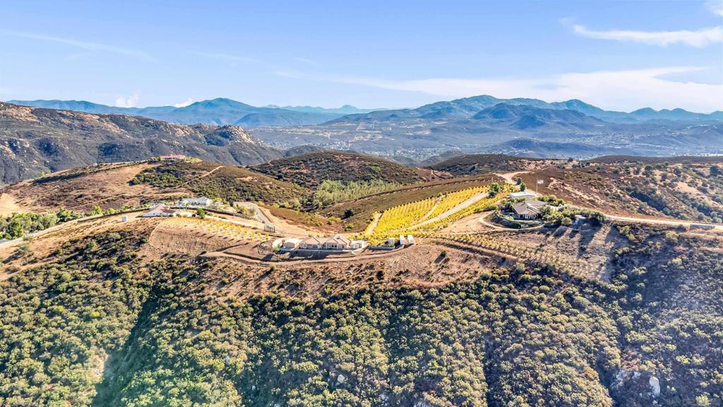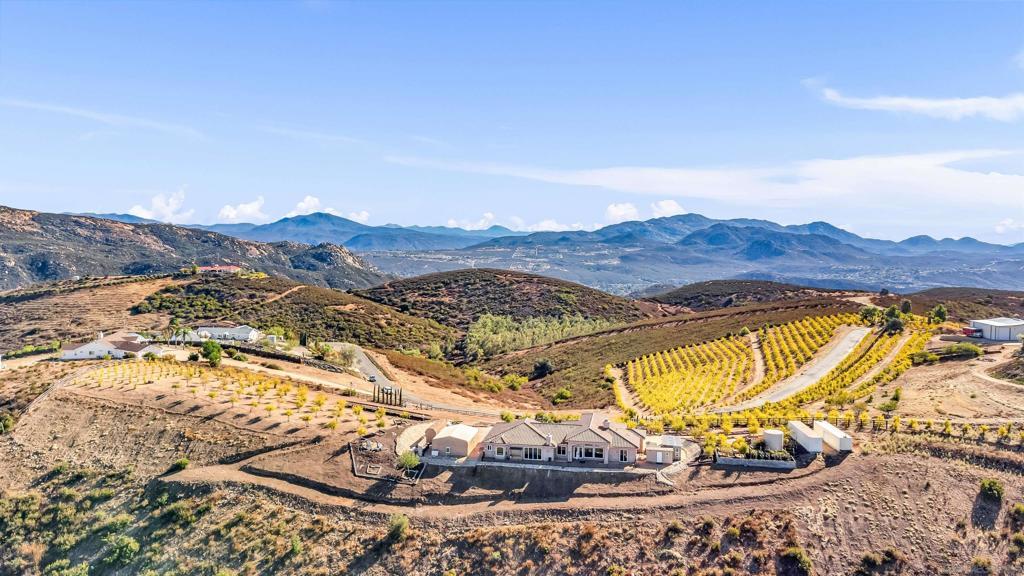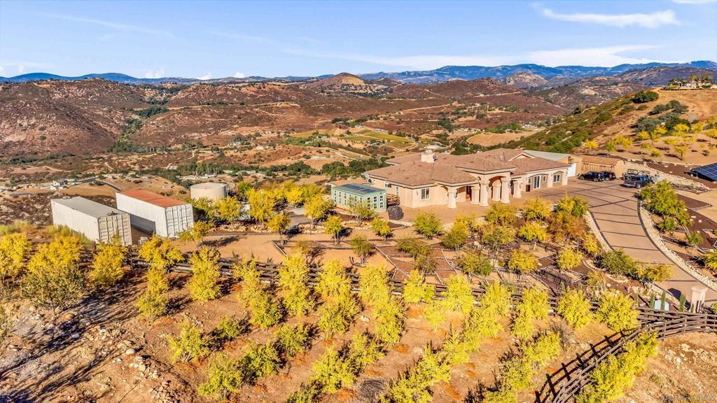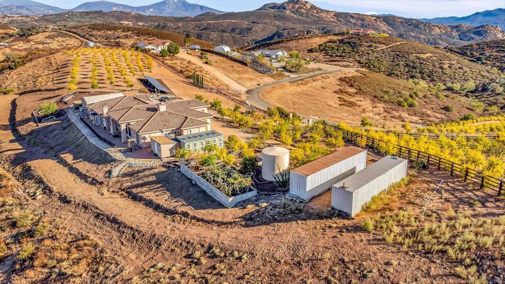 Experience true off-grid luxury on 12.8 acres of breathtaking landscape with panoramic views of mountains and valleys. This 3,212 sq. ft. estate offers complete self-sufficiency with a 14KW solar system with 56 panels, two Tesla Powerwalls, a Generac generator, a 600 ft+ deep private well producing 70 GPM, an 8,500-gallon water tank, whole-house filtration, tankless water heater, and RV hookups with a 50-amp connection. Designed for comfort as well as independence, the home features soaring 10–16 ft. ceilings, crown molding, and an open floor plan filled with natural light. The chef’s kitchen includes brand-new stainless steel appliances installed in August 2024, granite countertops, a pot-filler, and a walk-in pantry. The spacious living room has a gas fireplace and remote blinds, opening seamlessly to the dining area. The primary suite offers a private retreat with a fireplace, dual walk-in closets, spa bath with jetted tub, and oversized shower. Three additional bedrooms include a private guest suite with full bath and separate entrance. A 950 sq. ft. converted garage provides flexible space for a gym, studio, or recreation room. Outdoor living includes 170 mature pomegranate trees, a 12x24 greenhouse, automated irrigation, a detached 24x30 garage, two 50-ft cargo containers, and a workshop with a half bath. With over $140,000 in recent upgrades, this rare estate blends modern luxury with complete sustainability, offering a private sanctuary unlike any other in San Diego County.