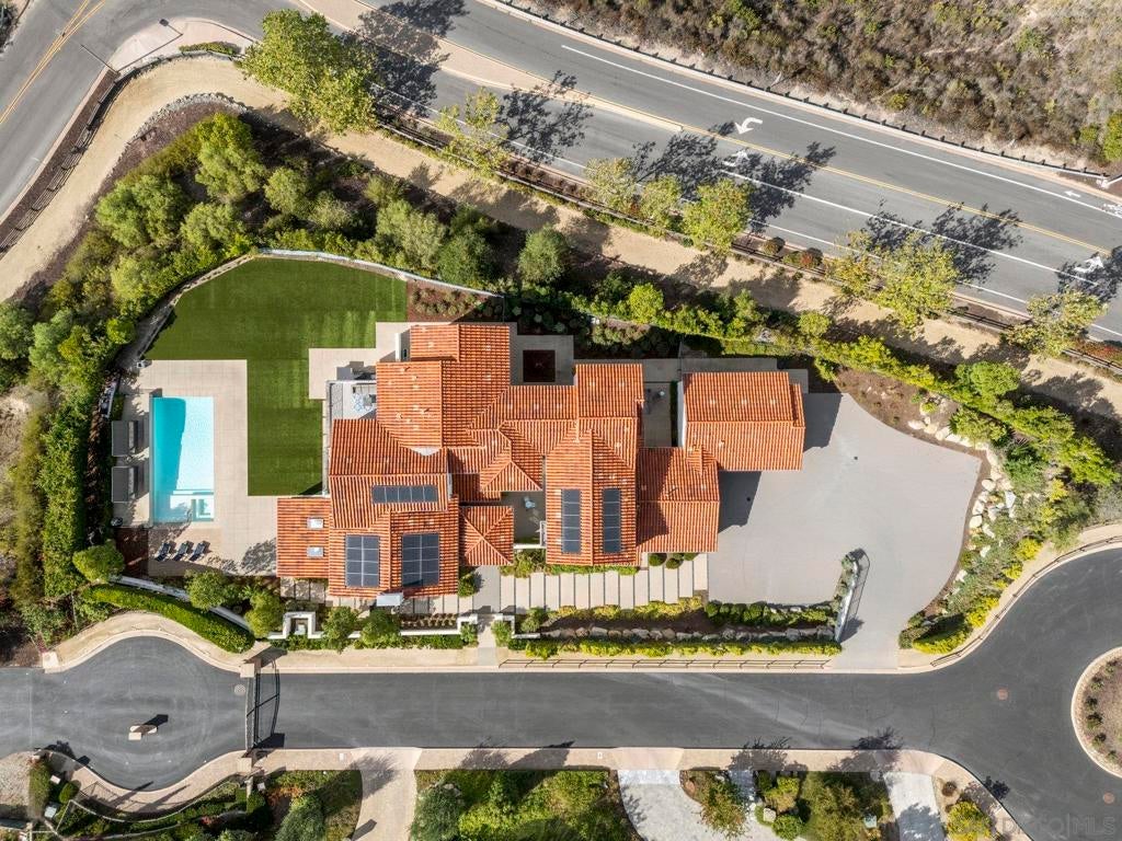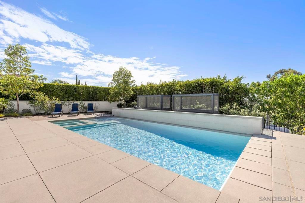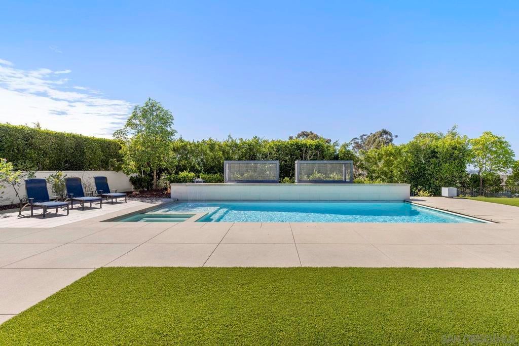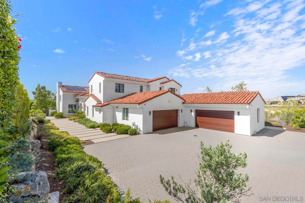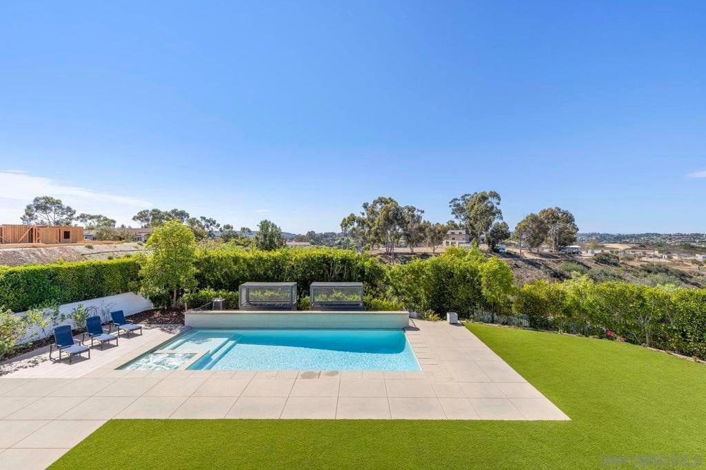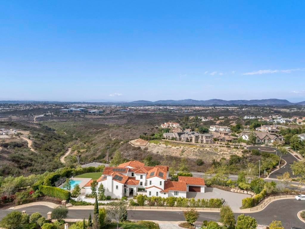 This spectacular Spanish Contemporary estate offers 7,016 SF of modern luxury on nearly an acre in the gated enclave of The Ridge Estates in Del Mar Mesa. Thoughtfully designed with extraordinary attention to detail, the home features 5 spacious ensuite bedrooms plus an office with full bath (optional 6th bedroom). A seamless blend of modern design and eco-conscious materials creates a sophisticated yet comfortable retreat. Floor-to-ceiling cantina doors open to true indoor-outdoor living: a covered loggia, sparkling pool, expansive turf play area, outdoor kitchen, and privacy hedges. The chef’s kitchen boasts Thermador appliances, dual islands, and a walk-in pantry. The primary suite offers a spa-inspired bathroom, elegant custom closet system, sleek fireplace, and private deck with 180° panoramic northern and westerly views. Additional highlights include rooftop solar, a 4-car garage with epoxy floors and abundant storage, soaring ceilings, oversized hallways, and designer finishes throughout. Nestled among Del Mar Mesa’s rolling landscapes yet just minutes from shopping, dining, and freeway access, this rare estate combines elegance, privacy, and breathtaking views—defining luxury living in North County San Diego.