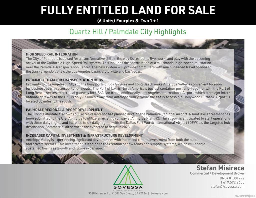 An opportunity to acquire 0.25 Acres of Multifamily Land permitted for 6 Units a contemporary four unit, 2 story townhouse (Fourplex) and a separate (ADU) of 2 One Bedroom units totaling 8,440 Rentable SF. Located in the heart of Quartz Hill a Desirable Rental Market just one hour away from Los Angeles metro. Renters select the Antelope Valley to find some of the most affordable housing in L.A area.