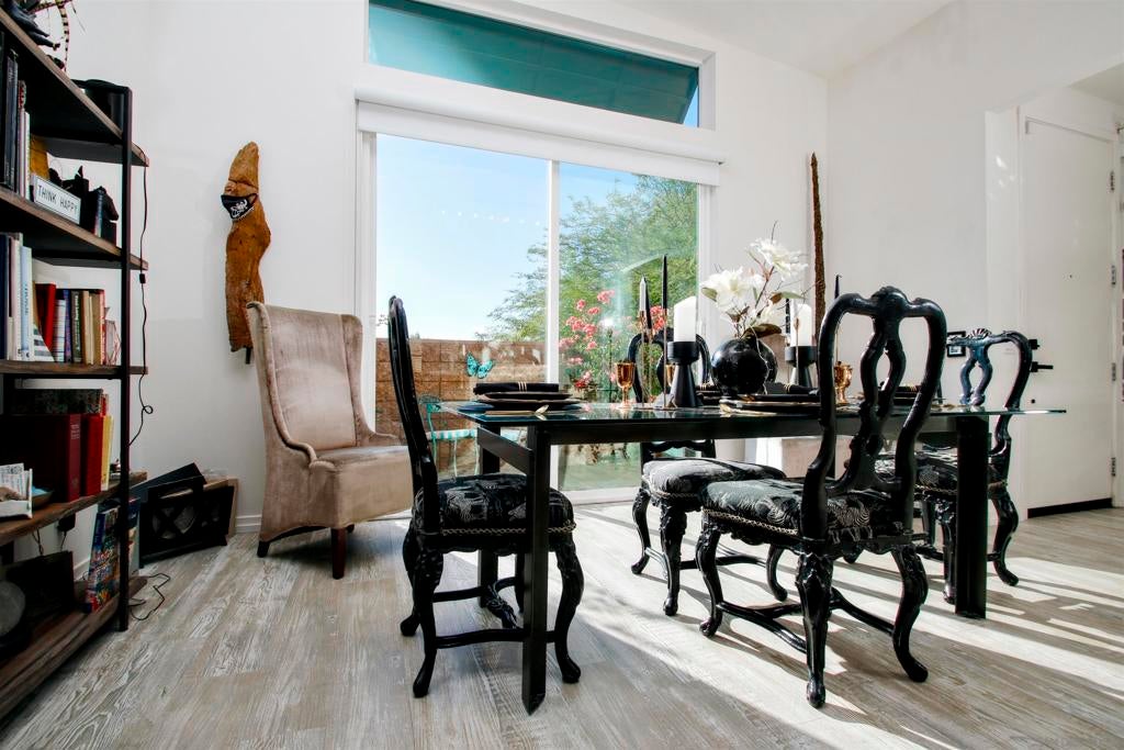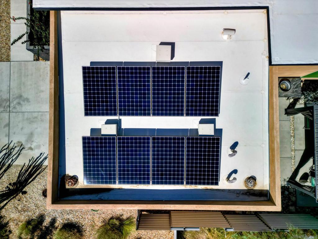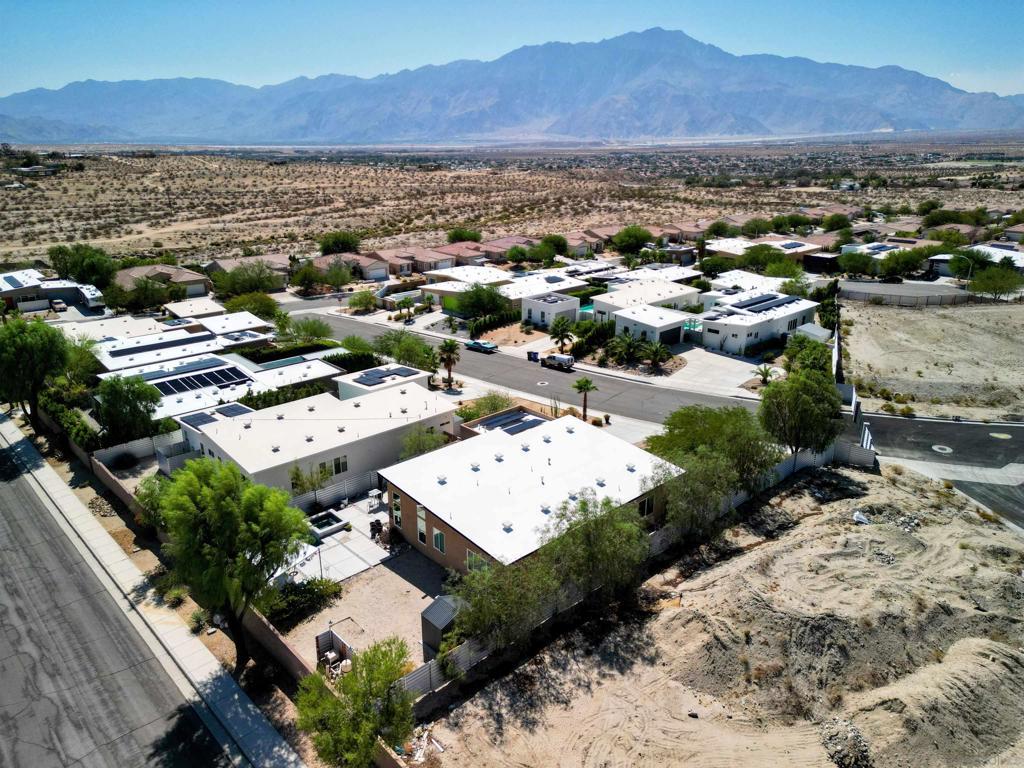 Eligible for VA ($0 down), FHA, Conventional, USDA (0% down), and the down payment assistance program CalHFA. Perched on an elevated lot at the end of a quiet cul-de-sac, this modern mid-century home showcases breathtaking mountain panoramas and some of the best views in the neighborhood. Located near the Spa District, the 2017-built 2,054 sq ft residence combines striking architecture, soaring ceilings, and walls of glass that frame the desert landscape. The open-concept kitchen stands out with a dramatic island, sleek cabinetry, and under-counter lighting—flowing effortlessly into bright living and dining areas ideal for entertaining. Durable tile floors ground the main spaces, while plush carpet adds comfort to the bedrooms. The primary suite includes a generous walk-in closet and spa-inspired bath. Two guest bedrooms share a Jack-and-Jill bathroom, offering both privacy and convenience. Outside, enjoy your private elevated oasis with a sparkling pool and spa, twin gazebos, and low-maintenance landscaping—perfect for relaxing or hosting with a view. Upgrades include paid-off solar, tankless water heater, two-car garage with built-ins, a storage shed, and no HOA fees. Sitting on a 10,018 sq ft lot, this 3-bed, 2-bath gem delivers modern design, energy efficiency, and stunning mountain views. Call today to view!