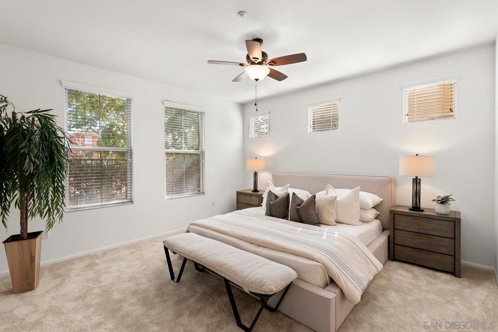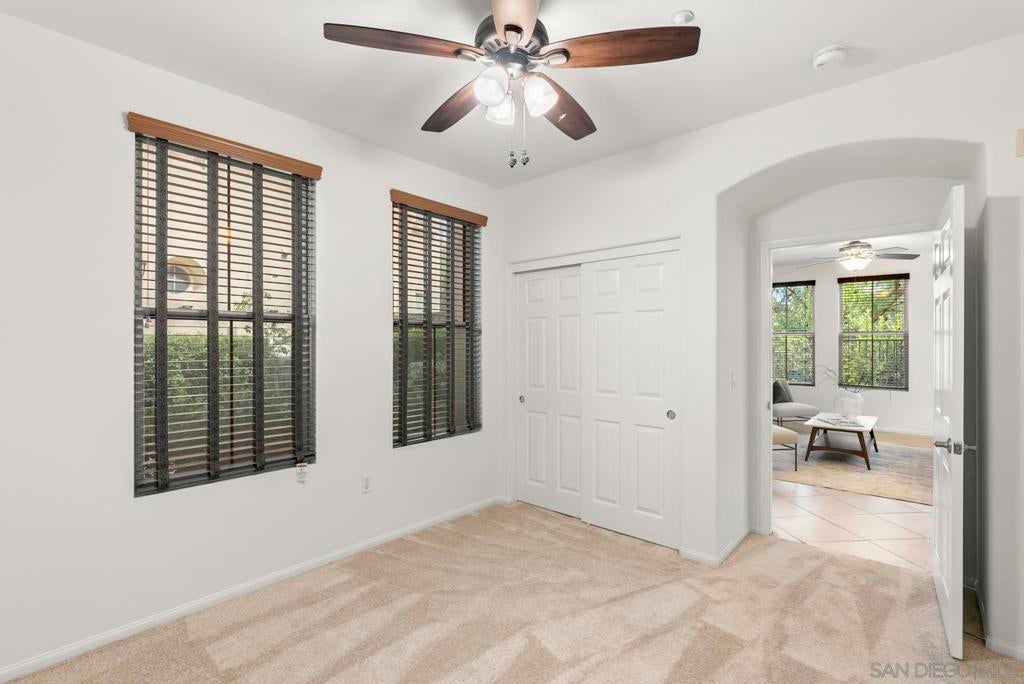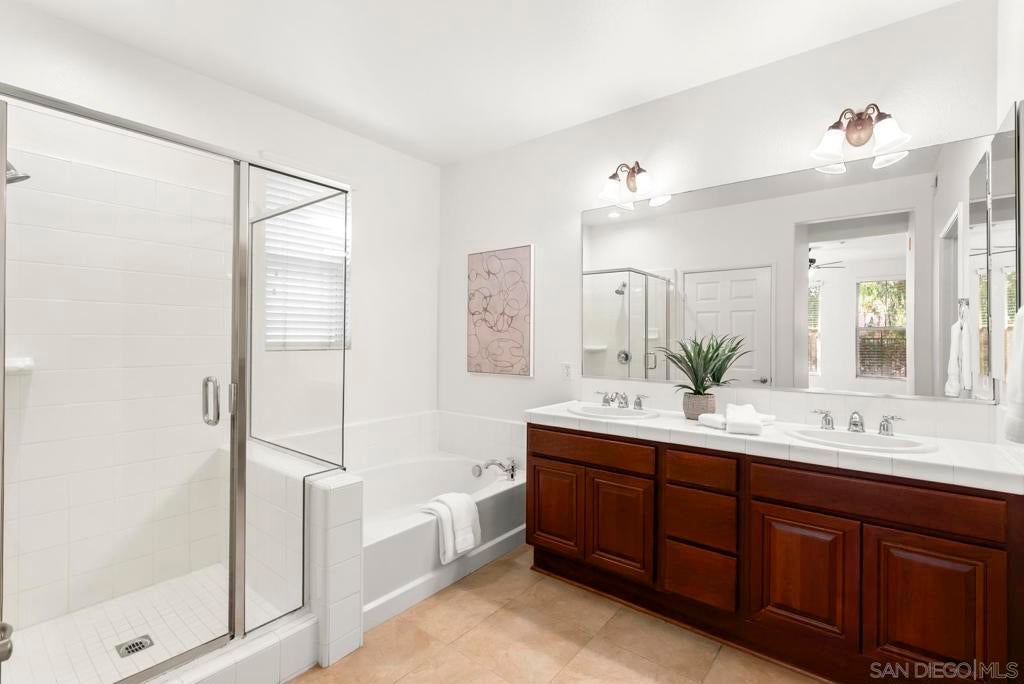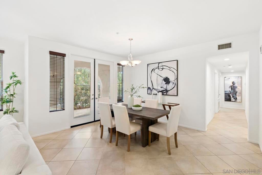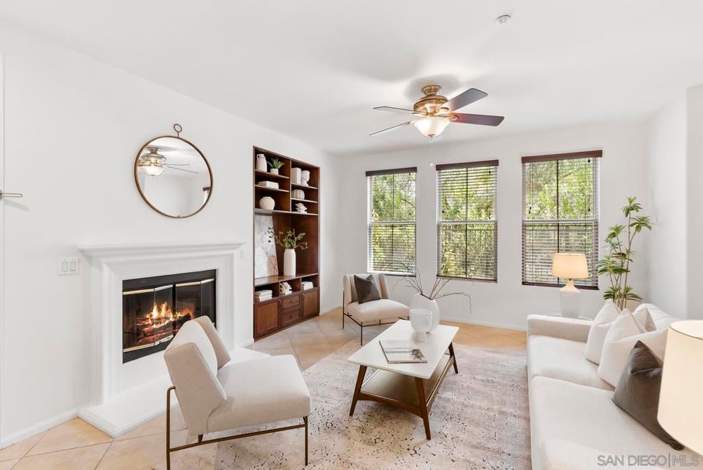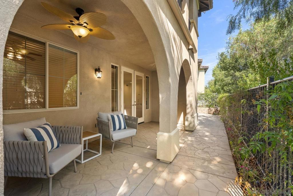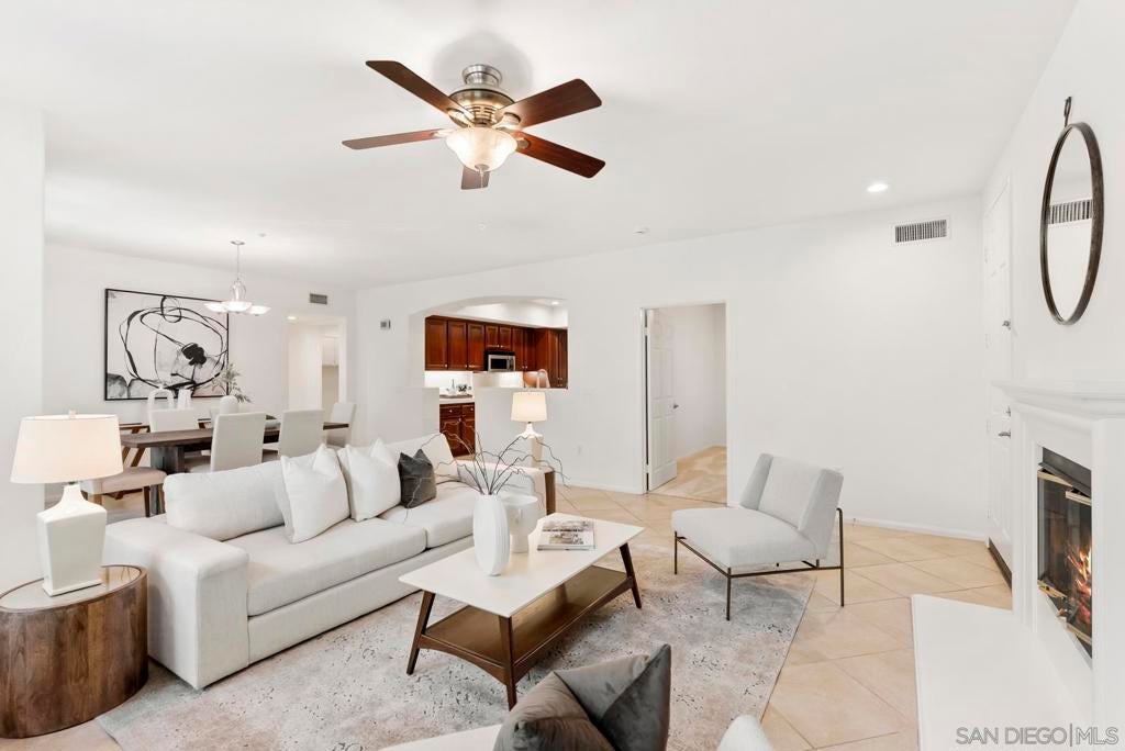 Single-level living meets effortless style in this 3-bedroom, 2-bath condominium in The Verandas at Escala. This sought-after floor plan features open living and dining areas anchored by a cozy fireplace. French doors extend the space to a private garden patio, with a covered veranda perfect for morning coffee, evening gatherings, or simply unwinding outdoors. The kitchen offers generous cabinetry and counter space, while the primary suite provides a retreat of its own with dual sinks, a soaking tub, and a separate shower. Everyday ease is enhanced by a full laundry room, abundant storage, and direct garage access. Residents of the gated Escala community enjoy resort-style amenities including two sparkling pools, a spa, fitness center, two lighted tennis/pickleball courts, basketball hoops, a clubhouse, playground, picnic areas, on-site management, and a dog park. All of this comes with a prime central location near Snapdragon Stadium, Fashion Valley, shopping, dining, and freeway access—offering an ideal blend of comfort and convenience.