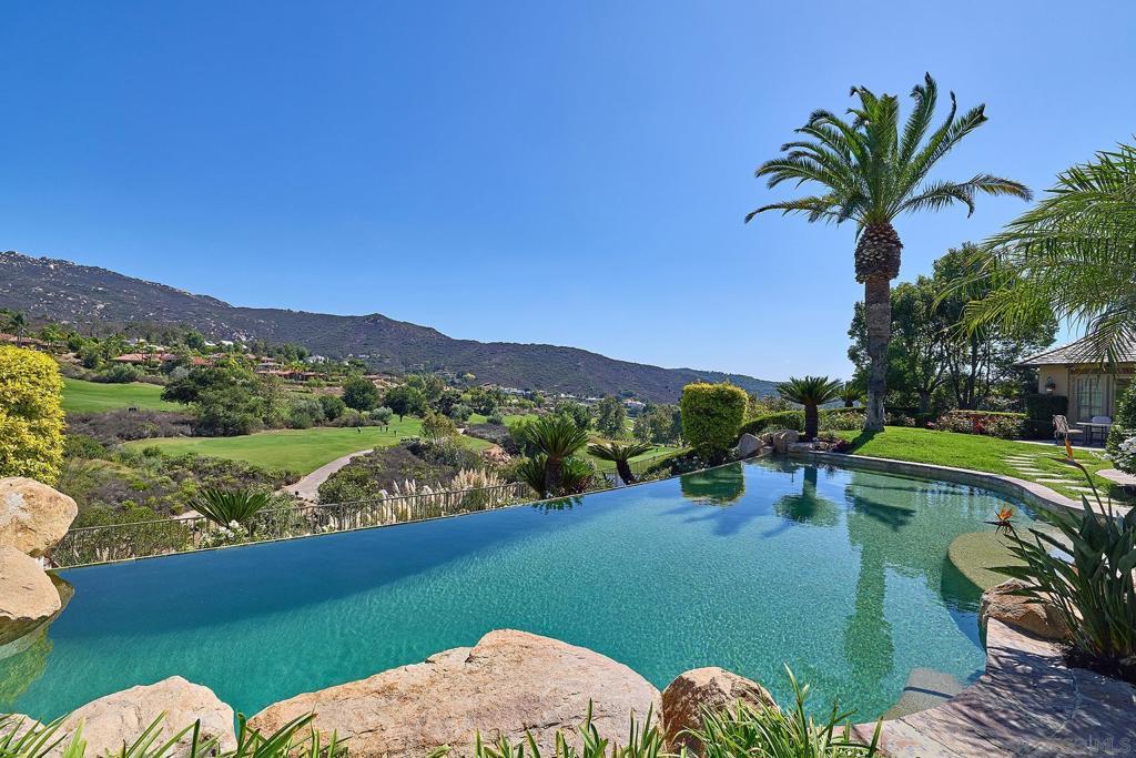 An Iconic French Country Estate in The Heritage Set within the gate-guarded, exclusive community of The Heritage, this Greg Agee French Country masterpiece claims a premier position on over an acre along the second hole of the world-class Maderas Golf Club. Spanning more than 7,800 square feet, this estate blends timeless architectural integrity with resort-inspired living, all framed by immersive panoramic views. A dramatic entry crowned with a dazzling chandelier welcomes you into interiors of refined sophistication—soaring ceilings, freshly refinished hardwood floors, custom millwork, and wainscoting throughout. The great room commands attention with its grand masonry fireplace, vaulted wood-beamed ceilings, and seamless flow into the heart of the home. The gourmet kitchen is a chef’s statement, boasting dual Sub-Zeros, a Viking 6-burner range with flat grill, dual Bosch dishwashers, custom alder cabinetry, and a sunlit dining area with golf course views. Formal and casual spaces—from the elegant dining room to the inviting bar—set the stage for effortless entertaining. Designed to live primarily as a single level, the residence offers a serene ground-floor primary suite with dual walk-in closets, dual water closets, and spa-inspired vanities. A handsome office, an additional ensuite bedroom on the main level, with three upper ensuite retreats ensure comfort for all. A detached one-bedroom casita adds privacy and resort style living for extended guests. Outdoors, the home transforms into a private resort: a vanishing-edge pool spilling toward the fairways. Set on a highly desirable street within the Heritage. Outdoors, the home transforms into a private resort: a vanishing-edge pool spilling toward the fairways, a dramatic waterfall spa, and a fully equipped outdoor kitchen and dining pavilion—all capturing the breathtaking backdrop of Maderas’ rolling fairways. A detailed authentic custom slate roof, motor court with 4 car garage. This estate is more than a residence; it is a legacy of artistry, elegance, and exclusivity—standing proudly among the most distinguished properties within The Heritage.