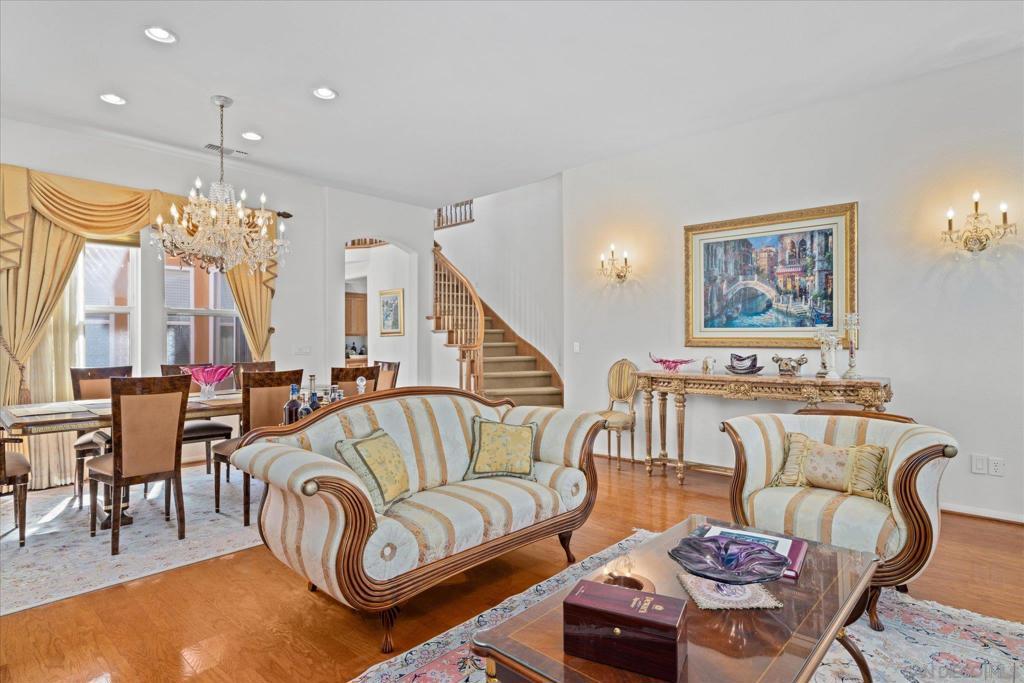 Motivated Seller! Stunning, light-filled 4BR/3BA home in highly desirable Torrey Hills! The main level offers formal living and dining spaces, a spacious family room, and a gourmet kitchen with granite countertops, a center island, maple cabinetry, and a sunny breakfast nook. A flexible downstairs room is ideal for an office or guest suite. Upstairs, the luxurious primary suite features dual walk-in closets, a spa-style bath, and a private balcony. Two additional bedrooms share a Jack-and-Jill bath, complemented by a convenient upstairs laundry room. Two wood-railed staircases provide both privacy and architectural charm, while abundant natural light and a backyard with a built-in spa complete this beautiful home. Bonus: One garage space can easily be converted into a 5th bedroom for added flexibility.