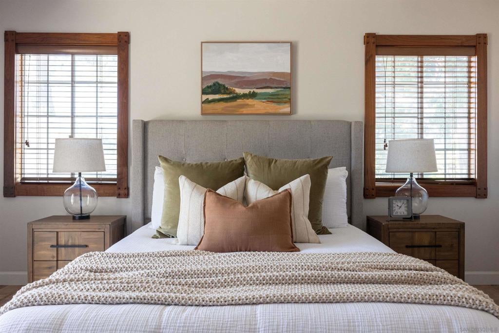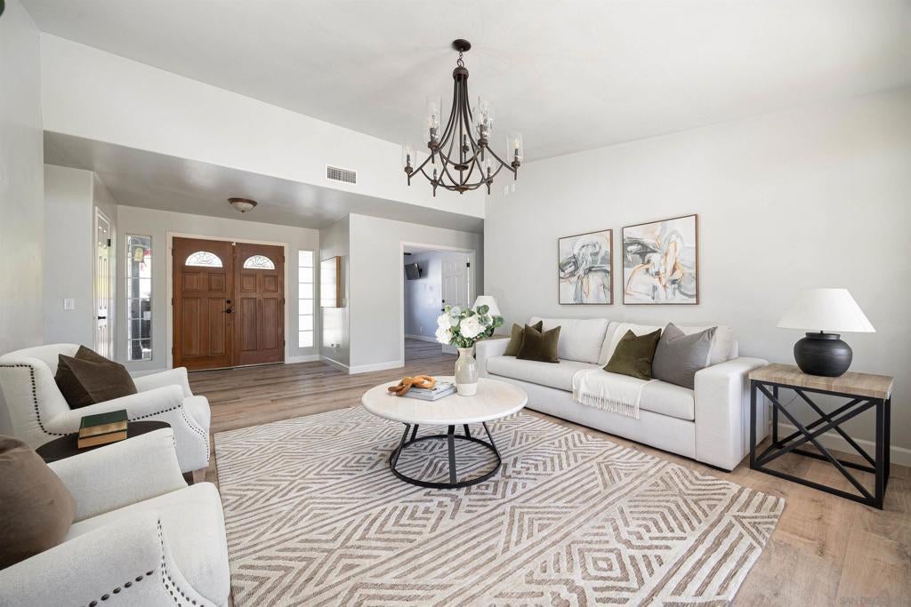 Over $198,000 in Upgrades including a new roof with owned solar, fully remodeled kitchen and bathrooms, new A/C, flooring, paint, and electrical upgrades throughout. Tucked at the end of a long private driveway in a peaceful cul-de-sac, this 5-bedroom, 2-bath single-level ranch-style home offers privacy, mountain views, and no rear neighbors. The backyard opens to protected open space maintained by the San Diego Country Estates Association, where scenic horse trails converge. Ideal for entertaining or relaxing, the backyard features two covered patios, usable flat space, and rear access for RV or boat parking. Inside, enjoy a thoughtful layout perfect for families or multi-generational living. The private primary suite includes a walk-in closet, backyard access, and a luxurious hammered copper soaking tub. On the opposite wing, four additional bedrooms and two separate living rooms provide flexible space for gathering or working from home. The heart of the home is a fully renovated kitchen with quartz countertops, custom cabinets, premium appliances, and designer tile. Both bathrooms have been upgraded, and the home features new flooring throughout, a new A/C system, all-new light switches and outlets, and fresh exterior paint. A new roof and owned solar were added in 2018, providing long-term energy efficiency. Additional features include dual-paned windows, an attached two-car garage, and a private well that irrigates the entire landscaped lot. Located within the highly desirable San Diego Country Estates with low HOA fees and access to incredible amenities.