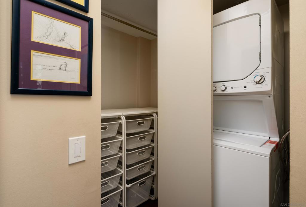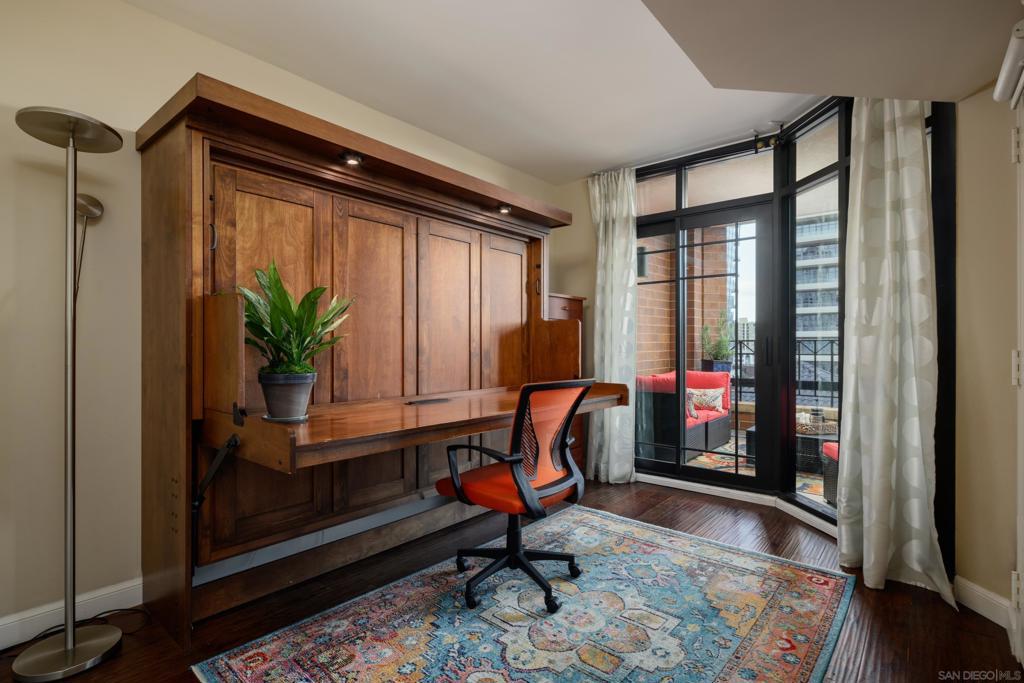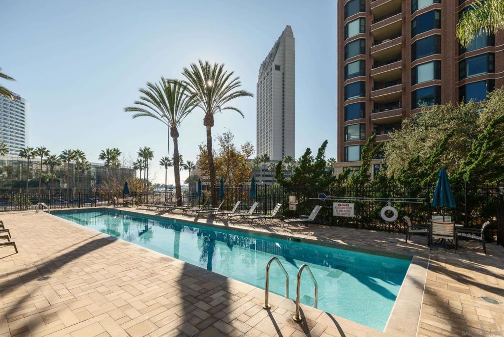Discover elevated urban living at CityFront Terrace from this 2 BR, 2 BA residence in downtown San Diego’s sought-after Marina District. This beautifully updated residence offers peek bay views of the Coronado Bridge, and the city skyline, with a spacious balcony overlooking the community’s lush Urban Canyon gardens. Inside, the open layout blends style and function with a modernized kitchen featuring quartz countertops, stainless appliances, designer backsplash, and custom lighting. The primary suite offers a calm retreat with mirrored closet and a remodeled bath with deep jetted bath & dual quartz vanity. A versatile second bedroom includes a built-in Murphy bed and desk system, ideal for guests or a home office. Home comes with one large parking spot. CityFront Terrace is legendary in downtown San Diego for its high-end service and amenities with valet parking, 24 hour security/door service, 3,500 sq ft fitness center, two heated pools, clubroom, concierge services, and more! With the waterfront, Seaport Village, the Rady Shell, Little Italy, and the new Research and Development Districts just outside your door, this is downtown living at its best. Discover elevated urban living at CityFront Terrace from this 2 BR, 2 BA residence in downtown San Diego’s sought-after Marina District. This beautifully updated residence offers peek bay views of the Coronado Bridge, and the city skyline, with a spacious balcony overlooking the community’s lush Urban Canyon gardens. Inside, the open layout blends style and function with a modernized kitchen featuring quartz countertops, stainless appliances, designer backsplash, and custom lighting. The primary suite offers a calm retreat with mirrored closet and a remodeled bath with deep jetted bath & dual quartz vanity. A versatile second bedroom includes a built-in Murphy bed and desk system, ideal for guests or a home office. Home comes with one large parking spot. CityFront Terrace is legendary in downtown San Diego for its high-end service and amenities with valet parking, 24 hour security/door service, 3,500 sq ft fitness center, two heated pools, clubroom, concierge services, and more! With the waterfront, Seaport Village, the Rady Shell, Little Italy, and the new Research and Development Districts just outside your door, this is downtown living at its best.