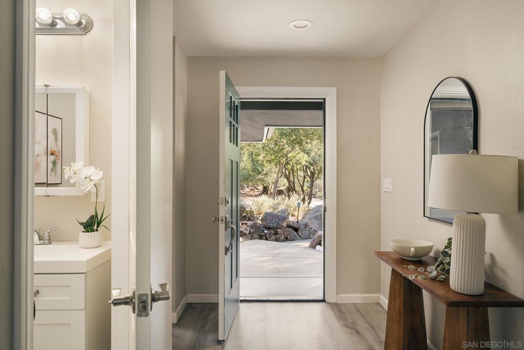 Discover a rare gem tucked away on a verdant cul-de-sac in the highly sought-after Green Valley neighborhood of Poway. Set on a serene 1.04-acre lot, this charming property blends tranquility, modern comfort, and timeless appeal. Step inside to find 2,741 square feet of elegantly designed living space, where sophistication meets everyday livability. The home features five spacious bedrooms and three and a half bathrooms, thoughtfully arranged for flexibility and function. The main level showcases the primary bedroom and two additional bedrooms, an inviting open-concept kitchen, and a family room—perfect for both intimate gatherings and lively entertaining. Luxury vinyl and plush carpeting create warmth throughout, while professional-grade appliances elevate your culinary experience. The upper level, two additional bedrooms share a stylish Jack & Jill bathroom, complemented by a versatile family room or guest retreat. An oversized three-car garage provides ample storage and includes a convenient laundry and craft room. Outdoors, embrace the natural beauty that defines this property. A spacious deck invites you to unwind beneath the canopy of majestic oak trees, with striking boulders and a seasonal creek completing the picturesque setting. Relax in the Jacuzzi overlooking the scenic backyard, or enjoy the covered sitting area beneath the deck, enhanced with modern lighting and ceiling fans. Meandering pathways loop through the landscape, perfect for peaceful strolls. Practical features include RV parking and an owned solar system with battery backup, ensuring efficiency and sustainability. Ideally located near shopping, fine dining, parks, and walking trails, this home also belongs to the award-winning Poway Unified School District. This is more than just a home—it’s a sanctuary where nature, comfort, and convenience converge.