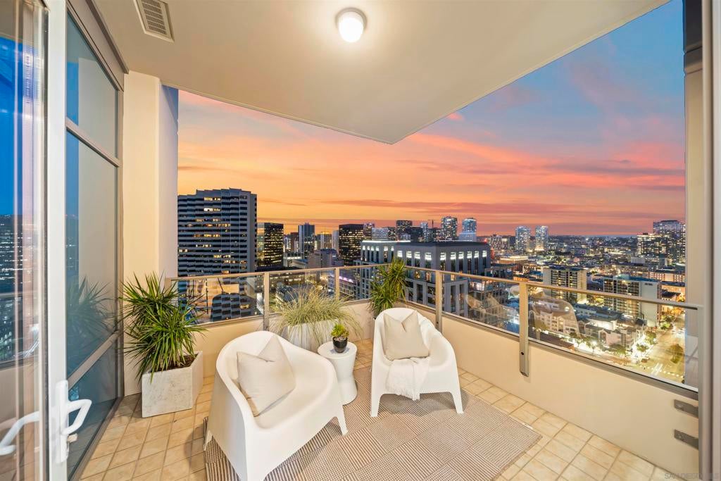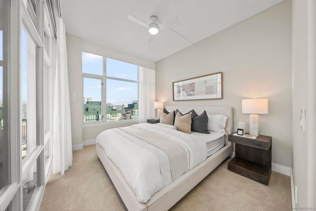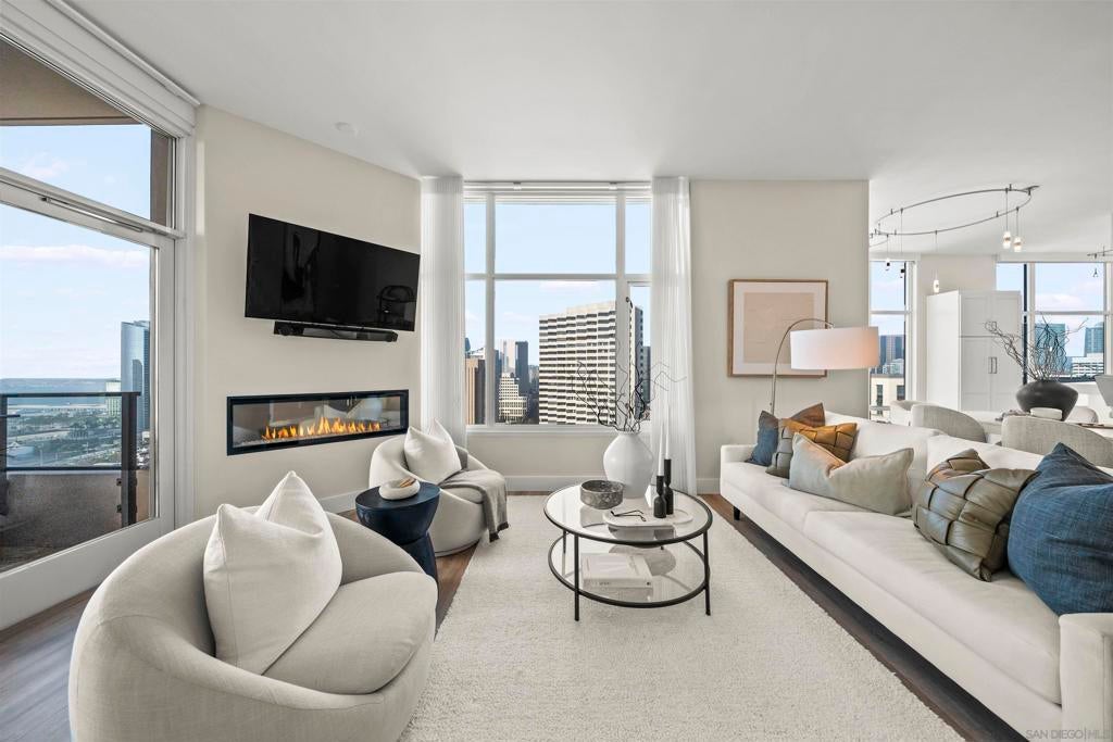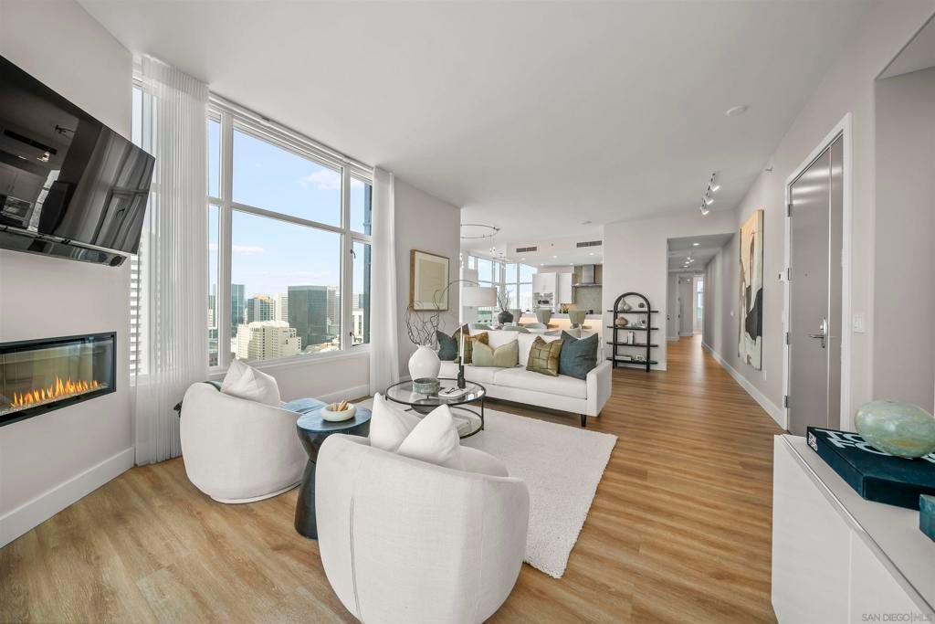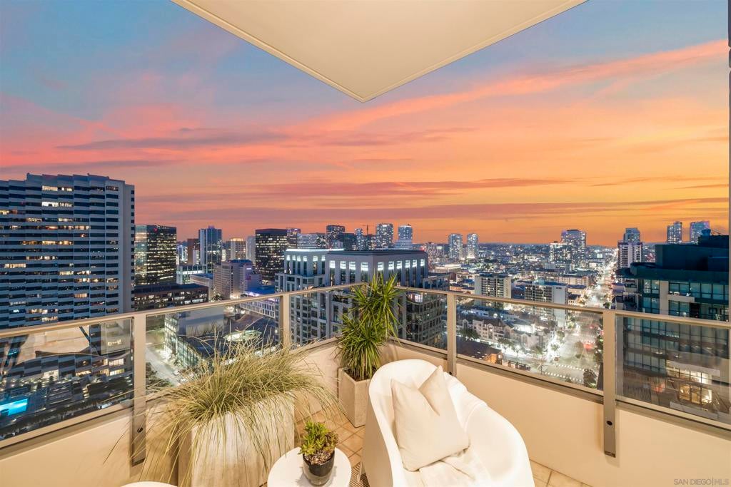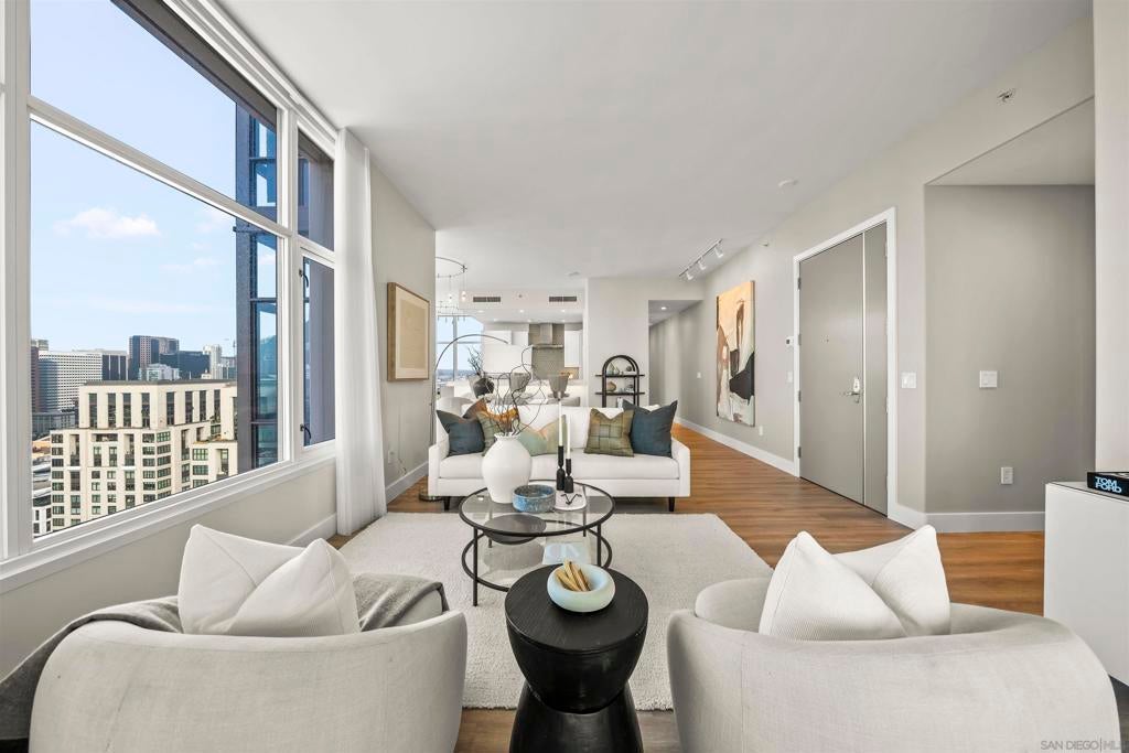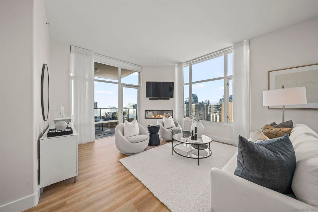 Step into luxury with this impeccably remodeled 2BR/2.5BA 23rd floor residence offering expansive West, North & East facing views! The grandeur of the space is accentuated by 10.5 ft ceilings + floor-to-ceiling windows, complemented by two private balconies perfect for soaking in San Diego's breathtaking sunsets, watching ships sail by, and admiring the views of Coronado Island and city lights. This residence has been recently remodeled with extensive upgrades including updated flooring throughout, modern kitchen cabinetry, Caesarstone countertops, state-of-the-art kitchen appliances + washer/dryer, California Closet built-ins, upgraded electrical + lighting, and more! Additionally, both bedrooms feature en suite baths that have been fully remodeled, and there's a separate powder room for guests. Moments from Seaport Village, The Rady Shell, Gaslamp District and Petco Park, Pinnacle offers white-glove concierge service, a world-class gym, steam and sauna facilities, a guest suite, a stylish lounge, a 95 ft lap pool + spa & more. Residence #2303 also offers two underground parking spaces and a storage unit. This home epitomizes sophisticated urban living, with every detail thoughtfully considered and upgraded.