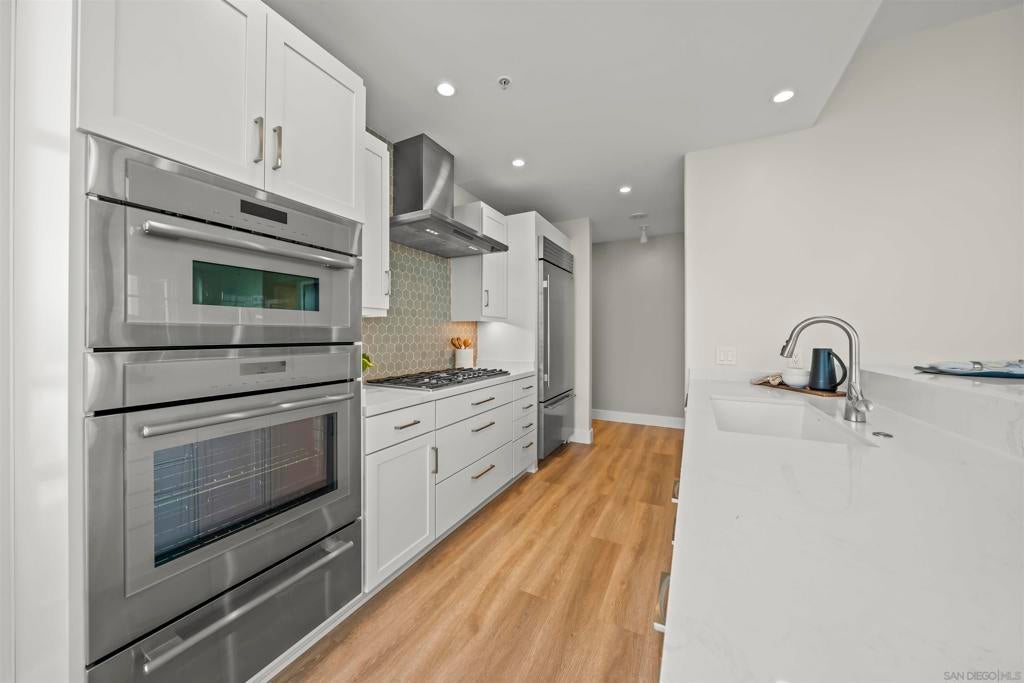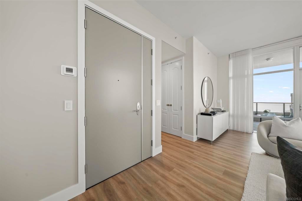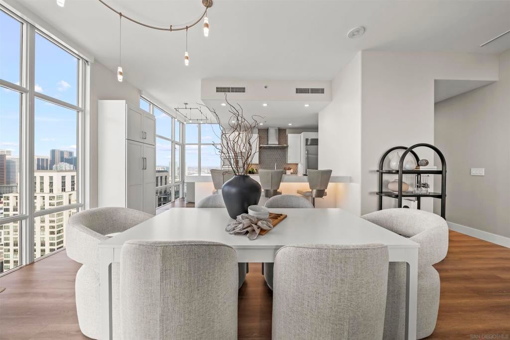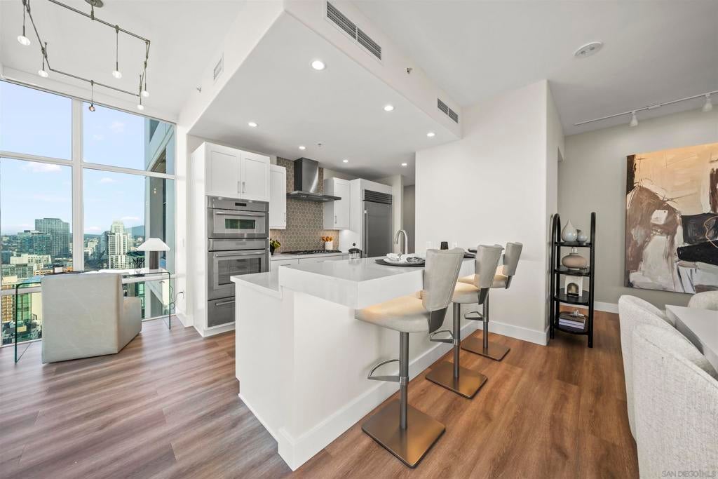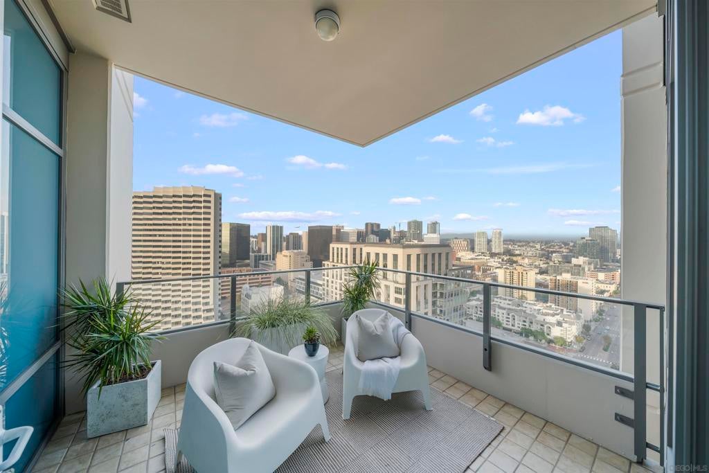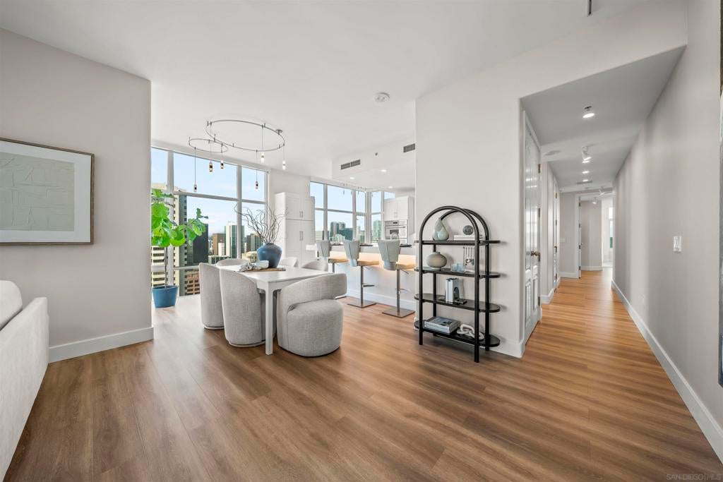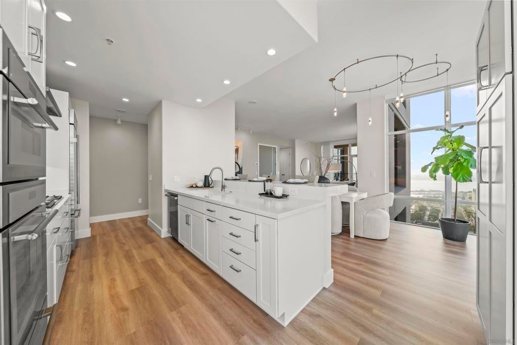 Step into luxury with this impeccably remodeled 2BR/2.5BA 23rd floor residence offering expansive West, North & East facing views! The grandeur of the space is accentuated by 10.5 ft ceilings + floor-to-ceiling windows, complemented by two private balconies perfect for soaking in San Diego's breathtaking sunsets, watching ships sail by, and admiring the views of Coronado Island and city lights. This residence has been recently remodeled with extensive upgrades including updated flooring throughout, modern kitchen cabinetry, Caesarstone countertops, state-of-the-art kitchen appliances + washer/dryer, California Closet built-ins, upgraded electrical + lighting, and more! Additionally, both bedrooms feature en suite baths that have been fully remodeled, and there's a separate powder room for guests. Moments from Seaport Village, The Rady Shell, Gaslamp District and Petco Park, Pinnacle offers white-glove concierge service, a world-class gym, steam and sauna facilities, a guest suite, a stylish lounge, a 95 ft lap pool + spa & more. Residence #2303 also offers two underground parking spaces and a storage unit. This home epitomizes sophisticated urban living, with every detail thoughtfully considered and upgraded.