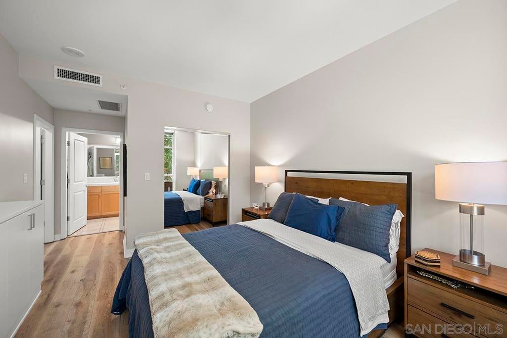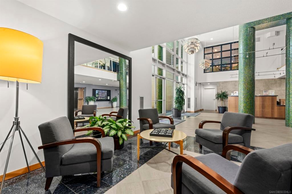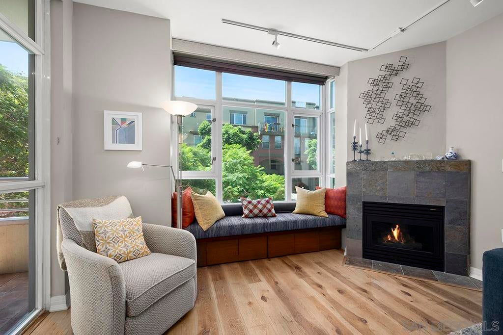 Experience serene treetop views from this west-facing, end-unit residence at Discovery, complete with a private balcony overlooking the peaceful side of the community. With custom paint tones throughout, the upgraded chef’s kitchen is a true centerpiece, showcasing new Calacatta quartz countertops, top of the line GE Profile stainless appliances, painted timeless shaker cabinetry and a deep, single-basin stainless sink combines sleek style with practical ease for cleanup, and recessed lighting for a sleek, modern look. The open-concept living area is highlighted by luxury vinyl plank flooring, expansive windows that flood the space with natural light, a charming window bench seat with built-in storage, track lighting, remote shades, and a cozy fireplace. The spacious primary suite is thoughtfully designed with custom California Closets, a built-in dresser, and remote shades for effortless privacy. The beautifully remodeled guest bath features a walk-in shower and designer finishes. Additional conveniences include one secure parking space near the elevator and a dedicated storage unit. All this in charming, tree-lined Cortez Hill—Downtown San Diego’s hidden gem, celebrated for its tranquil ambiance and sophisticated urban lifestyle. Perched atop Cortez Hill, Discovery offers resort-style living in one of Downtown San Diego’s most charming and established neighborhoods. Residents enjoy secure underground parking, 24-hour concierge service, an elegant lobby, and thoughtfully designed shared spaces including the lush 2nd-floor Fern Grotto Garden and a stylish social lounge. The business center is equipped with commercial-grade office tools, and the 10th-floor rooftop deck features a heated lap pool, cabanas, spa, BBQ grills, and panoramic city views. A top-tier fitness center includes a sauna and steam room for full wellness access. Just steps away are local favorites like Tweet Street Park, Hob Coffee, and Soleluna Café, with Little Italy and Balboa Park within walking distance. Plus, enjoy quick freeway access to I-5 and Hwy 163 from this peaceful urban retreat.
