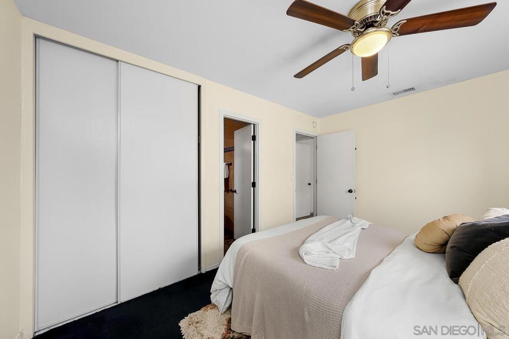 Nicely updated 3-bedroom, 2-full bath home with large back-facing family room in North Clairemont awaits. Tasteful touches include wide-plank and tile flooring, recessed lighting, accent walls, ceiling fans, tons of cabinet space, built-in shelving, and a real brick fireplace. The backyard has a covered concrete patio with a terraced back perimeter ideal for gardening, and with ample space for a pool and hot tub. The backyard casita is equipped with AC and electric so perfect for an at-home office, kids' play space, or hobby hut. The garage has a built-in room with AC unit. Solar to be paid at close.