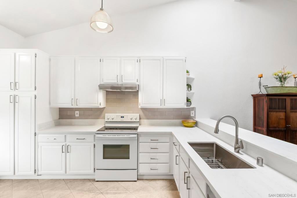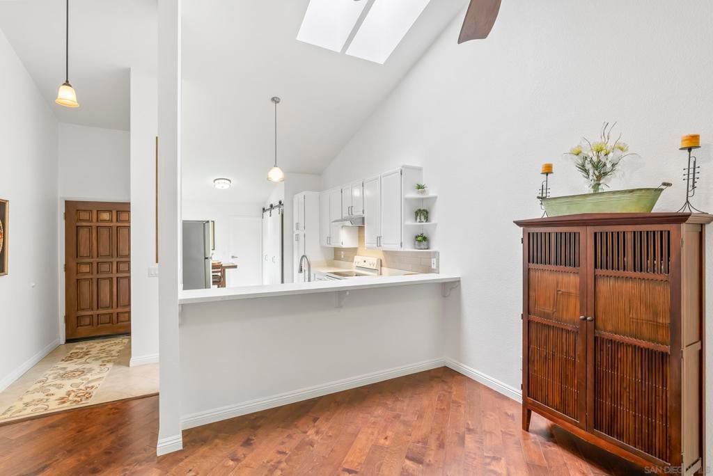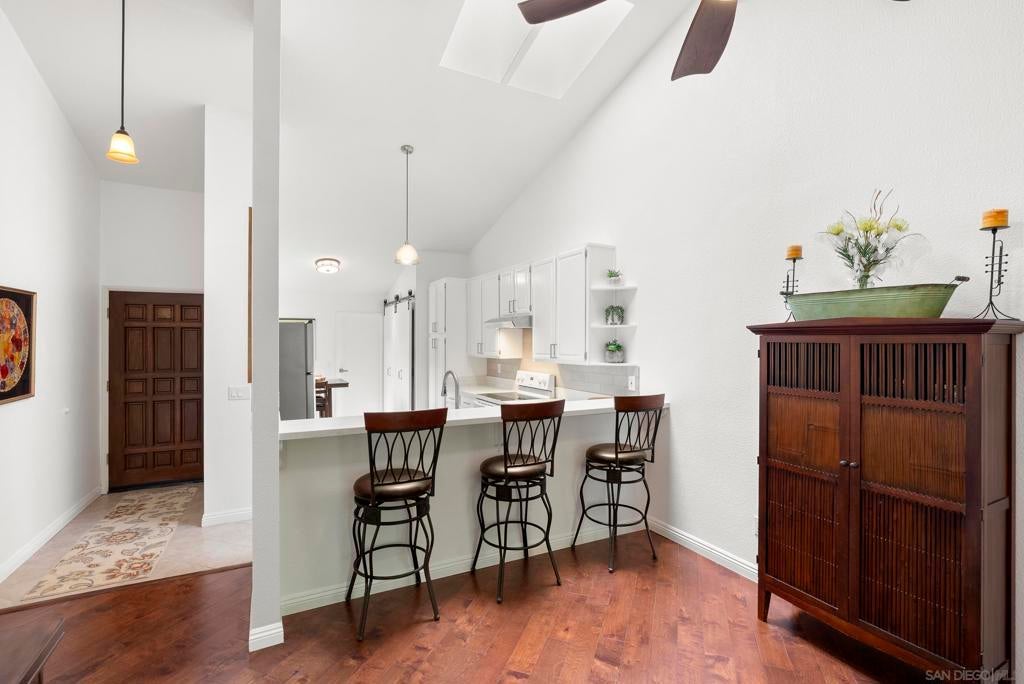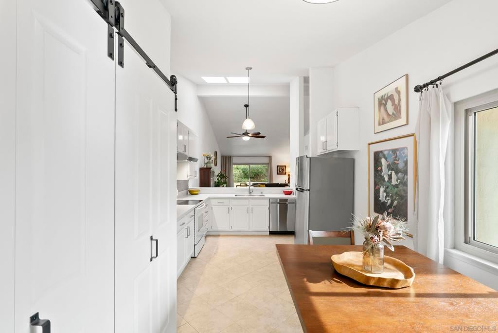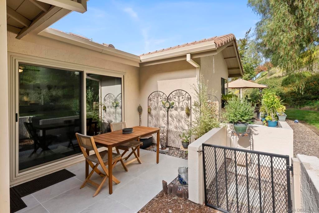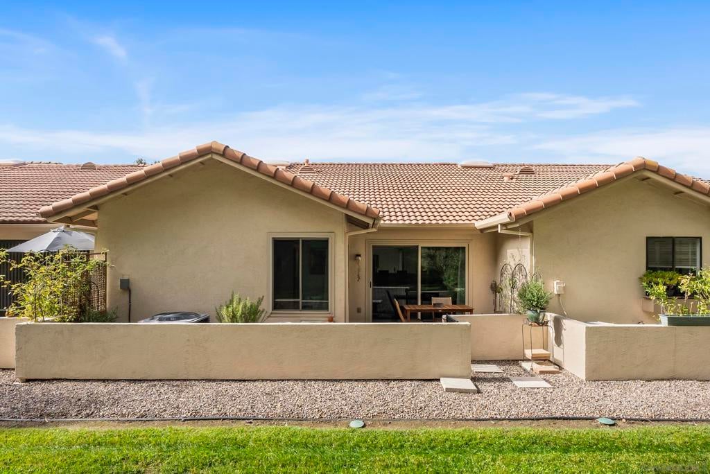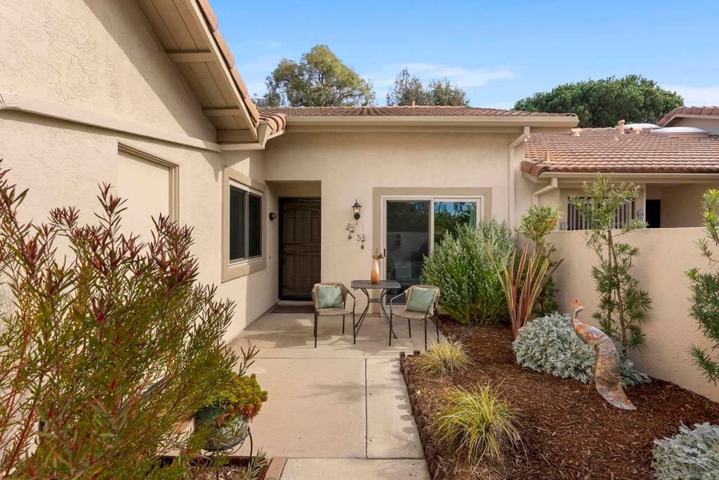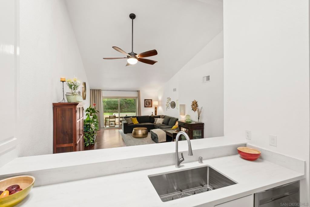 Wow! Take a look at me now! Gorgeous renovation is complete for the next lucky owner! Located in the highly sought-after 55+ Oaks North Villas, this single-story home now showcases a brighter, cleaner, more modern aesthetic. Step inside to soaring vaulted ceilings, abundant natural light, and the benefit of newer Anlin dual-pane/ dual sliding windows and sliding doors. The kitchen has undergone a stunning transformation: upper cabinets removed to open the space, all cabinetry professionally repainted (see suppl) in crisp white, new hinges and hardware, brand-new leathered-finish quartz countertops, stainless-steel sink, modern faucet, and new electrical outlets throughout. New bi-fold barn doors now elevate the laundry area with both style and convenience. Thoughtful upgrades continue throughout the home: refreshed bathrooms with quartz counters and modern Kohler fixtures, distressed wood-style flooring in the spacious combo dining and living room, fresh carpet in the secondary bedroom, updated hardware, newer interior paint, new water heater (2024), new washer (2024), and a new HVAC system with updated ducting (2023). Enjoy two outdoor retreats—an inviting front courtyard and a serene rear patio upgraded with porcelain tile and backing to a peaceful greenbelt. Perfect for enjoying your morning coffee or San Diego’s sunshine any time of year. Living in Oaks North means access to a vibrant community center featuring a heated pool/spa, tennis and pickleball courts, fitness center, lawn bowling, ceramics, woodshop, and an active social calendar. Completely refreshed and move-in ready, this home presents a rare opportunity to own a beautifully updated residence in one of San Diego’s premier 55+ communities.