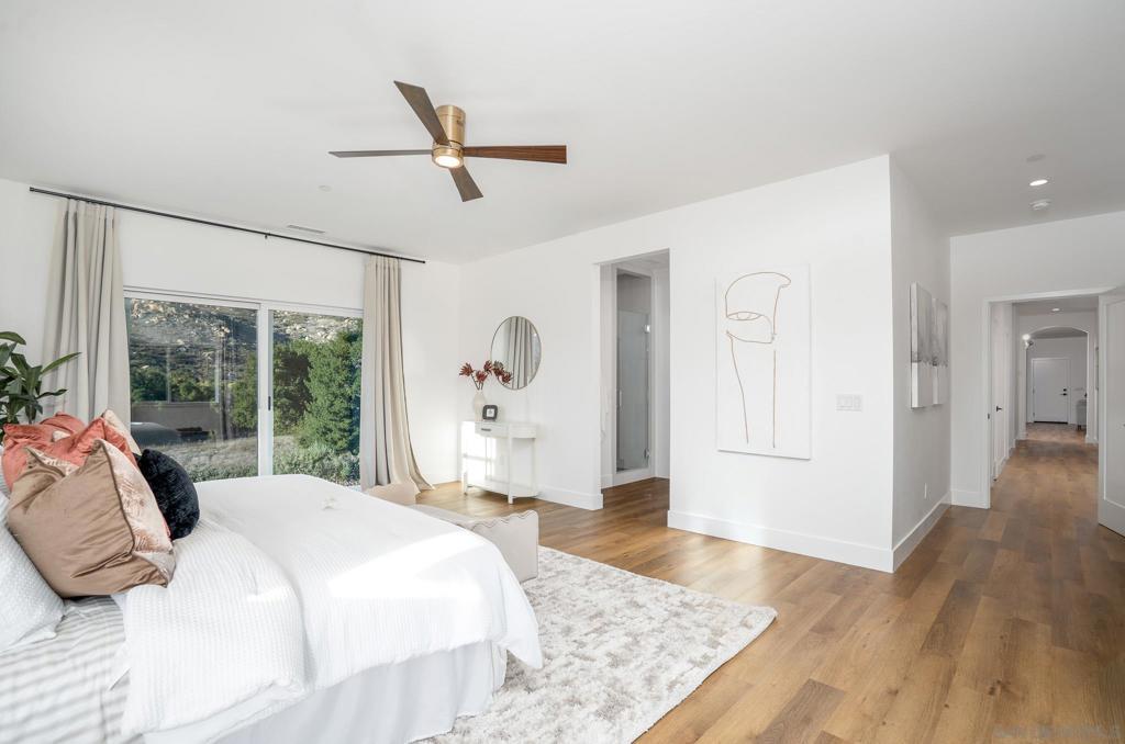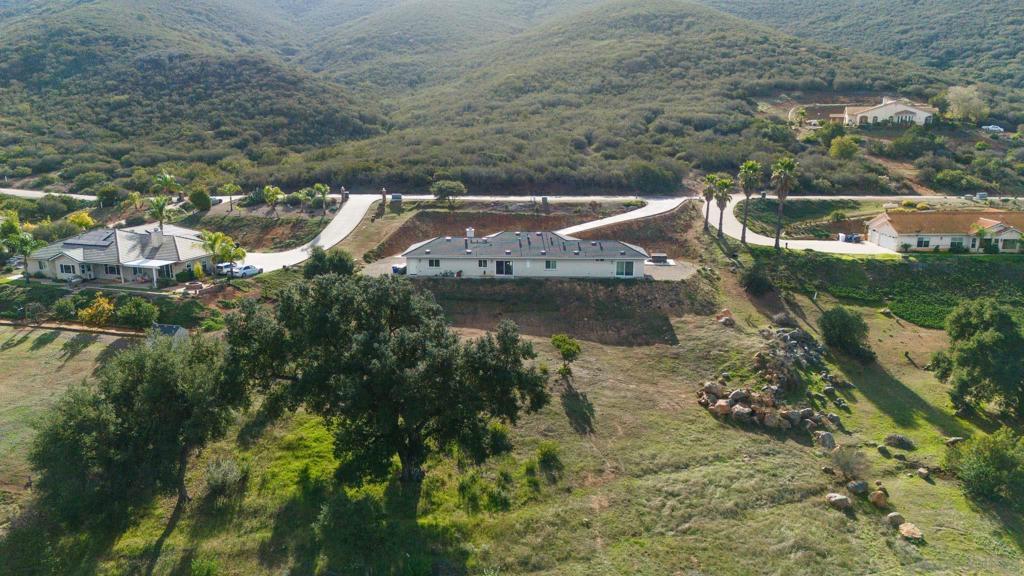 Welcome to your custom-built sanctuary in the rolling foothills of Ramona. This modern residence, completed in 2022, sits on more than 2 acres of oak-studded land with a seasonal creek, offering sweeping mountain and valley views along with unforgettable sunset panoramas. Step inside to a bright, open layout framed by 9-foot ceilings and a warm, modern wood-burning fireplace already wired for propane—perfect for cozy evenings or entertaining. The heart of the home is a gourmet kitchen featuring quartzite countertops, a spacious center island, and a walk-in pantry, blending style with everyday functionality. The primary suite serves as a peaceful retreat, complete with private patio access so you can immerse yourself in the surrounding beauty any time of day. Outside, the property is designed to enhance your lifestyle, offering a concrete pad wired for a 240V jacuzzi and electrical run to the top of the driveway—ideal for future lighting, a gate, or other upgrades. Tech-ready and thoughtfully built, the home is wired throughout with Cat6 cabling routed to a central closet, making it simple to add a security system or expand your network. Additional features include durable luxury vinyl plank flooring, owned solar panels, and an insulated two-car garage with plenty of additional parking. With no HOA, public water, a septic system in place, and R-1 Single zoning, the property offers flexibility for equestrian uses, gardening, or future enhancements. This home beautifully combines modern comfort with rural serenity—move-in ready and designed for a lifestyle of relaxation.