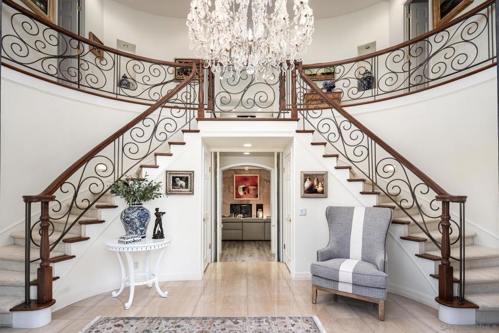 Sparkling with charm and style, this recently updated French Country estate is gracefully set on a private 1.18-acre lot within the exclusive guard-gated community of Fairbanks Ranch in Rancho Santa Fe. A picturesque arrival showcases stately mature trees, lush lawns, and vibrant landscaping. The backyard is a true retreat with a pool, spa, multiple lounging and entertaining areas, and expansive grassy spaces. Inside, timeless craftsmanship shines with custom wood, iron, and stone details. The formal living room features a stone fireplace, while the large dining room includes built-in cabinetry. An inviting office/library with custom shelving completes the classic spaces. The all-new chef’s kitchen boasts professional-grade appliances, a spacious center island, and an adjoining informal dining area that flows seamlessly into the oversized family room with fireplace, bar, and French doors opening to the outdoors. A powder room and one ensuite bedroom are also located on the main level. Upstairs, the oversized primary suite offers a private sitting area with fireplace, spa-inspired bath, and a custom-designed dressing room. Two additional ensuite bedrooms complete the upper level. Peaceful and private, this home is ideal for both grand entertaining and everyday living. Additional highlights include garaging for four cars, solar for pool and access to the amenities of Fairbanks Ranch.