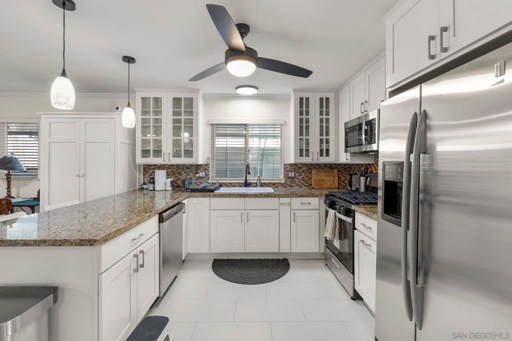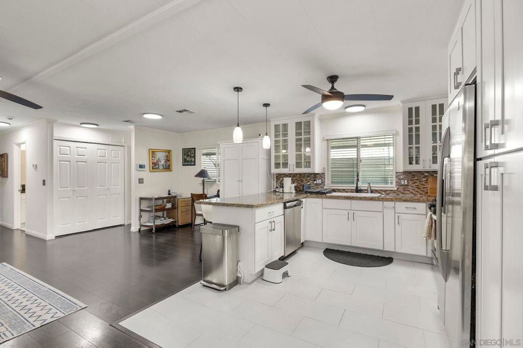 Updated and lovingly maintained 2 bedroom, 2 bath home in the prestigious 55+ community of Lakeshore Gardens! Remodeled kitchen with granite counter tops, tiled backsplash, stainless steel gas range, microwave, dishwasher and refrigerator. Extensive cabinets and bar style seating! Open concept floor plan with multiple skylights bringing in natural light. Hardwood laminate flooring and tiled kitchen and bathrooms. Expanded dual pane living room windows and rare corner gas fireplace! Ceiling fans in living and grand rooms. Open hutch across from dining area for additional storage. Crown molding throughout! Double doors to spacious covered deck. Unique rear and side yard which back up to a forested green belt making it peaceful, private & perfect for relaxing! Lakeshore Gardens is an active 55+, luxury manufactured home community located in Carlsbad! It is located on 54 acres of land, has 384 home sites, & 10 small lakes. Lush landscaping, greenbelts & mature trees throughout, giving the community a park-like feel. The ponds are home to turtles & many fish. Nature lovers have the best of all worlds here! The expansive 2 story clubhouse has a country club feel. The upper-level offers a card room with fireplace, billiard room & a beautiful balcony to enjoy ocean views. Lower level has a fabulous library, recreation room with a stage, commercial grade kitchen & restrooms. A large patio with fountain, fire pit, & outdoor fireplace just outside of the community room. A gated heated pool & spa, beautiful gym, ping pong table, RV parking & more. The entire park is enclosed with a 6 ft wall and security gates. So many activities in the community, almost daily, so residents can find friendship & companionship while attending events they enjoy. Activities include card games, bingo, monthly breakfasts, weekly potlucks, craft groups, golf groups, ladies’ luncheons & much more! You can be as active as you choose, right here at Lakeshore Gardens!