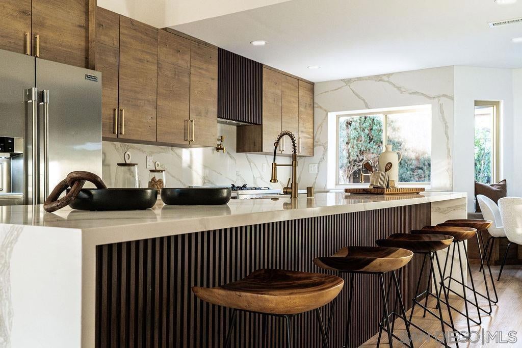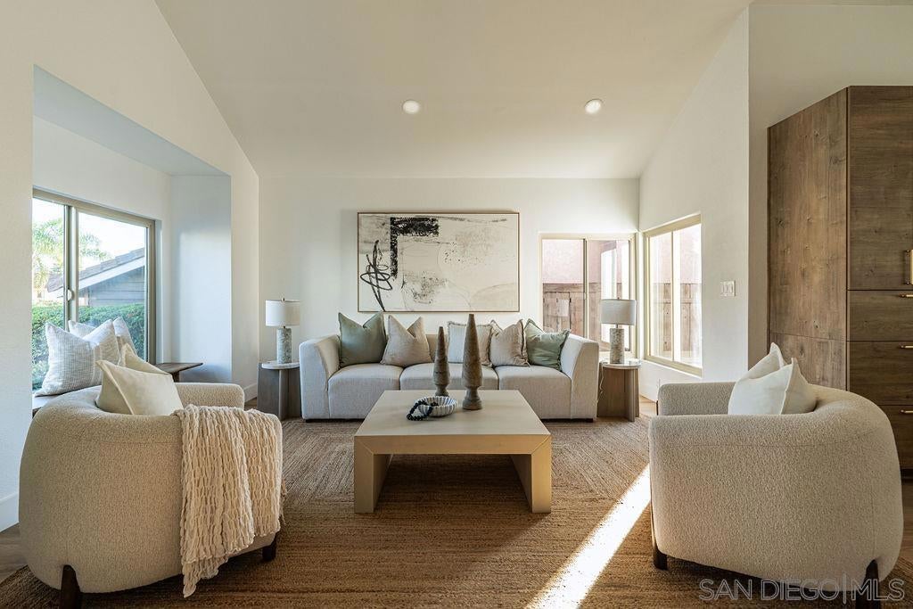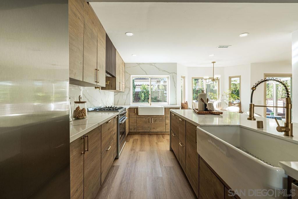 Beautifully updated 4-bedroom home in the heart of Rancho Peñasquitos, this move-in ready stunner blends modern design with everyday comfort. Fresh exterior paint, updated lighting, new pool liner, mulch, and privacy plants create instant curb appeal and a resort-style feel in the backyard. Inside, you’re greeted by new LVP flooring, fresh interior paint, recessed lighting, and a stylish tiled fireplace with a white oak mantle that anchors the main living space. The showpiece is the open-concept kitchen featuring a dramatic waterfall island with dual farmhouse sinks, upgraded appliances, pot filler, window nook, and thoughtfully designed storage, perfect for cooking, entertaining, and everyday life. All three bathrooms have been reimagined with new tile floors, vanities, faucets, mirrors, toilets, exhaust fans, and beautiful tile work in the showers. Upstairs, you’ll find upgraded dual-pane windows, lime washed accent wall in the primary bedroom, stained handrail on the stairs, wrapped beams, painted hallway cabinetry, and new interior doors with updated hardware. Even the outlets and switches have been replaced for a clean, cohesive finish. This is a rare opportunity to move into a fully refreshed home in a prime location within the highly regarded Poway Unified School District.