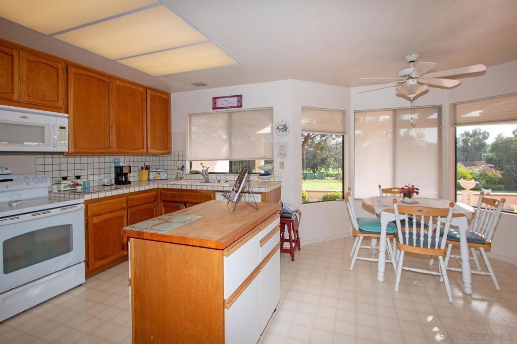 Views of the Oaks North Golf Course from the back patio, kitchen bay window and primary bedroom! Located in the popular, charming, gated community of Chapala this home is ready for you to make it your own. Featuring three bedrooms and two baths with the third bedroom is used as a den. You will enjoy all that Oaks North has to offer with the Oaks North Community Center, Oaks North Golf Course, the Bernardo Winery and nearby shopping. Meet your friends at the community swimming pool, spa, sauna, tennis courts, pickle ball courts, ceramics room, fitness center, library, or billiard's room. Enjoy the many scheduled weekly activities like water aerobics, Yoga, Mah Jong, Bridge, Meditation, Tai Chi, Bingo and quilting. Chapala is located in Oaks North, a 55+ Community.