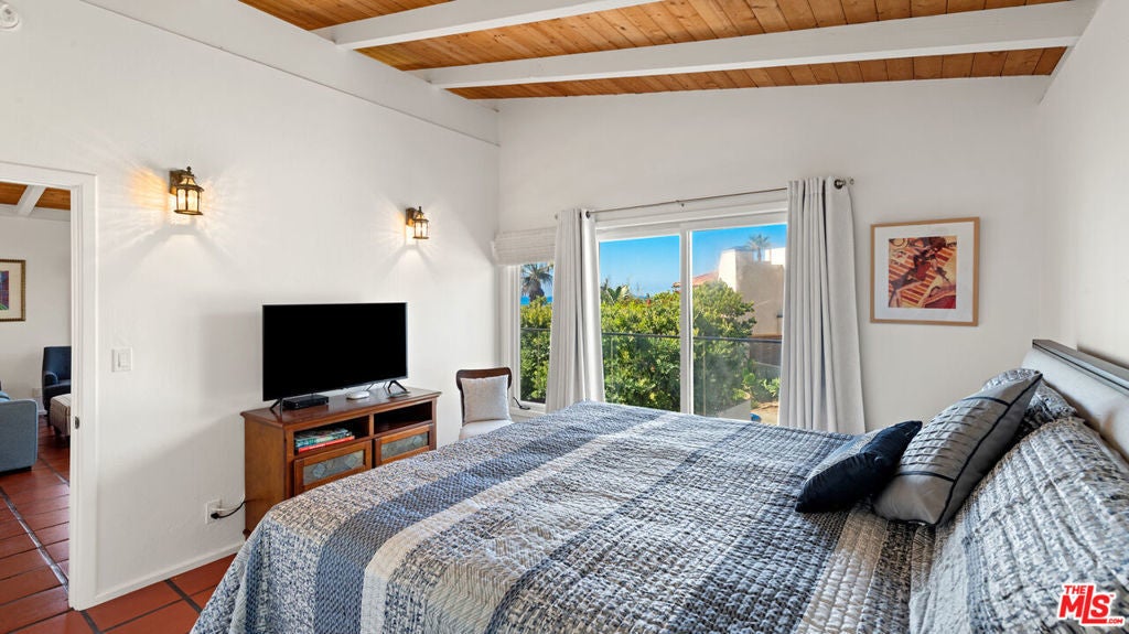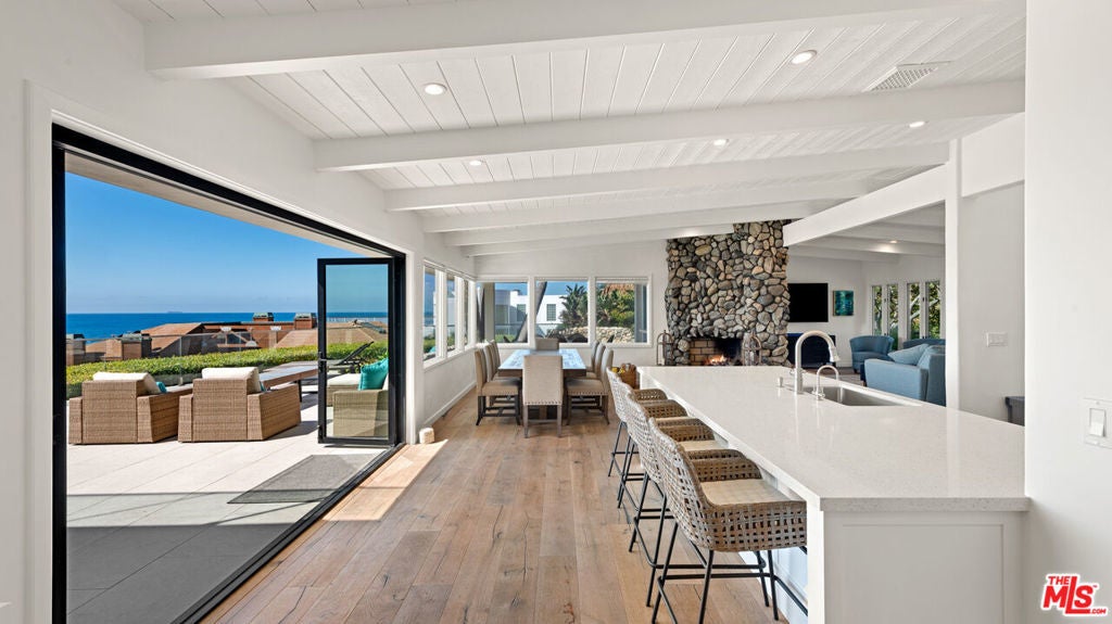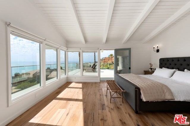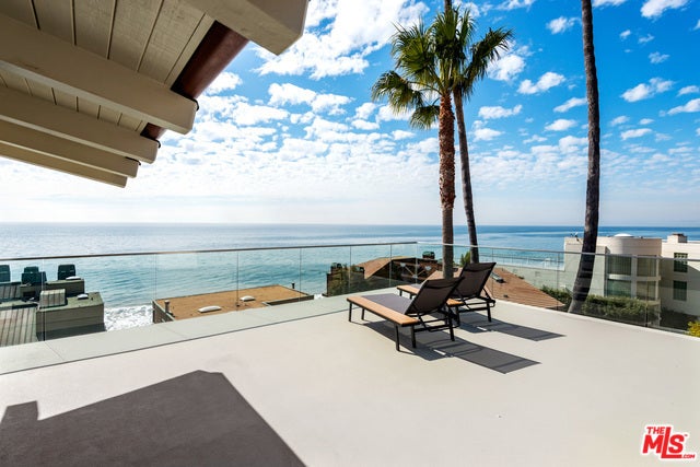 This remarkable Mediterranean contemporary combines all the best elements of Malibu living: exquisite location, private beach access, two master suites, a guest house, and non-stop ocean views. Located in a gated community on a large, corner cul-de-sac lot, the home is luminous and peaceful, with French oak floors throughout and a wonderful open-concept design for relaxed indoor-outdoor living and impressive entertaining. Enormous windows and fold-away glass doors frame views of gardens, courtyard, patio, and a panorama that takes in Catalina, Channel Islands, Point Dume, coastline, and whitewater. The main living area, with a wet bar, built-in bench seating, and flat-screen faces onto the front courtyard and shares a dramatic river-rock wall with the dining room, where the rock wall becomes a fireplace. The chef's kitchen has Caesarstone countertops, a breakfast bar, and a large pantry. Just outside is a huge ocean-view patio for entertaining, covered and al fresco dining, and relaxation. At the far end of this patio is a hot tub set in a quiet garden. Additional outdoor areas include a firepit and river-rock-backed bench, a barbecue island, and a second hot tub in the ocean-view front yard. From the home's main entry, steps lead to the first of two owner's suites. With beamed ceilings, a sitting area, a custom closet, and a luxurious bath, this magnificent room opens onto a huge, private wraparound deck with amazing panoramic ocean and whitewater views. A second owner's suite is on the main level with two walls of windows looking out onto the patio, hot tub, and ocean views. Down a small hallway with generous built-ins is a family room with a flat-screen TV and French doors to the front courtyard, plus a third bedroom with twin beds, a flat-screen, writing area, a closet with stacked washer/dryer, and French doors to a side patio. Off the front courtyard is a guest house with a full kitchen, small dining area, ocean-view living room with high wood-beamed ceilings, private ocean-view deck, and an en-suite bedroom that also has access to the deck. The home is equipped with a Nest system and has a two-car garage with guest parking. A truly wonderful Malibu residence. July and August rate is $40,000 per month, Security Deposit is $40,000.