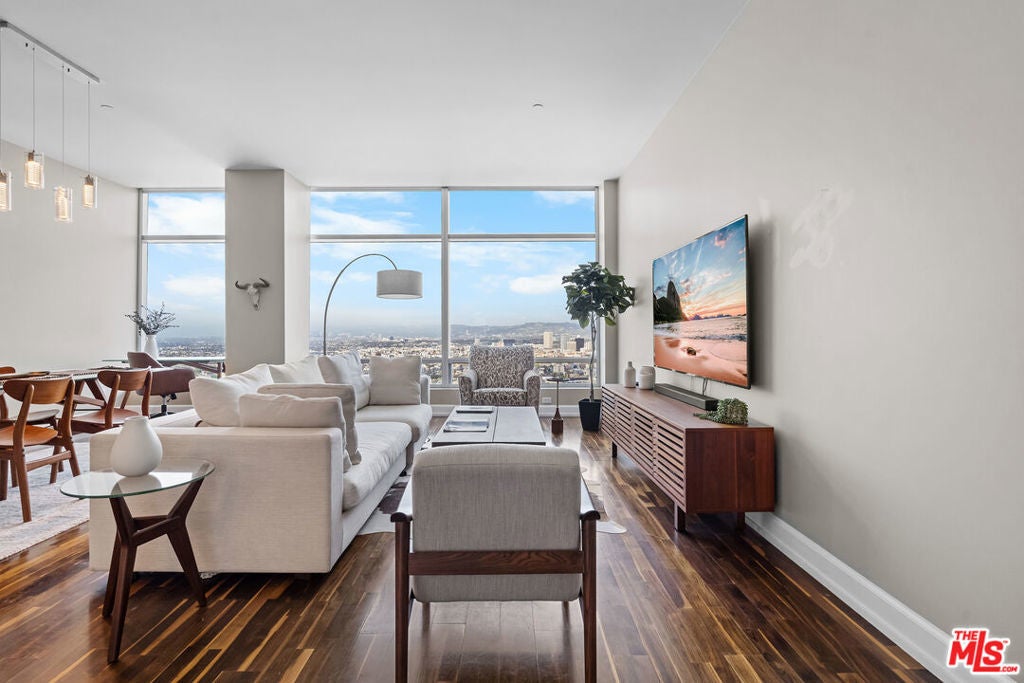Perched on the 40th floor of the prestigious Ritz-Carlton Residences, this exquisite condominium offers an unparalleled blend of sophistication, service, and stunning panoramic views. From the moment you step inside, you're captivated by breathtaking vistas that stretch from the majestic mountain ranges to the shimmering Pacific Ocean, all framed by the city's dynamic skyline. The open-concept kitchen is a chef's dream, featuring an ample sized island, sleek Snaidero Italian cabinetry and top-of-the-line Gaggenau appliances. The living area is equally impressive, boasting Danish hardwood floors, near floor-to-ceiling windows, and soaring 10-foot ceilings that showcase iconic sights such as the Hollywood Sign and Griffith Observatory. Both bedrooms are spacious retreats, each with a luxurious ensuite bathroom. The primary suite offers a spa-like oasis, complete with a soaking tub, floor-to-ceiling tile, and a unique window into the bedroom to maximize natural light and enhance the views. Storage is abundant, with a walk-in closet in the primary suite and a double-door closet in the entryway area. Additional highlights include motorized window shades, custom light fixtures, a powder room with laundry, and a versatile den perfect for a home office or cozy lounge space. Beyond your private sanctuary, indulge in the legendary white-glove service of The Ritz-Carlton. Enjoy in-residence dining, housekeeping services, and exclusive owner perks, such as VIP event access and hotel discounts worldwide. Take the elevator down to the Ritz-Carlton Spa for a rejuvenating massage or steam session, or explore the renowned on-site dining and entertainment offerings just steps away. Whether it's courtside seats at a Lakers game, a Kings hockey match, or a headlining concert, the city's best experiences are at your doorstep. This coveted residence includes two valet parking spaces and a storage unit. Experience the perfect blend of luxury, convenience, and world-class services. Schedule your private tour today.