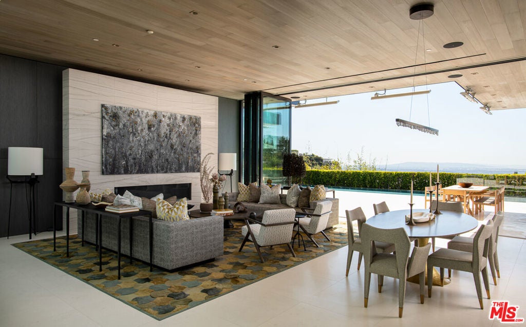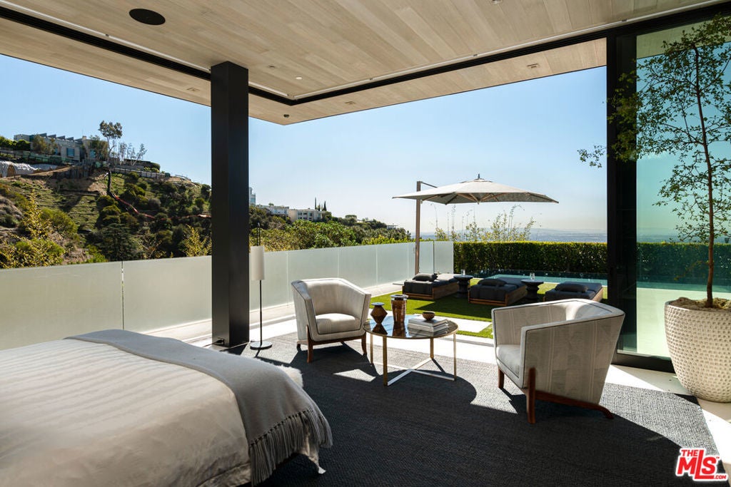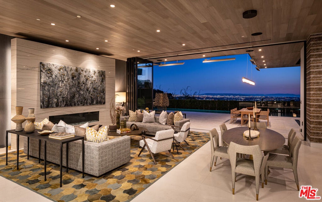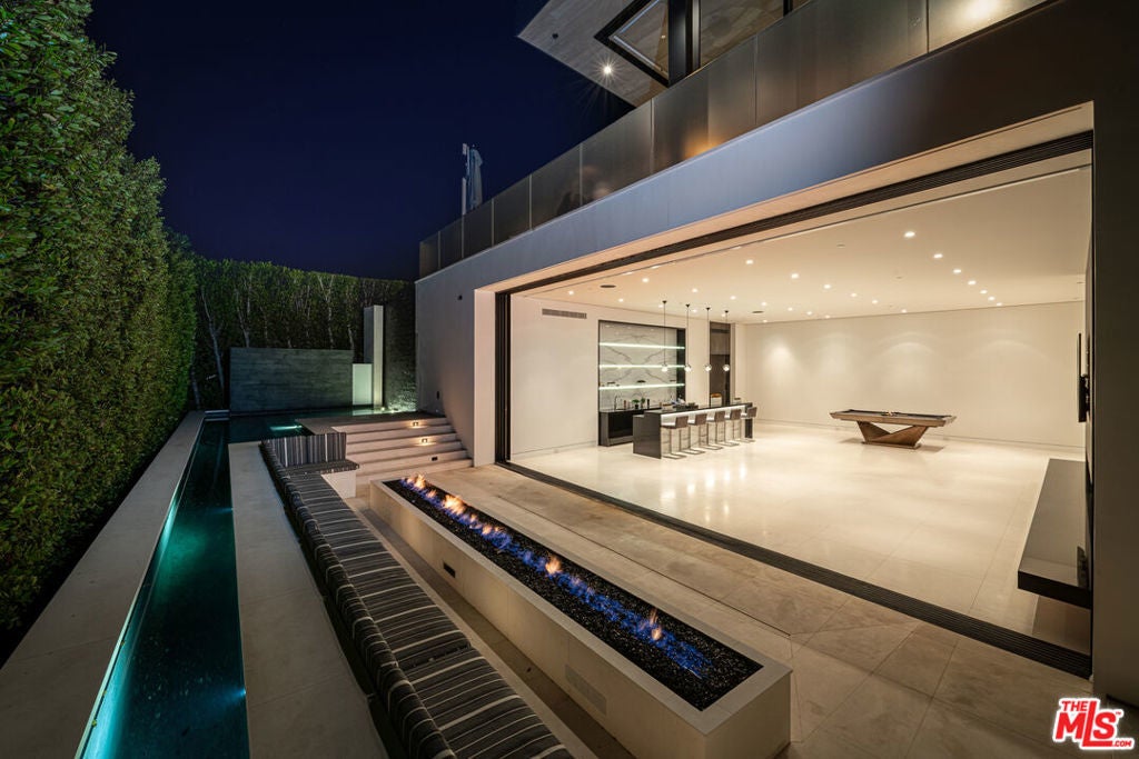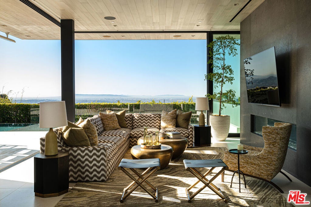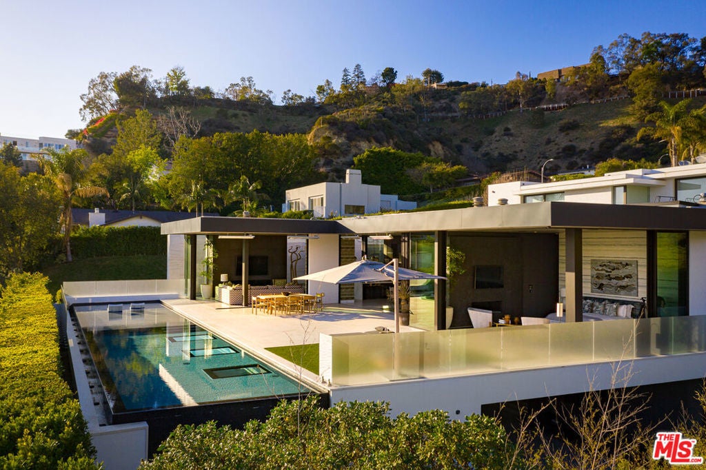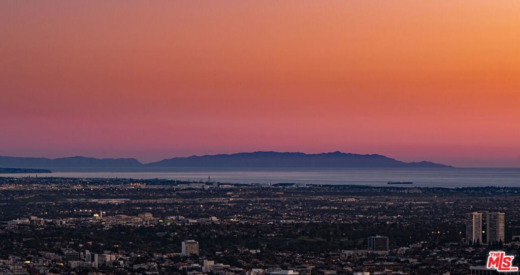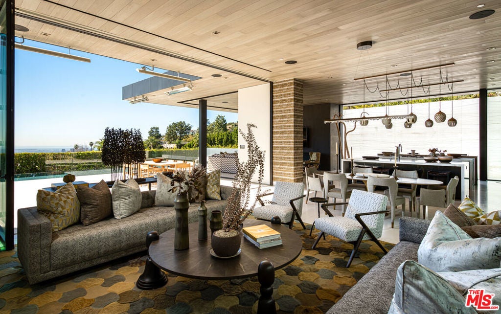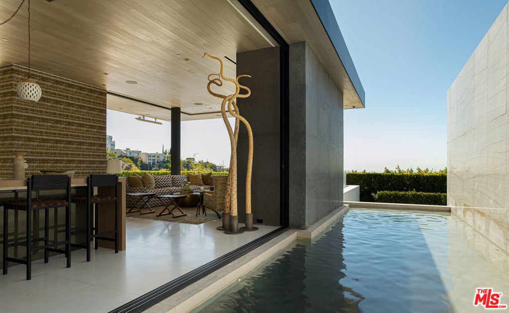 Soaring above Sunset Blvd with jetliner views from Century City to the pacific ocean, this furnished modern showcases breathtaking unparalleled views of Los Angeles. This home boasts 12-foot ceilings, floor to ceiling windows, multiple water features, car museum and a 70-foot book-matched marble exterior wall for ultimate privacy. The open-plan living areas take you through expansive Fleetwood doors leading you to the sun-lit deck and infinity pool. Chef's style kitchen and primary suite with spacious walk-in closet and master bath on main level. Second suite with optional second entrance on main level. A daylit entertainer's level holds 2 additional en-suite bedrooms, a great room with custom bar, 18 seat screening room, fitness room with steam, and a lounge space. With full Crestron automation, this home offers a living experience moments to the Beverly Hills Hotel and Rodeo Drive. Please inquire with agent about available concierge services for an extra fee.