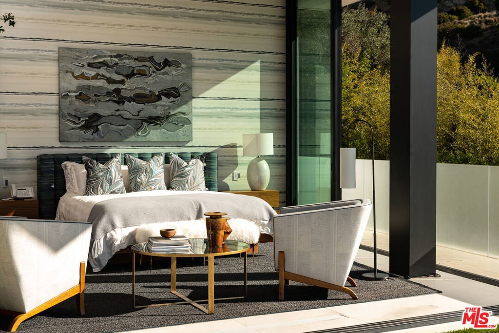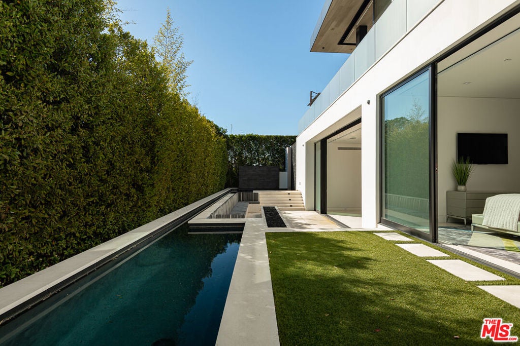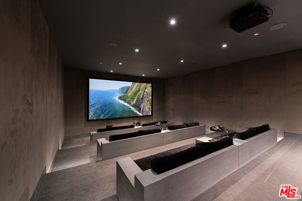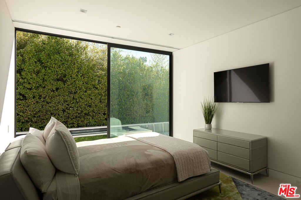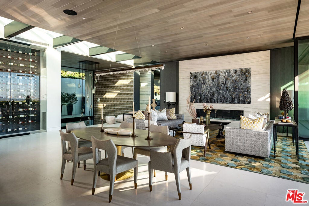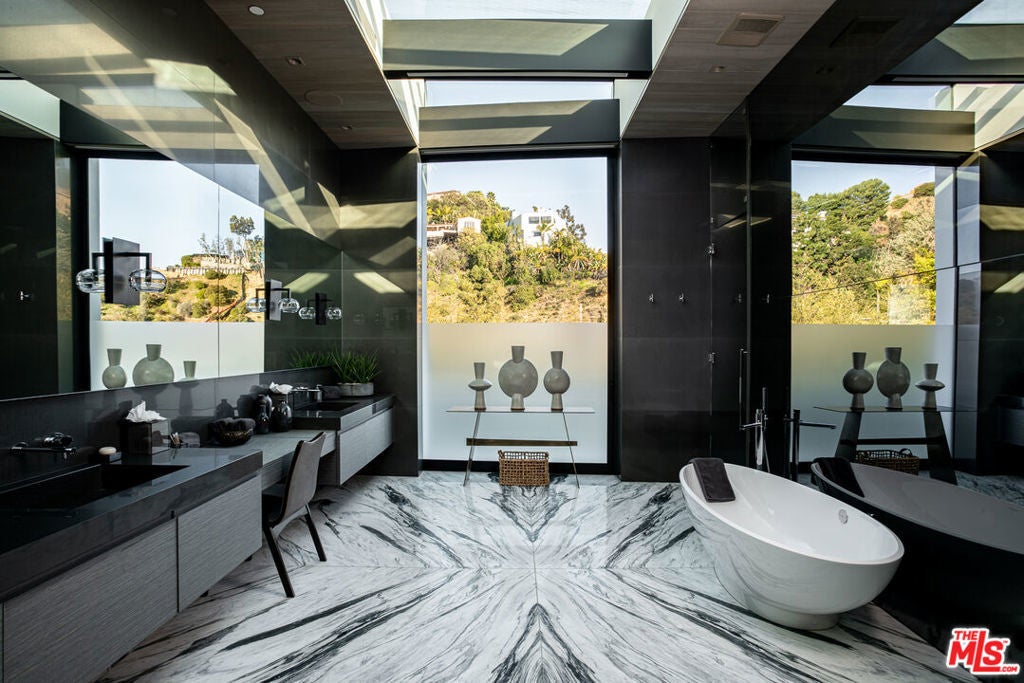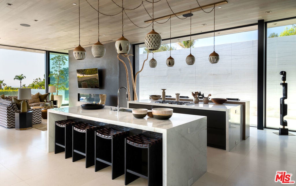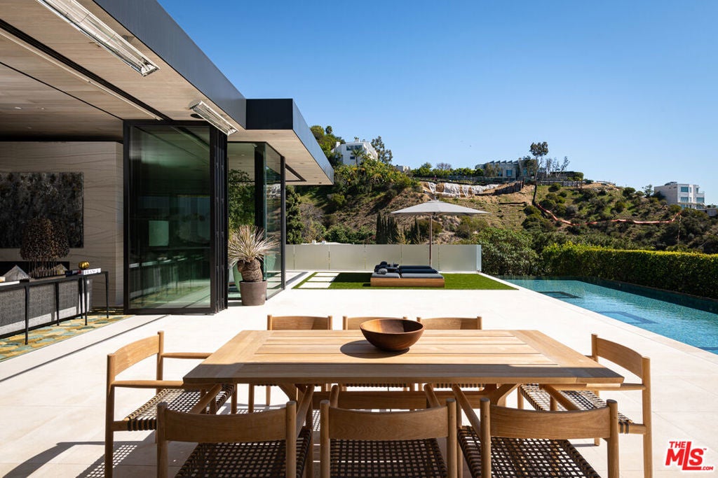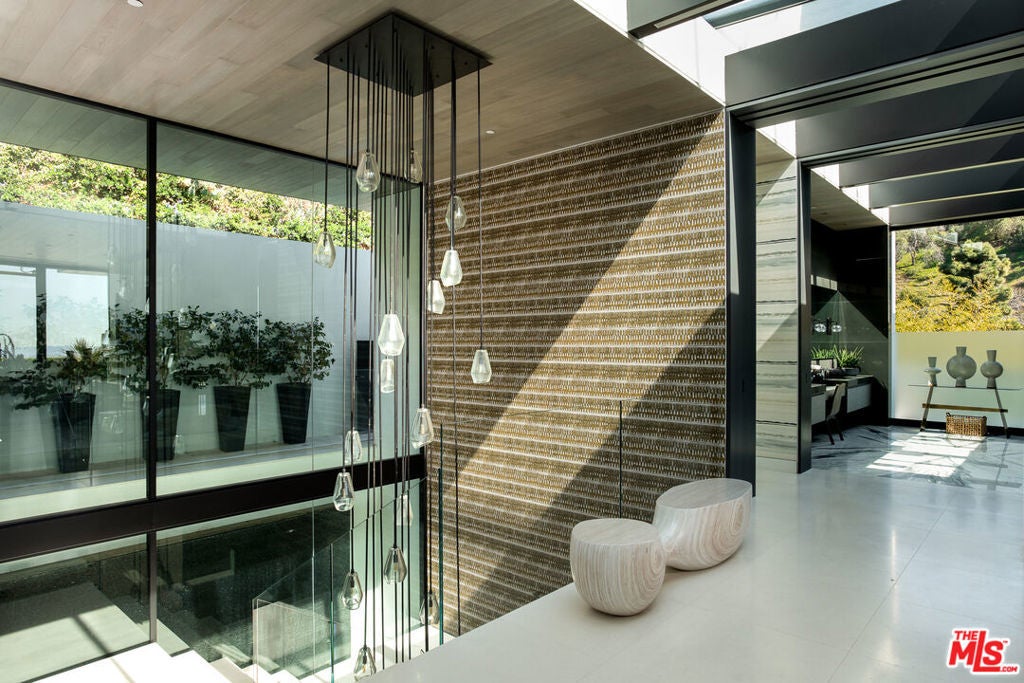 Soaring above Sunset Blvd with jetliner views from Century City to the pacific ocean, this furnished modern showcases breathtaking unparalleled views of Los Angeles. This home boasts 12-foot ceilings, floor to ceiling windows, multiple water features, car museum and a 70-foot book-matched marble exterior wall for ultimate privacy. The open-plan living areas take you through expansive Fleetwood doors leading you to the sun-lit deck and infinity pool. Chef's style kitchen and primary suite with spacious walk-in closet and master bath on main level. Second suite with optional second entrance on main level. A daylit entertainer's level holds 2 additional en-suite bedrooms, a great room with custom bar, 18 seat screening room, fitness room with steam, and a lounge space. With full Crestron automation, this home offers a living experience moments to the Beverly Hills Hotel and Rodeo Drive. Please inquire with agent about available concierge services for an extra fee.