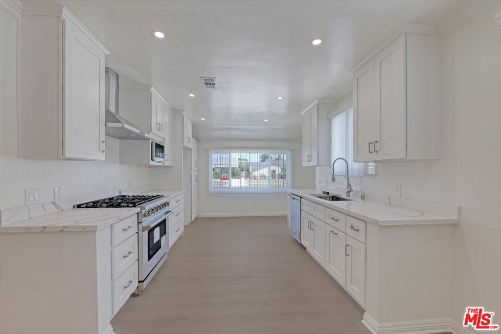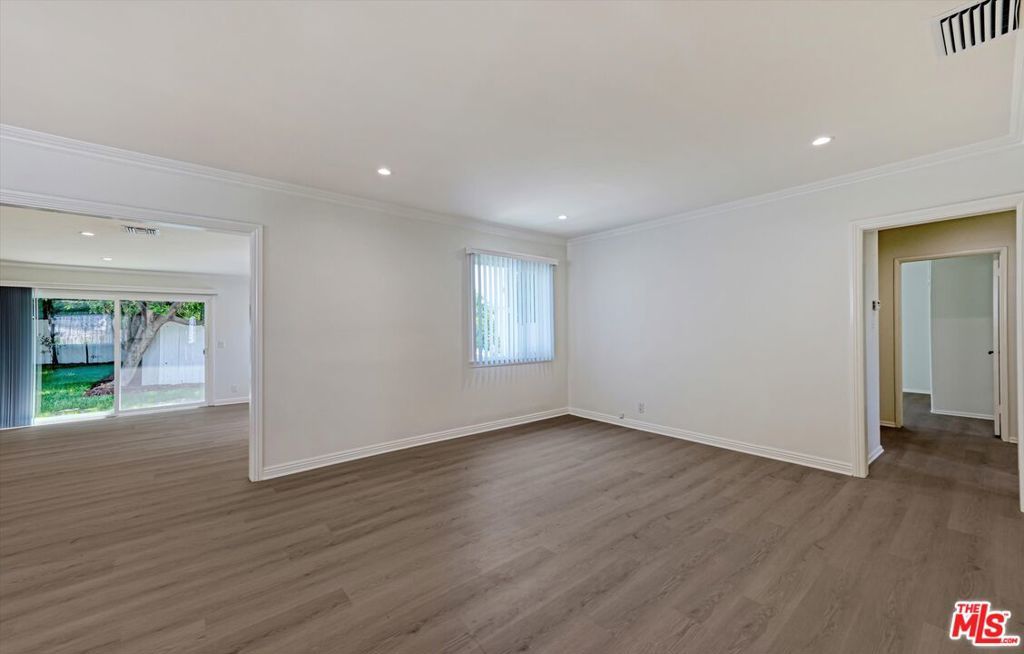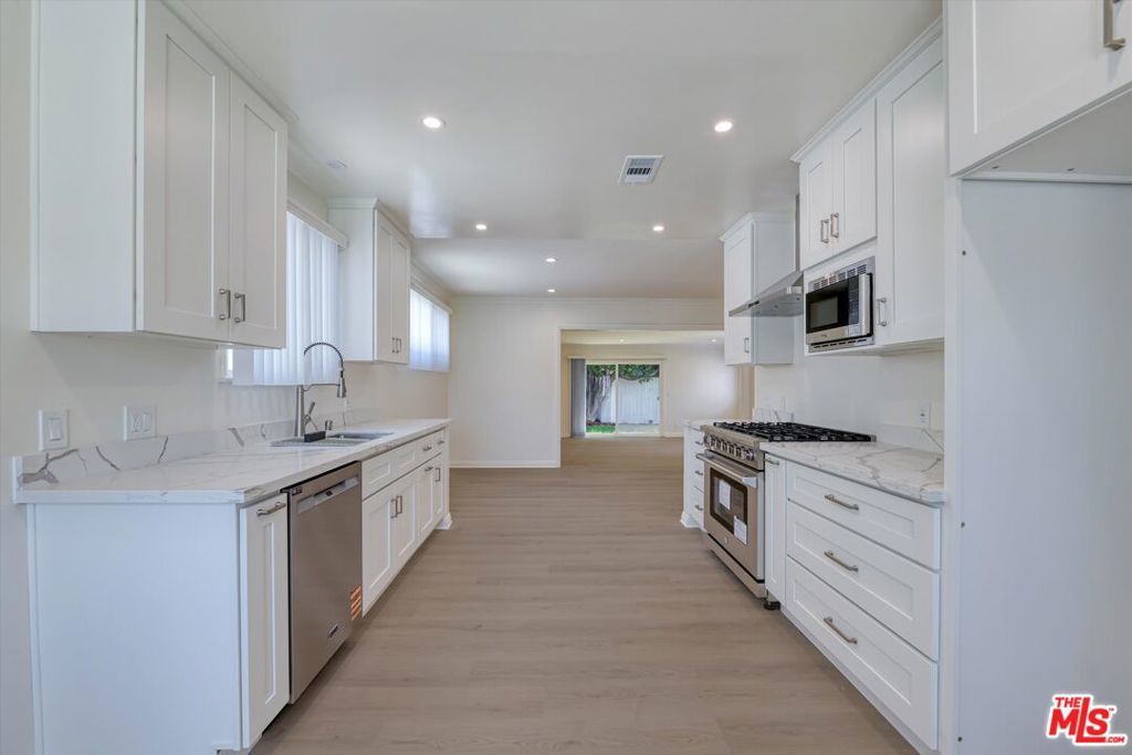 MAJOR PRICE IMPROVEMENT! Welcome to your dream home! This beautifully remodeled 3 Bedroom, 1 3/4 Bath Ranch style gem is flooded with natural light. New energy efficient windows may reduce costs while providing a bright airy feel. You'll love the open floor plan with light neutral laminate flooring that flows throughout the entire home. Spacious remodeled kitchen features new stainless steel appliances including a 6 burner range with convection oven. Additional kitchen features are sleek quartz counters, new soft close cabinetry with pull out shelves for spices and cleaning supplies, built in microwave, large pantry, broom closet, and ample space for a breakfast table. Living room and dining area boast elegant crown moldings and recessed lighting. Stylish renovated main bath has dual sinks, quartz counter, and a large lighted mirror. The Primary bedroom includes a private en-suite updated bath, ceiling fan, and chic mirrored closet doors. For added comfort, both other bedrooms feature ceiling fans as well. Laundry is a breeze with a stack washer/dryer conveniently located off the bedrooms. The generous sized family room is perfect for gatherings. Step through sliding doors to an outdoor oasis. The backyard is beautifully landscaped and complete with fruit trees. A canopy of mature trees creates an inviting space for relaxing or entertaining. Other features include central air and heat, tankless water heater, copper plumbing, new 200 amp electrical panel, and an attached 2 car garage. Nestled in a great pocket where Colbath is not a though street and has minimal traffic. Don't miss this turnkey home that combines contemporary upgrades with timeless charm.