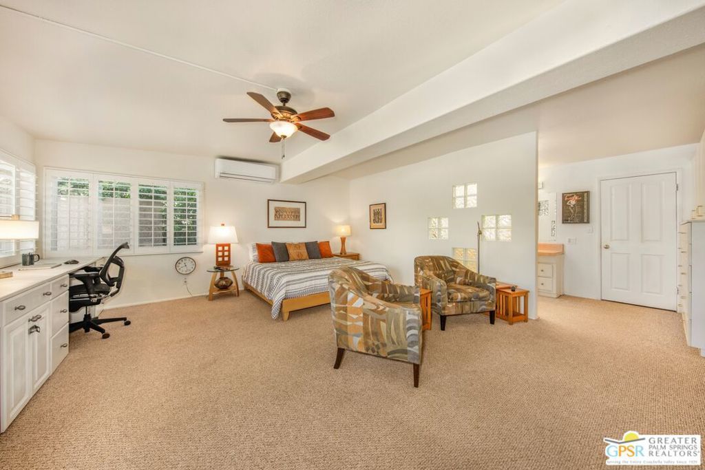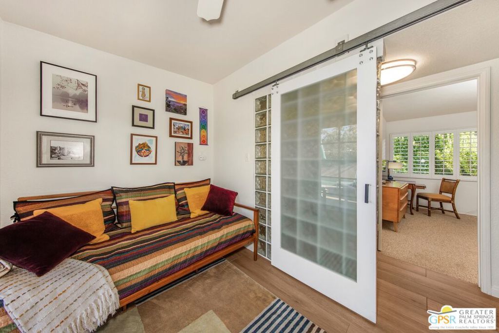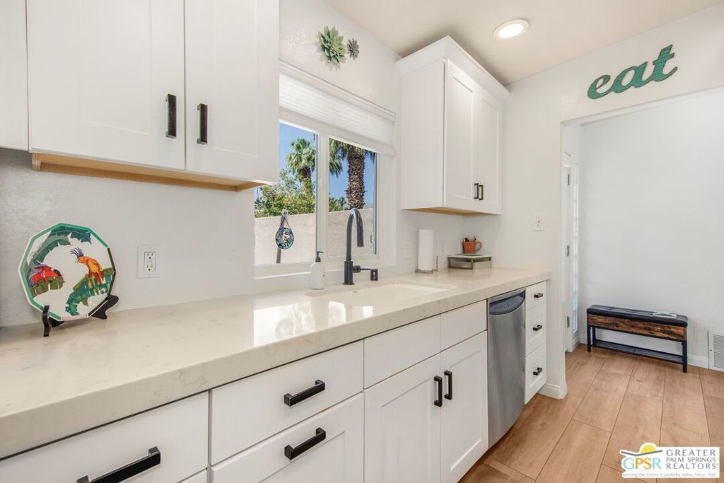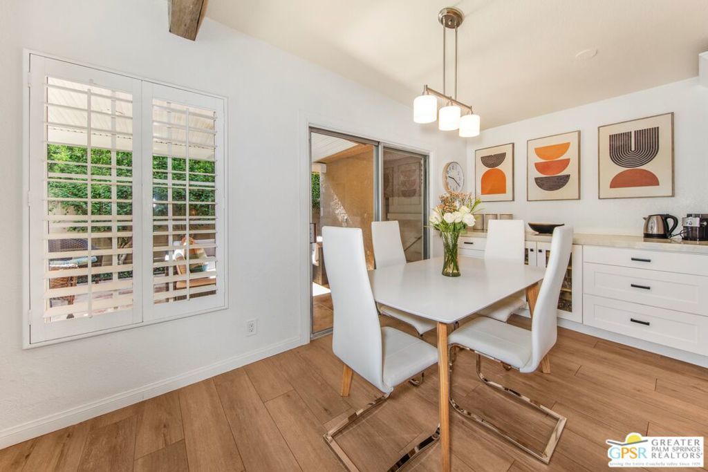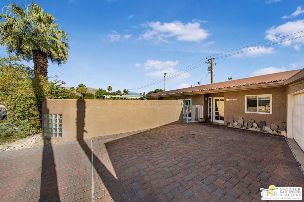 Exceptional Location in South Palm Desert! This charming Mid-Century home is ideally located within walking distance of the upscale shops and dining on the iconic El Paseo. Enjoy bike rides through the peaceful, scenic neighborhood, complete with stunning mountain views. The furnished home boasts an upgraded kitchen featuring stylish cabinetry and hardware, quartz countertops, a Koehler cast iron sink, and porcelain wood flooring throughout. The updated fireplace adds extra warmth and style to the living space. There are 2 OWNED solar systems, one for the pool and one for the house, which helps with rising electricity costs. The roof was replaced in 2024. Step outside to discover a beautifully upgraded Pebble Tech saltwater pool, a hot tub, and recently upgraded landscaping, perfect for relaxing or entertaining. Nearly every room in the home opens to outdoor patios, including a covered patio that has been added by the sellers off the living room, and the lush backyard, offering a seamless flow between indoor and outdoor living. The generous primary suite opens to a private south-facing pool area with breathtaking mountain views. The third bedroom offers flexibility, ideal as a home office or guest room. Make this your permanent home or weekend escape, this property has it all!