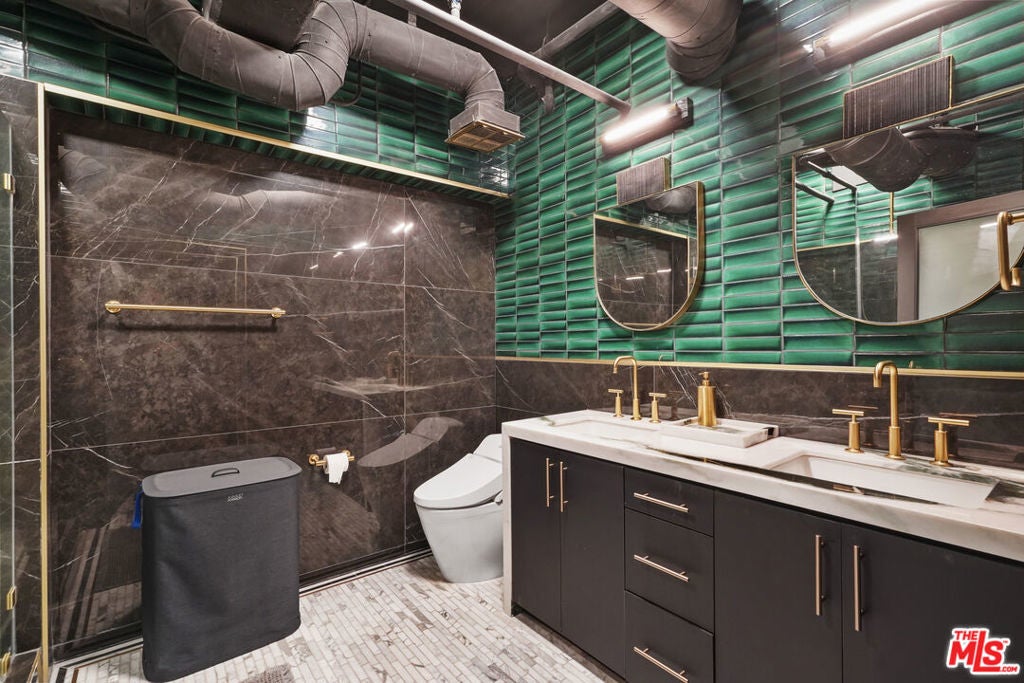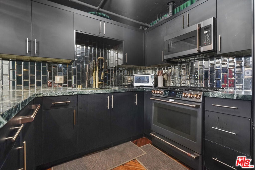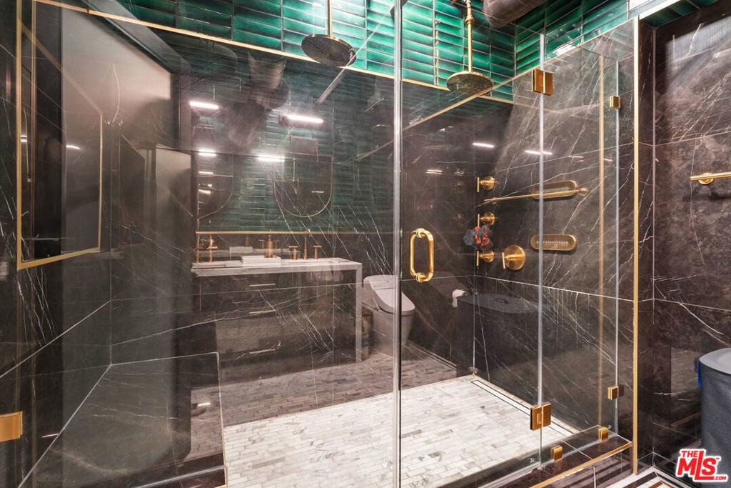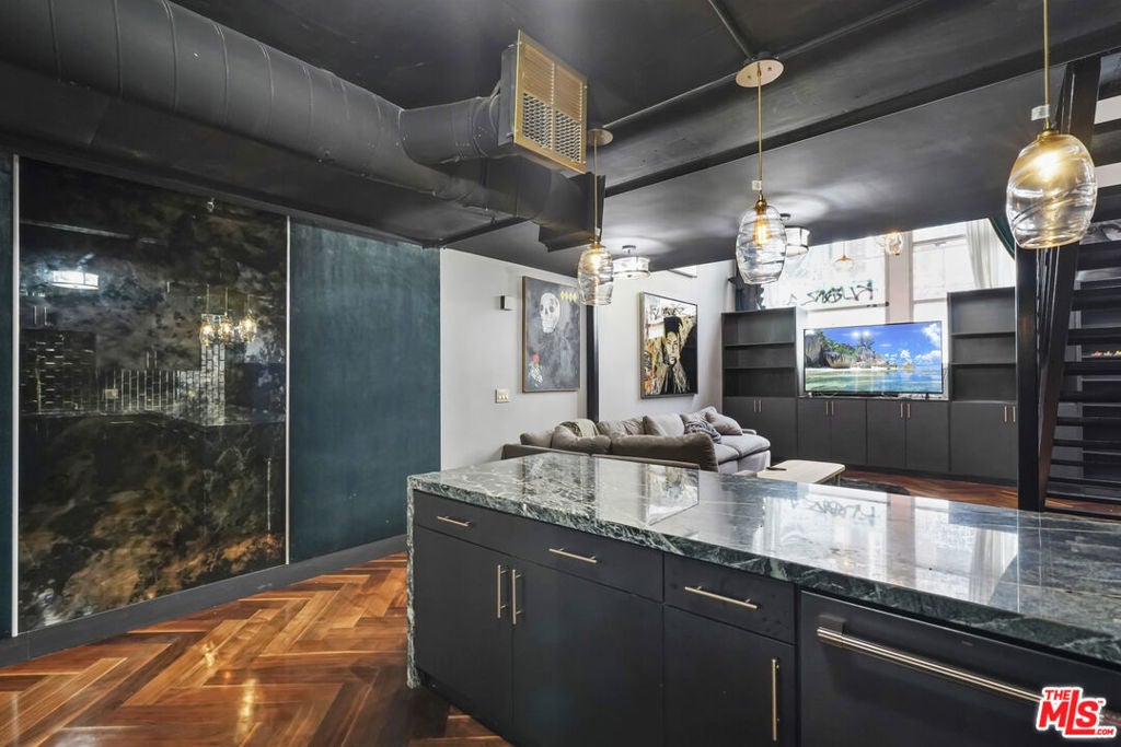 Urban Luxury Living at Flower Street Lofts! Experience elevated city living in this stunning 2-story, ground-level loft at the sought-after Flower Street Lofts, nestled in the heart of South Park, Downtown Los Angeles. Spanning appx 1,420 SF, this versatile live/work space showcases an expansive open floor plan with soaring 20+ foot ceilings and a meticulous $300K remodel featuring sophisticated, high-end finishes. Step through a dramatic entry adorned with velvet accent walls and custom LED lighting, flowing seamlessly into herringbone walnut flooring throughout. The first level offers a bedroom with built-in storage and a Murphy bed, a stylish bathroom with a large shower and extra storage space, and a gourmet kitchen featuring super matte black custom cabinetry, striking green marble countertops, and premium stainless steel appliances. Upstairs, the spacious primary suite includes custom-organized closets, a luxurious bathroom with double shower heads and sleek vanity, an in-unit washer and dryer, and a newly added custom bar- ideal for entertaining. Amenities include two secured parking spaces (one covered and one uncovered) in the adjacent structure accessed via a fourth-floor bridge. The HOA covers Spectrum package with high-speed internet, basic cable plus HBO Max and Showtime, building insurance, and water. Located just steps from LA Live, Crypto.com Arena, Whole Foods, and Ralphs, this property offers an unbeatable combination of style, comfort, and convenience, with easy freeway access and exciting new developments underway in preparation for the 2026 World Cup and 2028 Olympics.