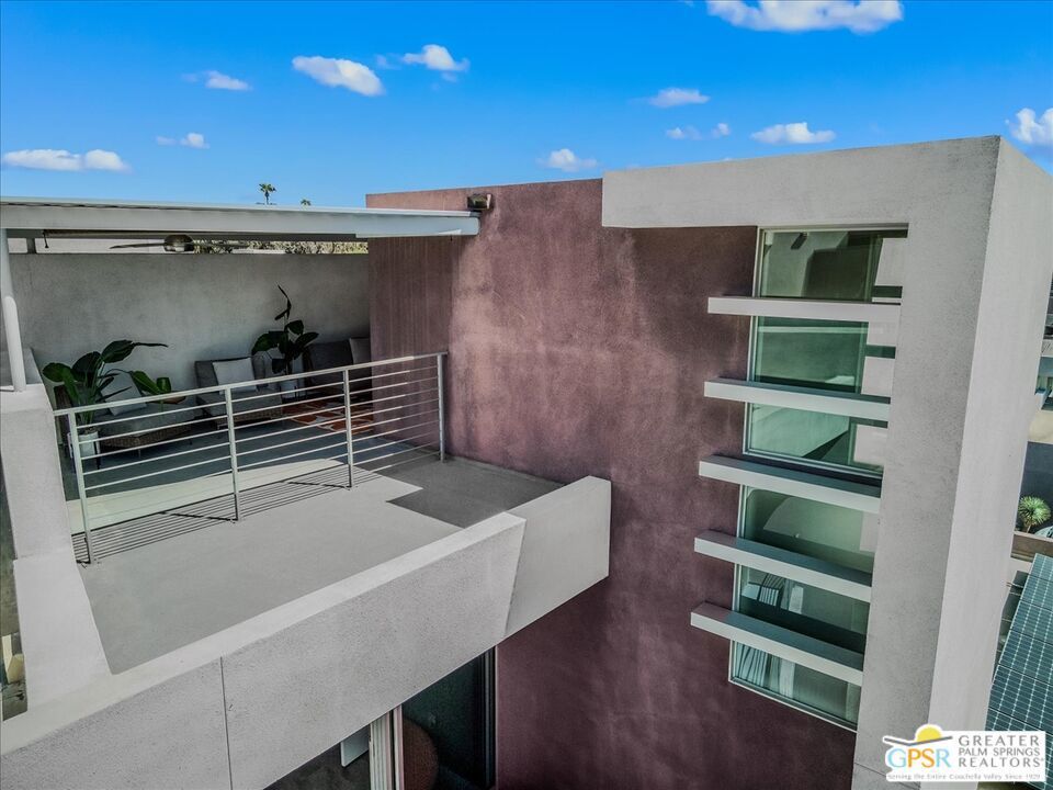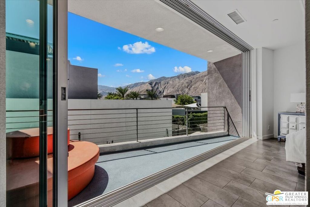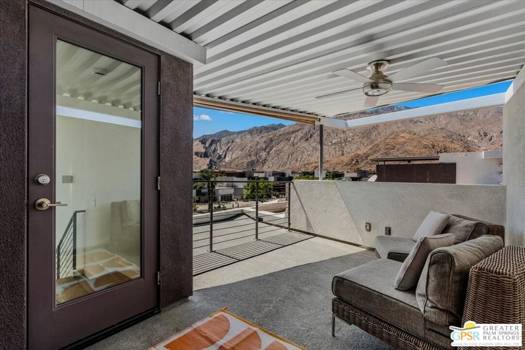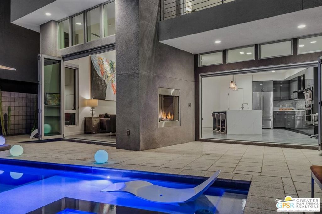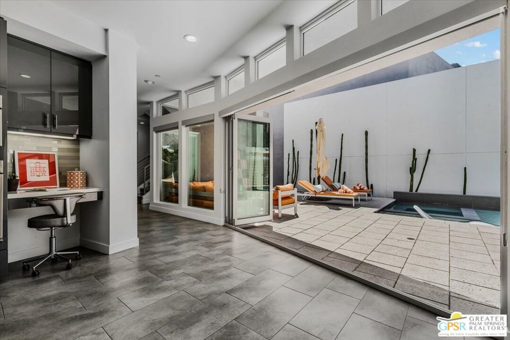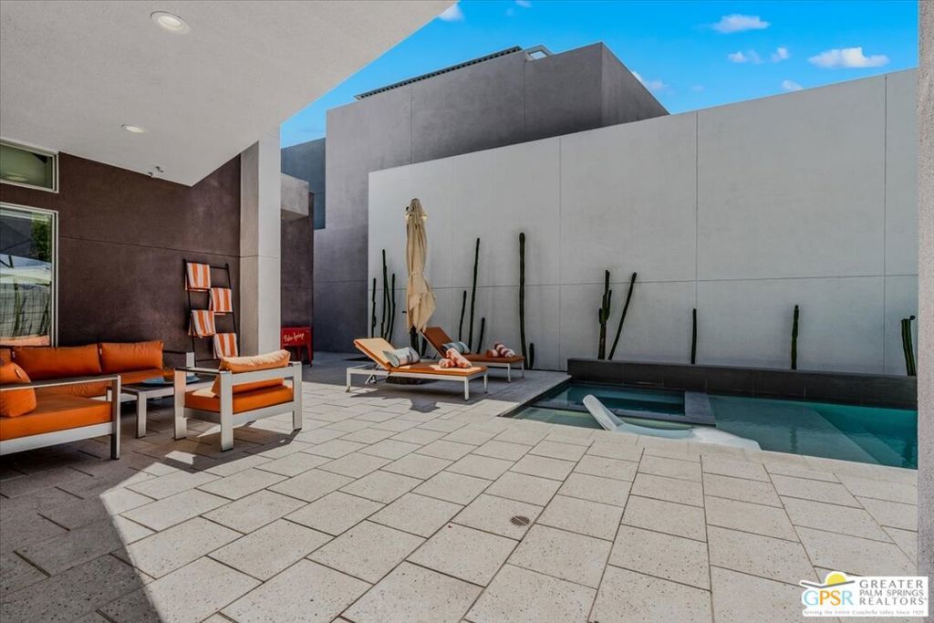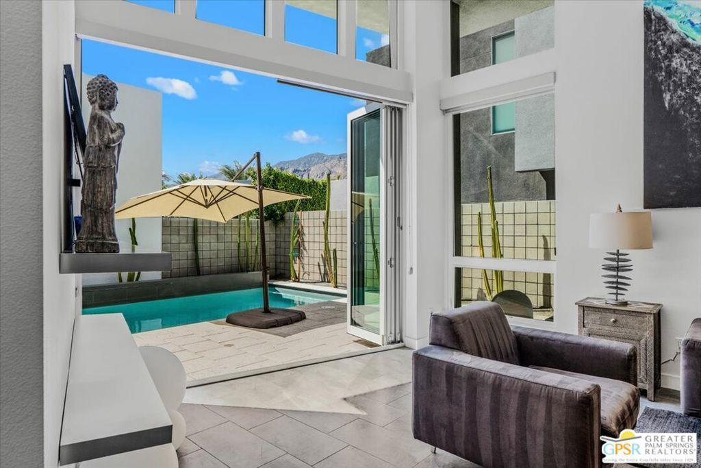 Experience the ultimate in luxury living at this stunning modern home in the highly sought-after SOL community in Palm Springs. With only 46 homes in this exclusive enclave, this spacious 2-bedroom + large loft, 4-bathroom residence blends sophistication with comfort, offering the best in desert living. The open-concept design features a chef's kitchen with high-end appliances, ideal for entertaining, and Fleetwood accordion sliders that seamlessly merge indoor and outdoor spaces, filling the home with abundant natural light. The downstairs bedroom is a private retreat, complete with an en-suite bath featuring a double shower, a large closet, and a serene private patio. Upstairs, the second bedroom boasts two walk-in closets and grand pocket sliders revealing breathtaking views. The versatile loft on the second floor can be transformed into a TV room, office, gym, or even a third bedroom. Take in panoramic views from the third-floor rooftop deck, perfect for hosting with its own bathroom and wine/beverage fridge. Outside, enjoy the private pool and spa, gas fireplace, and outdoor shower a perfect setting for relaxing or entertaining under the desert sky. Additional highlights include owned Hot Purple Energy solar panels (21 panels), a whole-house filtration system, a security system, and custom window treatments. The SOL community also offers a private dog park, electric car charging, and is just a short walk from downtown Palm Springs' vibrant shopping, entertaining, and dining scene. Don't miss the chance to own a piece of Palm Springs paradise!