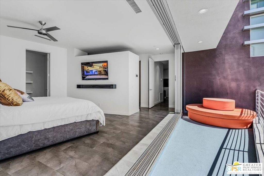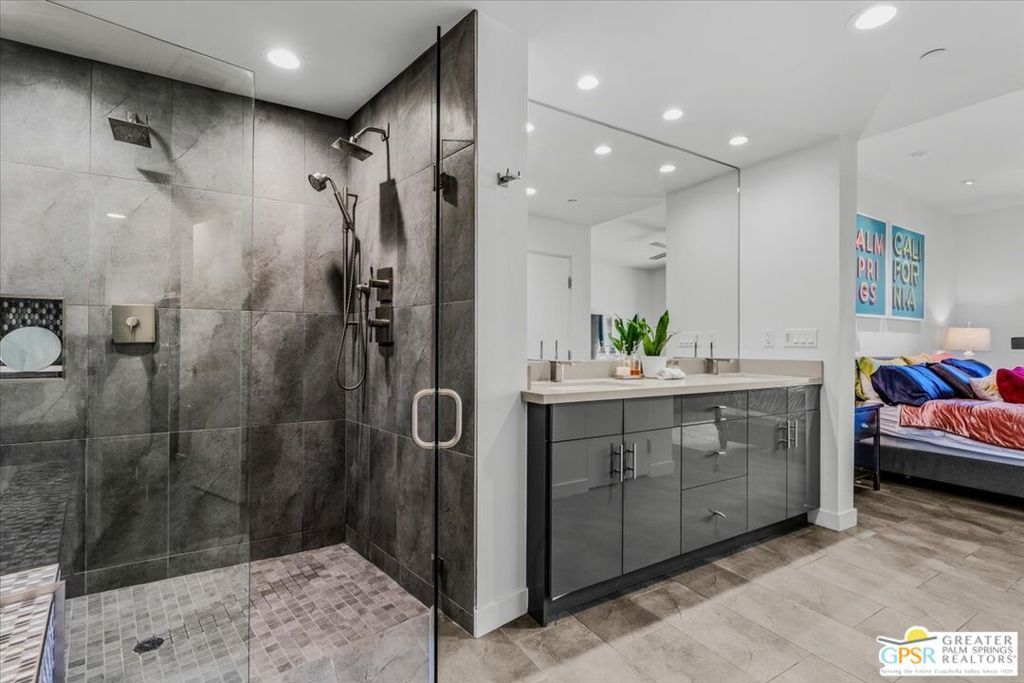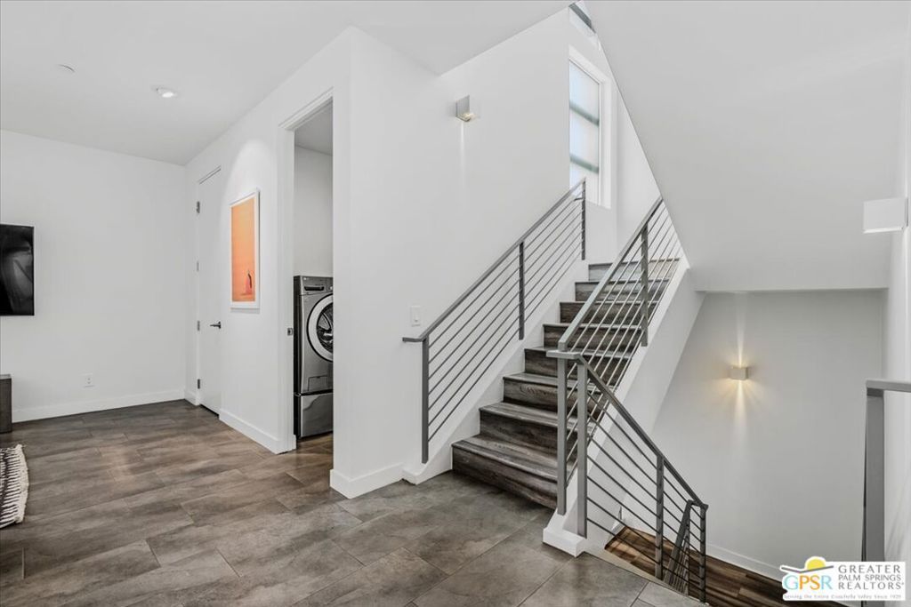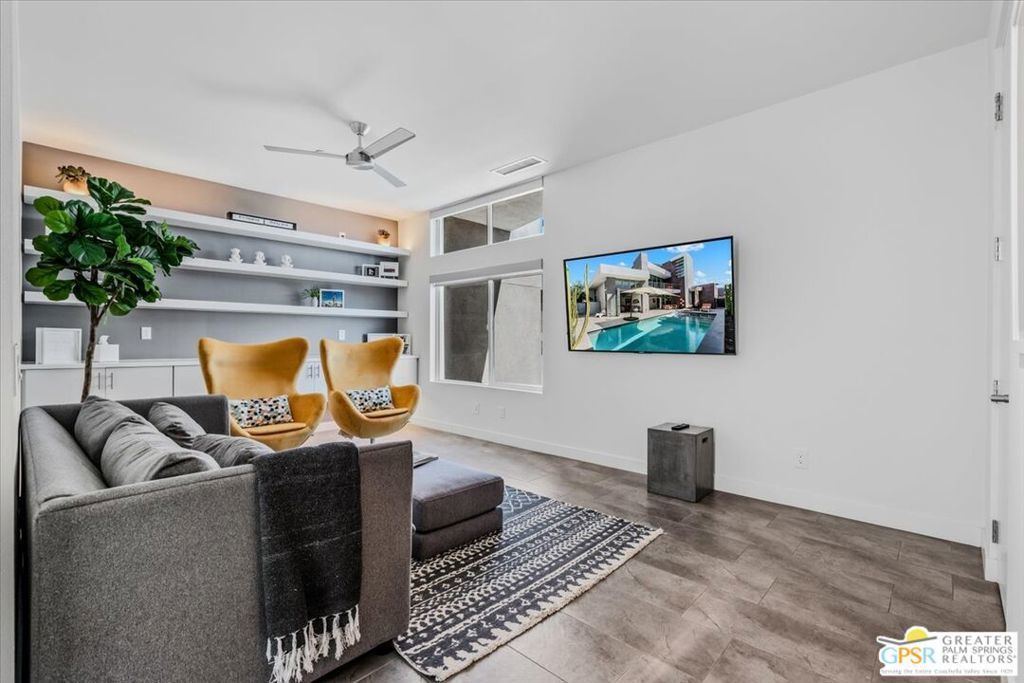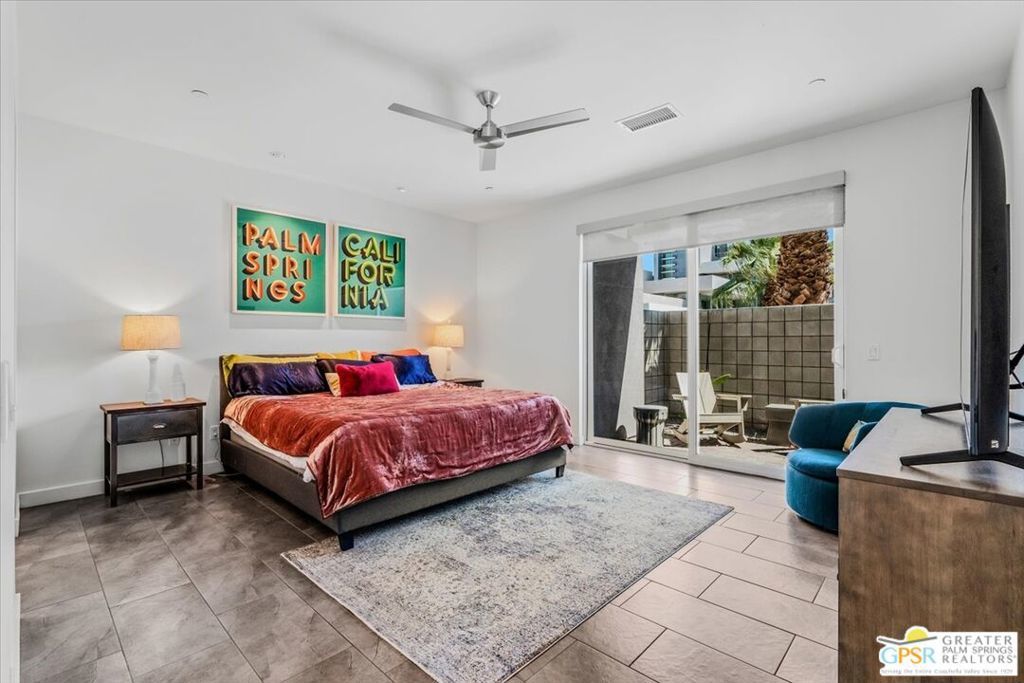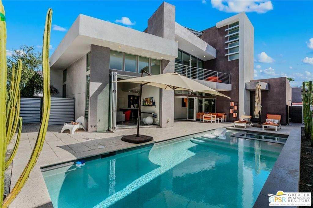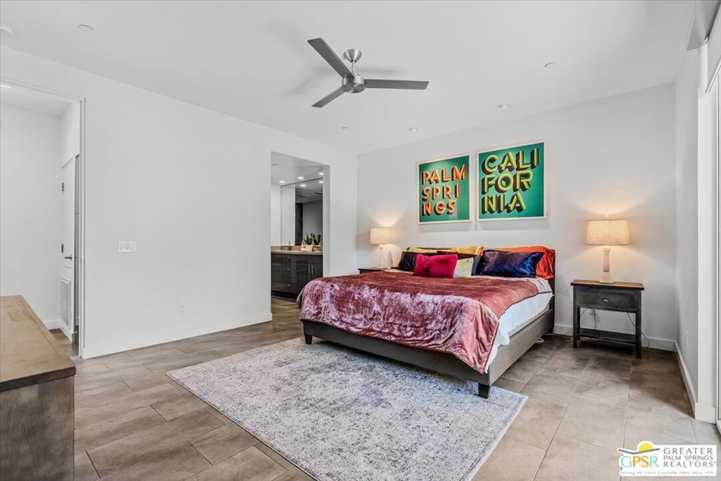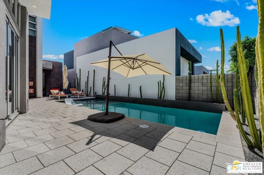 Experience the ultimate in luxury living at this stunning modern home in the highly sought-after SOL community in Palm Springs. With only 46 homes in this exclusive enclave, this spacious 2-bedroom + large loft, 4-bathroom residence blends sophistication with comfort, offering the best in desert living. The open-concept design features a chef's kitchen with high-end appliances, ideal for entertaining, and Fleetwood accordion sliders that seamlessly merge indoor and outdoor spaces, filling the home with abundant natural light. The downstairs bedroom is a private retreat, complete with an en-suite bath featuring a double shower, a large closet, and a serene private patio. Upstairs, the second bedroom boasts two walk-in closets and grand pocket sliders revealing breathtaking views. The versatile loft on the second floor can be transformed into a TV room, office, gym, or even a third bedroom. Take in panoramic views from the third-floor rooftop deck, perfect for hosting with its own bathroom and wine/beverage fridge. Outside, enjoy the private pool and spa, gas fireplace, and outdoor shower a perfect setting for relaxing or entertaining under the desert sky. Additional highlights include owned Hot Purple Energy solar panels (21 panels), a whole-house filtration system, a security system, and custom window treatments. The SOL community also offers a private dog park, electric car charging, and is just a short walk from downtown Palm Springs' vibrant shopping, entertaining, and dining scene. Don't miss the chance to own a piece of Palm Springs paradise!