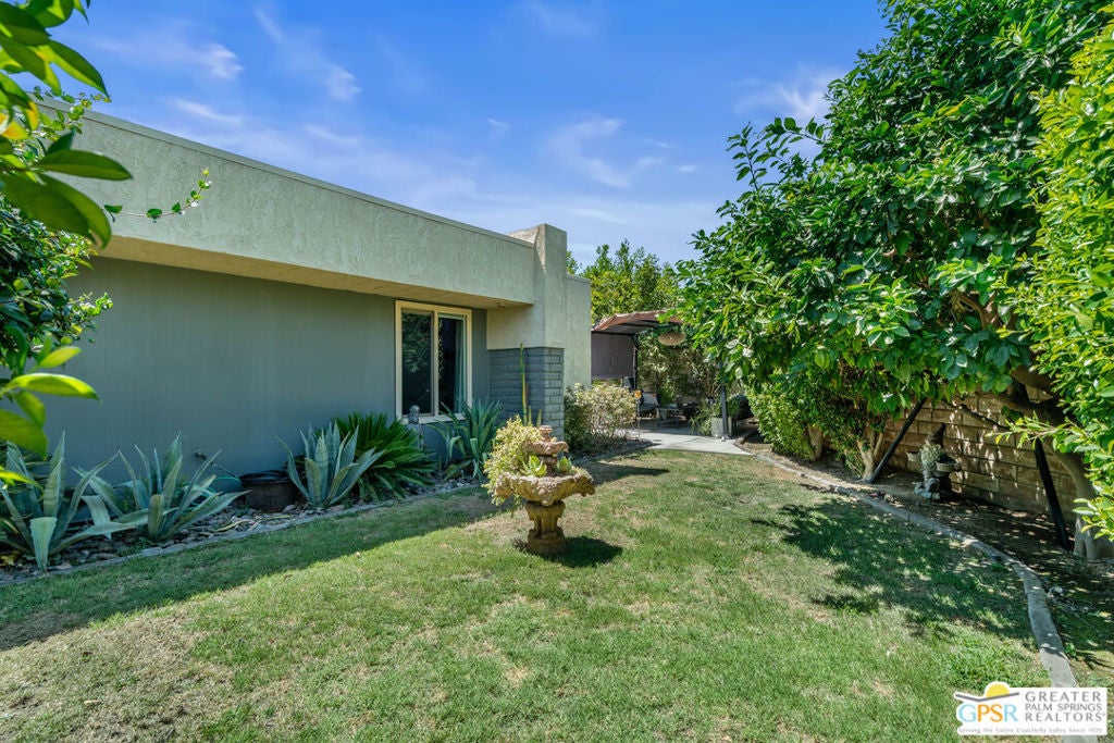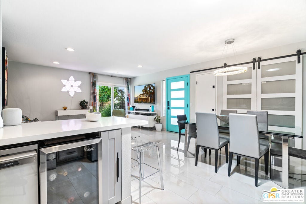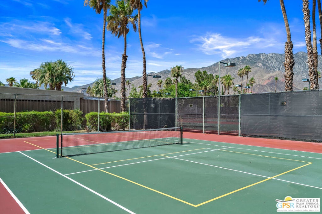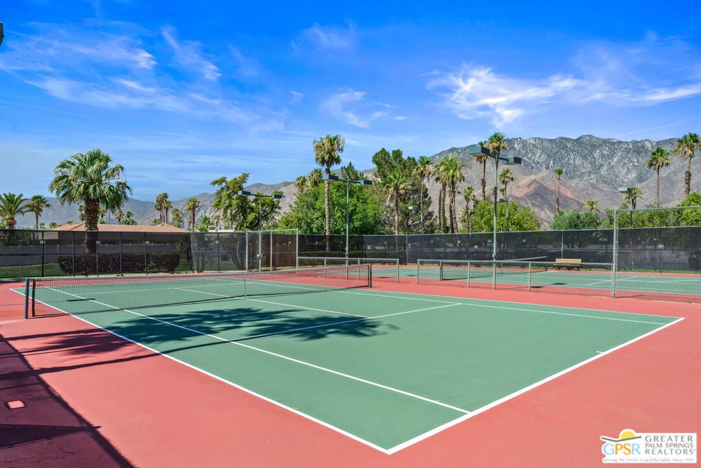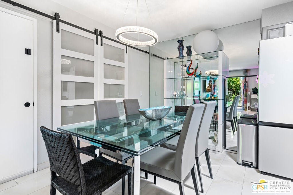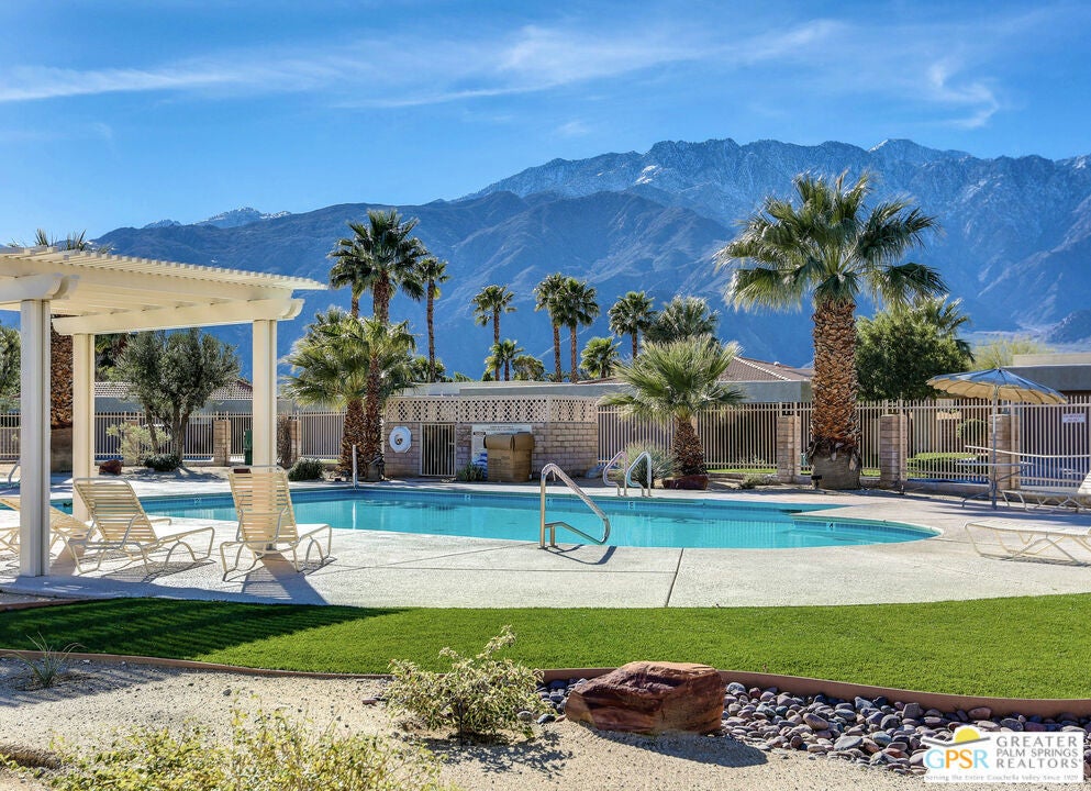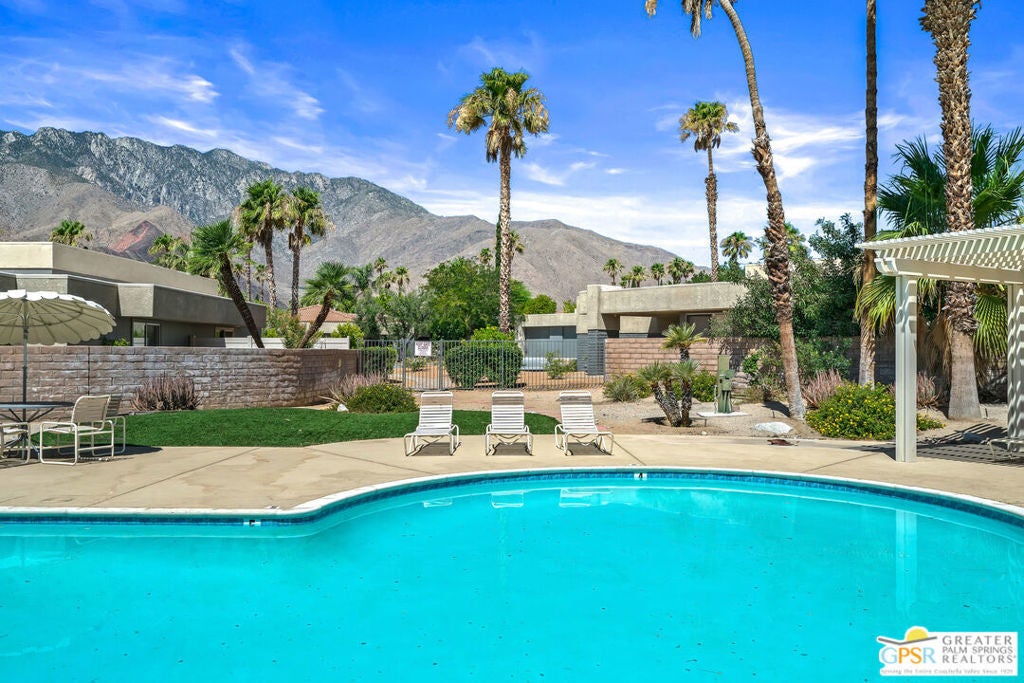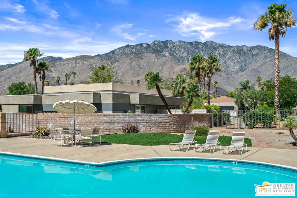 Desert-chic living with this beautifully remodeled modern condo, featuring sophisticated upgrades and refined finishes throughout. Sleek tile flooring flows through every room, complemented by abundant natural light and a crisp, contemporary aesthetic. The well-designed layout includes a walk-in closet, inside laundry, and a direct-access single-car garage with epoxy flooring. The gourmet kitchen stands out with updated appliances and stylish designer detailsperfect for both everyday comfort and effortless entertaining. As a premier end unit, this home enjoys expansive wraparound patios and a generous private yard, creating seamless indoor-outdoor living. Located in an exceptional community offering multiple pools and spas, along with tennis, basketball, and pickleball courts, this residence delivers the ultimate Palm Springs lifestyle.