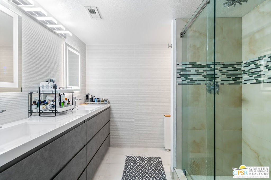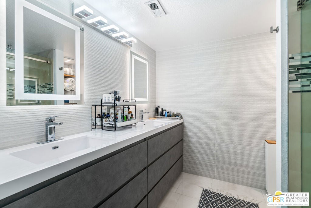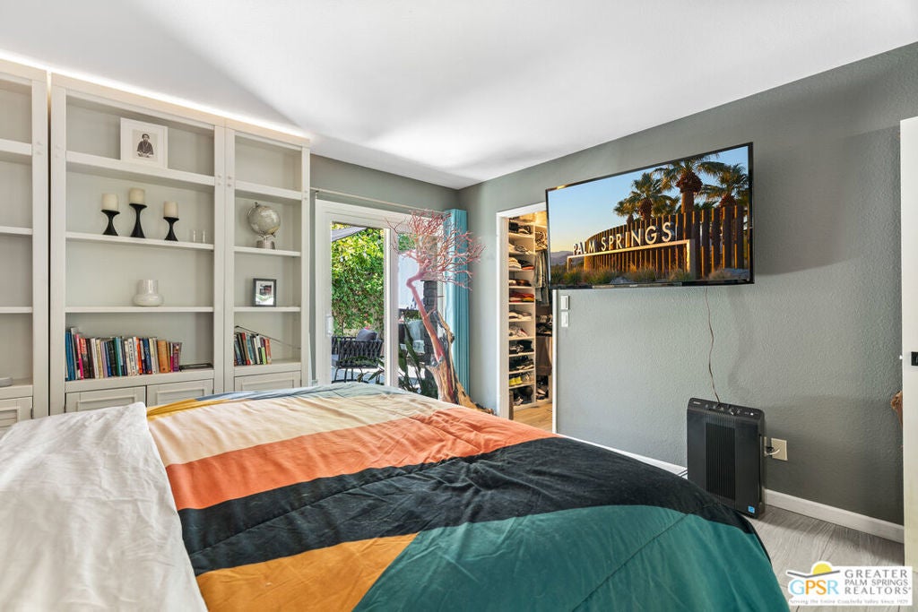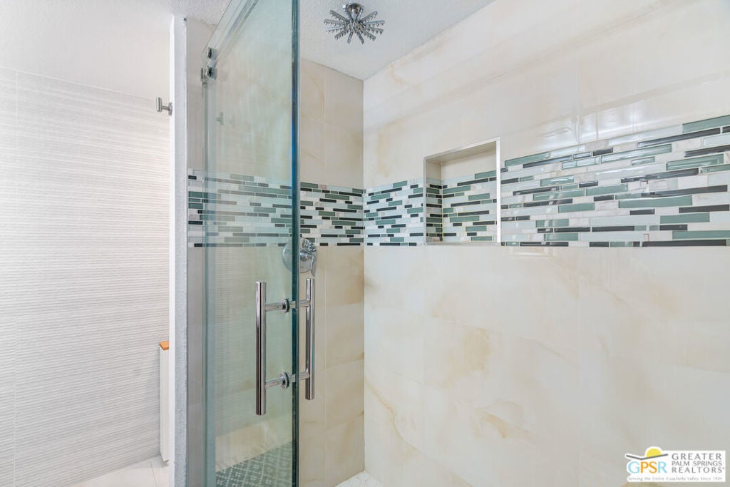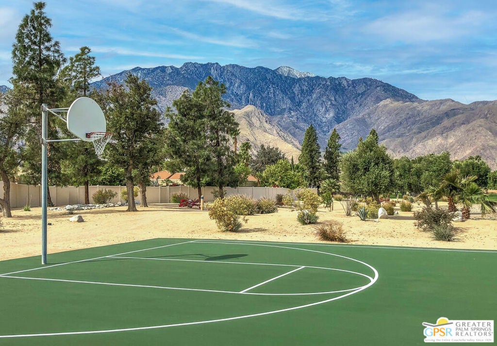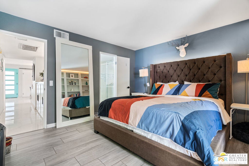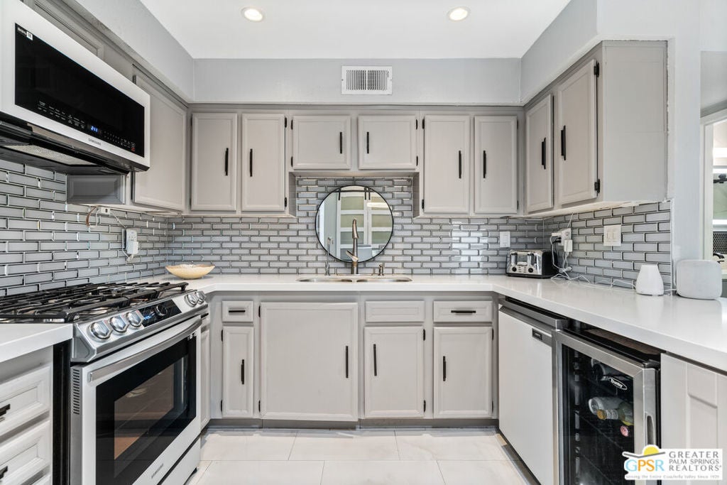 Desert-chic living with this beautifully remodeled modern condo, featuring sophisticated upgrades and refined finishes throughout. Sleek tile flooring flows through every room, complemented by abundant natural light and a crisp, contemporary aesthetic. The well-designed layout includes a walk-in closet, inside laundry, and a direct-access single-car garage with epoxy flooring. The gourmet kitchen stands out with updated appliances and stylish designer detailsperfect for both everyday comfort and effortless entertaining. As a premier end unit, this home enjoys expansive wraparound patios and a generous private yard, creating seamless indoor-outdoor living. Located in an exceptional community offering multiple pools and spas, along with tennis, basketball, and pickleball courts, this residence delivers the ultimate Palm Springs lifestyle.