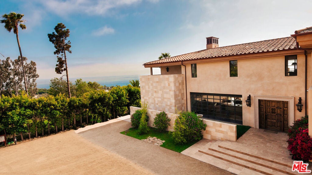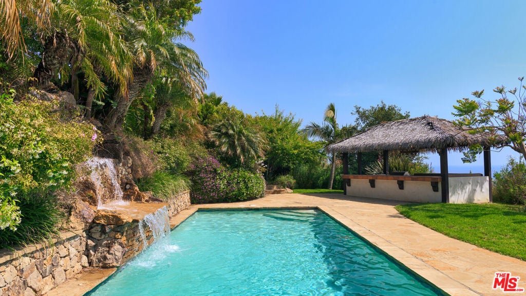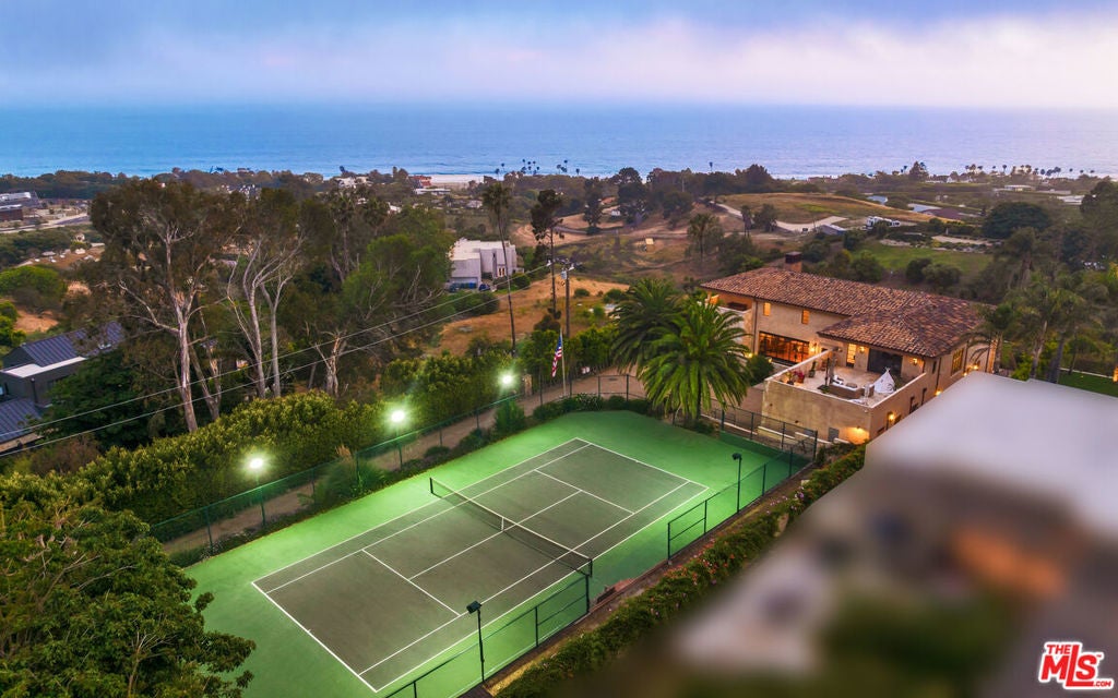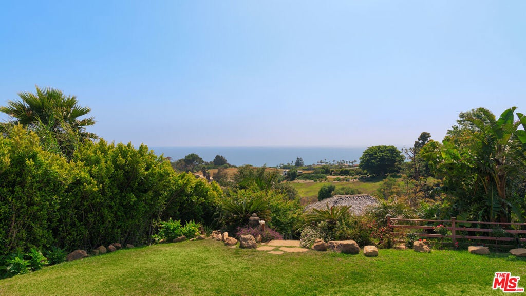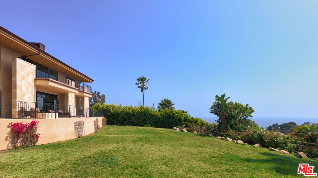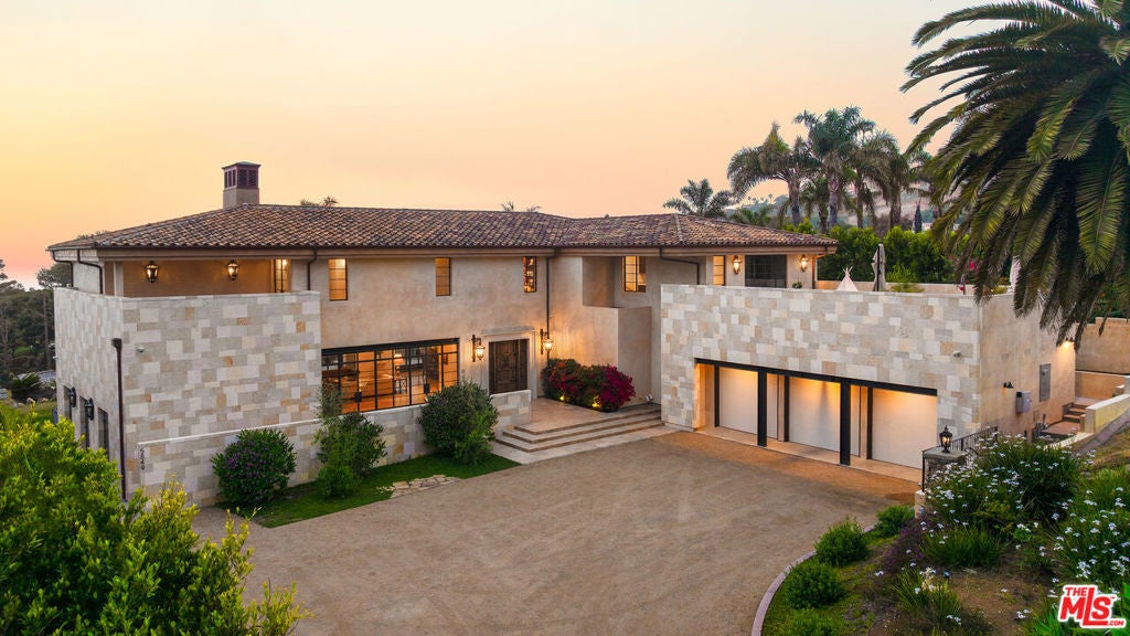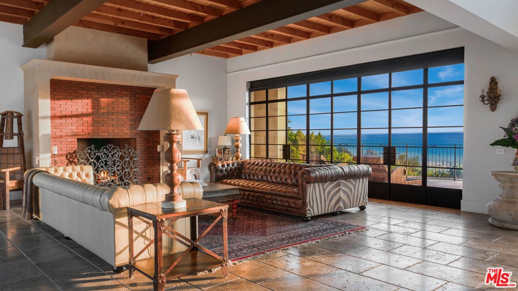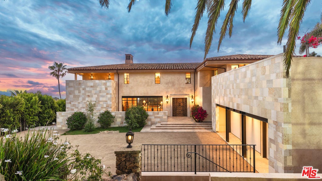 Tucked beyond a long, gated gravel driveway and nestled on nearly two private acres, this masterfully rebuilt estate offers an unmatched blend of refined craftsmanship and timeless design. Reimagined after 2018 with a commitment to non-toxic materials and natural finishes, the home is wrapped in imported stone sourced from an 850-year-old French chateau and features handcrafted doors from Arizona. Throughout the property, warm travertine and French oak floors meet artisan details like river bronze finishes and old-world character. Powered by a solar panel system and equipped with central heating and radiant warm board flooring, this residence is as sustainable as it is elegant. The front yard welcomes with manicured hedges, a peaceful fountain, and an expansive lawn. A grand wooden door opens to the main living area with soaring wood-beamed ceilings, a brick fireplace, and walls of glass-and-metal French doors framing panoramic ocean views. The open floor plan flows into the dining room, where double-height ceilings and a statement chandelier overlook the ocean-facing deck.The kitchen blends functionality and beauty with marble countertops, gold accents, and a large center island. Premium appliances include dual Cove dishwashers, Sub-Zero refrigeration, Wolf steam and microwave ovens, a six-burner cooktop with hood, and dual sinks one with a view of the ocean. A hidden bar with wine fridge complements the space, while a butler's pantry provides additional marble counter space, wine storage, and access to the backyard.The ocean-view deck spans the length of the home, with covered dining, a fire pit, and sweeping coastal views. Below, a flagstone terrace surrounds a sleek rectangular pool with a dramatic waterfall, framed by fruit trees and grassy lawns. The pool house includes built-in bar seating, a mini fridge, and barbecue station perfect for entertaining. Inside, an elevator connects all three levels. A hallway leads to a powder room with imported French tiles and a bonus room ideal for a projector theater. A three-car garage sits adjacent, while the lower level features a 2,000-bottle wine cellar with cigar storage, a second powder room, and a stone-tiled gym. The elevator's mechanical room and tankless heating system round out this level.Upstairs, the guest bedroom opens to a spacious ocean-view deck and features a steam shower, bidet, and generous closet. Additional bedrooms include covered balconies, built-ins, and a shared bath with double vanities. A dedicated laundry room is equipped with Electrolux machines and ample storage. An elevated office overlooks the living room, offering custom shelving, vaulted beamed ceilings, and unobstructed ocean views. The primary suite is a true sanctuary with high vaulted ceilings, a fireplace, French doors to a private balcony, and whitewater views. The ensuite bath includes a freestanding tub, double vanities, and a double-entry shower wrapped in rare stone. Two large dressing rooms complete the suite.Outside, enjoy citrus trees, a tennis court with lighting, lush gardens, hiking trails, and the calming sound of ocean waves. Offered fully furnished, this coastal retreat blends luxury living with mindful design.