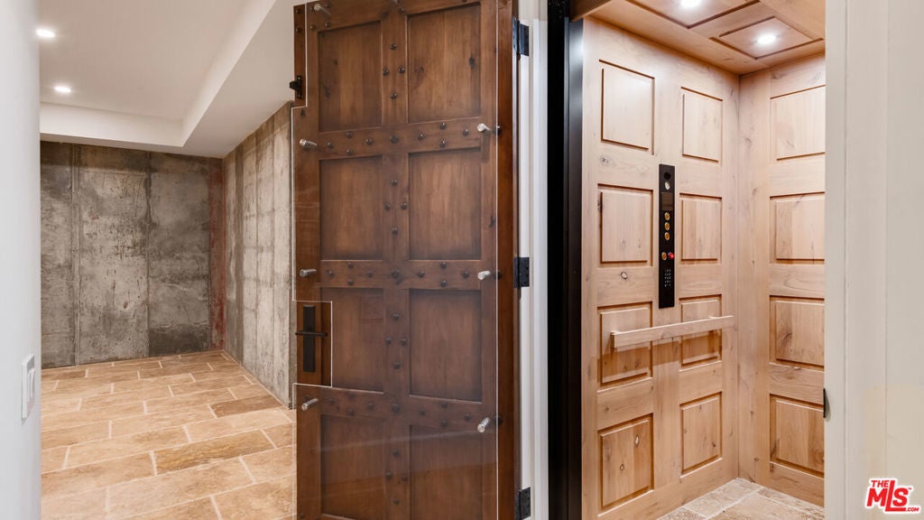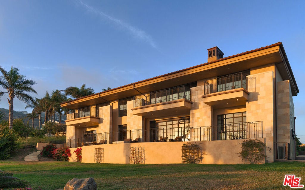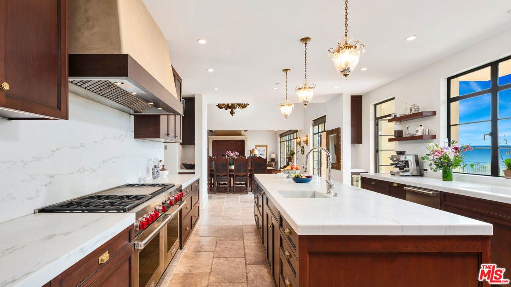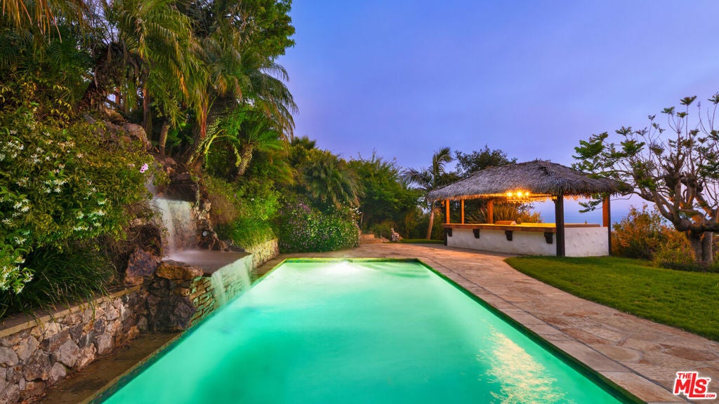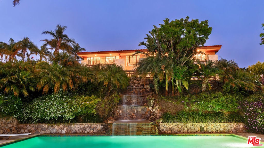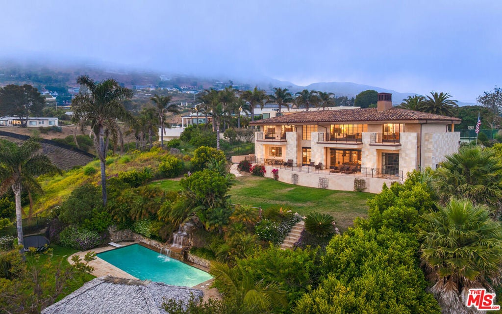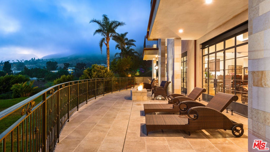 Tucked beyond a long, gated gravel driveway and nestled on nearly two private acres, this masterfully rebuilt estate offers an unmatched blend of refined craftsmanship and timeless design. Reimagined after 2018 with a commitment to non-toxic materials and natural finishes, the home is wrapped in imported stone sourced from an 850-year-old French chateau and features handcrafted doors from Arizona. Throughout the property, warm travertine and French oak floors meet artisan details like river bronze finishes and old-world character. Powered by a solar panel system and equipped with central heating and radiant warm board flooring, this residence is as sustainable as it is elegant. The front yard welcomes with manicured hedges, a peaceful fountain, and an expansive lawn. A grand wooden door opens to the main living area with soaring wood-beamed ceilings, a brick fireplace, and walls of glass-and-metal French doors framing panoramic ocean views. The open floor plan flows into the dining room, where double-height ceilings and a statement chandelier overlook the ocean-facing deck.The kitchen blends functionality and beauty with marble countertops, gold accents, and a large center island. Premium appliances include dual Cove dishwashers, Sub-Zero refrigeration, Wolf steam and microwave ovens, a six-burner cooktop with hood, and dual sinks one with a view of the ocean. A hidden bar with wine fridge complements the space, while a butler's pantry provides additional marble counter space, wine storage, and access to the backyard.The ocean-view deck spans the length of the home, with covered dining, a fire pit, and sweeping coastal views. Below, a flagstone terrace surrounds a sleek rectangular pool with a dramatic waterfall, framed by fruit trees and grassy lawns. The pool house includes built-in bar seating, a mini fridge, and barbecue station perfect for entertaining. Inside, an elevator connects all three levels. A hallway leads to a powder room with imported French tiles and a bonus room ideal for a projector theater. A three-car garage sits adjacent, while the lower level features a 2,000-bottle wine cellar with cigar storage, a second powder room, and a stone-tiled gym. The elevator's mechanical room and tankless heating system round out this level.Upstairs, the guest bedroom opens to a spacious ocean-view deck and features a steam shower, bidet, and generous closet. Additional bedrooms include covered balconies, built-ins, and a shared bath with double vanities. A dedicated laundry room is equipped with Electrolux machines and ample storage. An elevated office overlooks the living room, offering custom shelving, vaulted beamed ceilings, and unobstructed ocean views. The primary suite is a true sanctuary with high vaulted ceilings, a fireplace, French doors to a private balcony, and whitewater views. The ensuite bath includes a freestanding tub, double vanities, and a double-entry shower wrapped in rare stone. Two large dressing rooms complete the suite.Outside, enjoy citrus trees, a tennis court with lighting, lush gardens, hiking trails, and the calming sound of ocean waves. Offered fully furnished, this coastal retreat blends luxury living with mindful design.