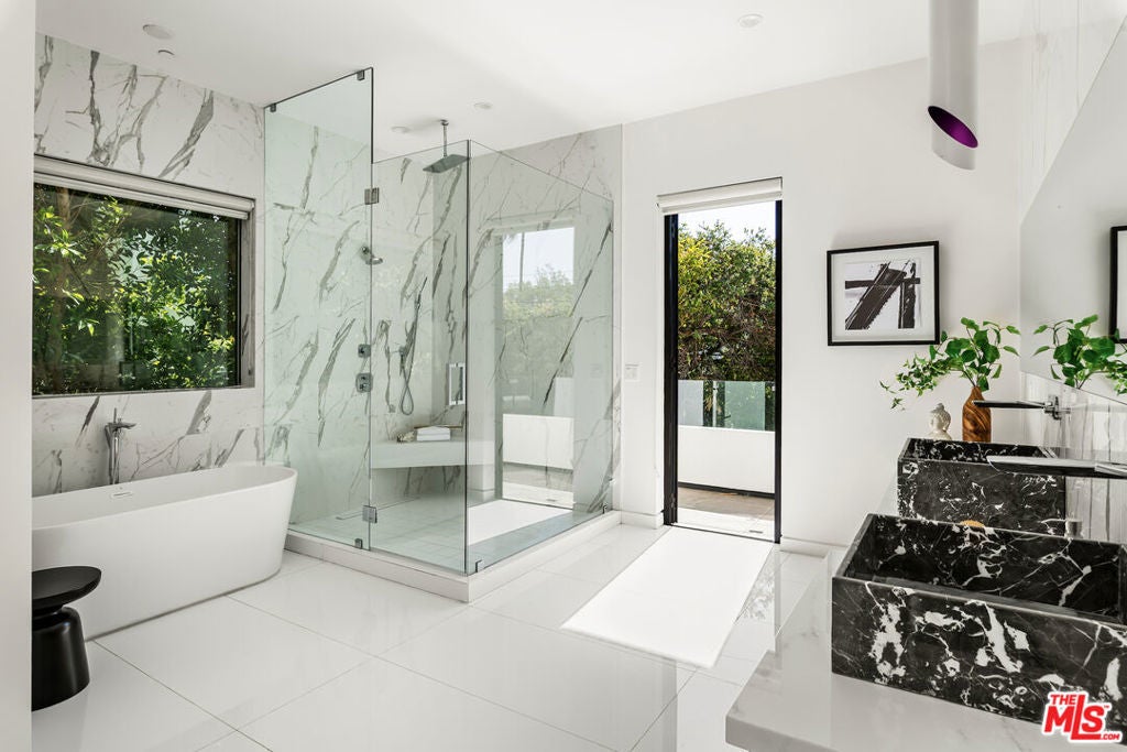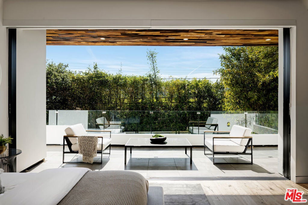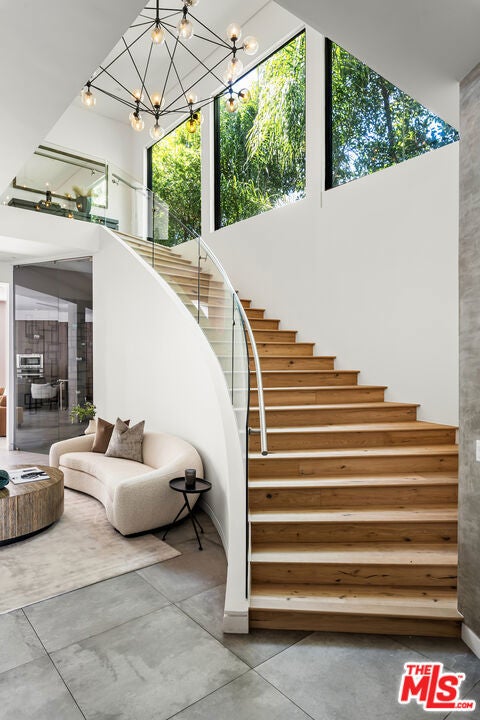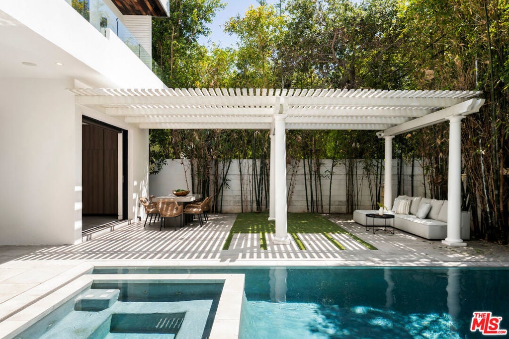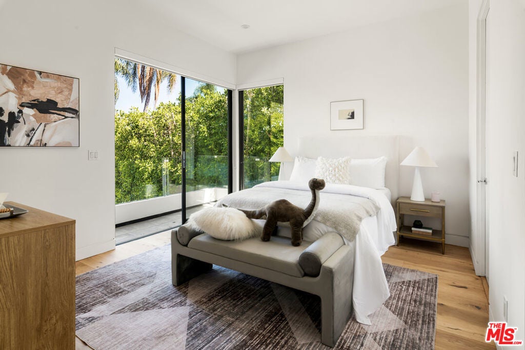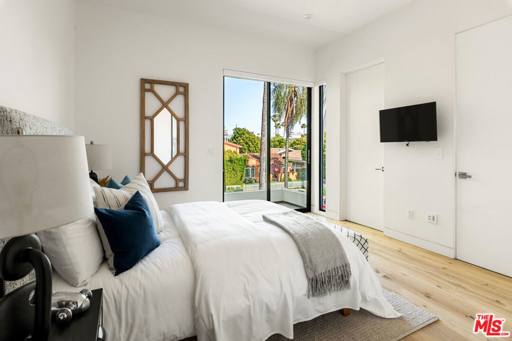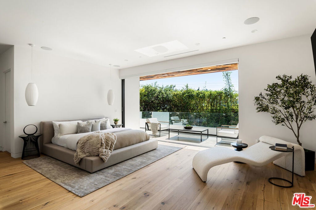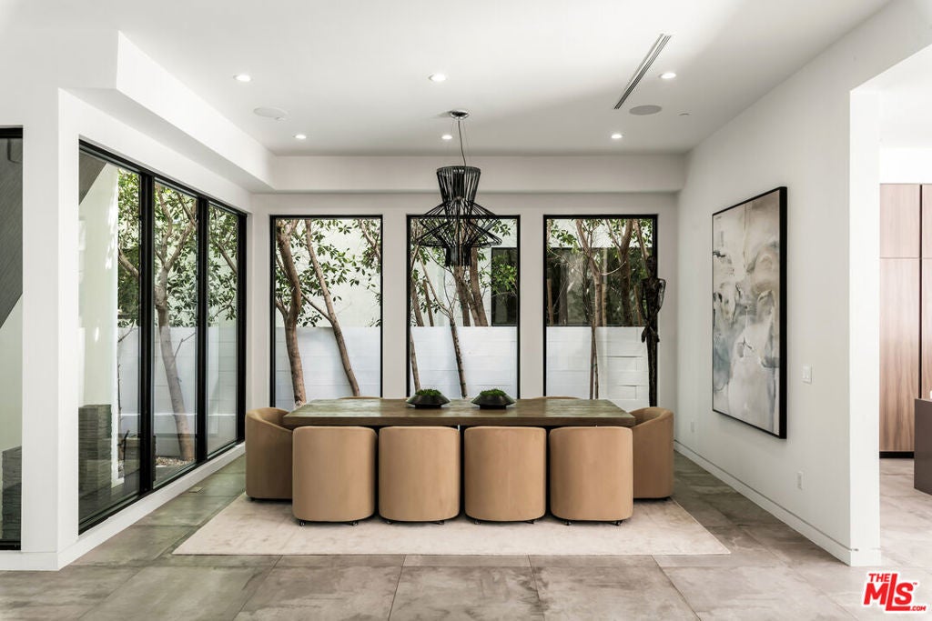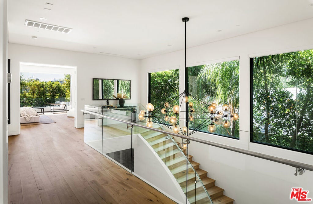 Dramatic entry with soaring ceilings and a stunning natural oak wood staircase set the stage for this timeless 5-bedroom, 6-bath residence. The main level offers formal and casual living rooms, a sleek fireplace, private office, chic powder room, and a climate-controlled glass-encased wine room. A downstairs en-suite bedroom provides comfort for guests or flexible use. At the heart of the home, the chef's kitchen features bespoke cabinetry, professional appliances, and a striking island, opening seamlessly to the resort-style backyard with pool, spa, cabana, and multiple lounge areas. Upstairs, the primary suite redefines luxury with a fireplace, dual walk-in closets, spa bath, and expansive balcony lounge. Three additional en-suite bedrooms complete the upper level. A formal dining room, stylish upstairs laundry, and two-car garage round out the home. Located near Larchmont, Paramount, and Melrose, this residence blends modern luxury with California indoor-outdoor living.