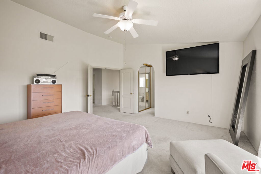 Nestled within the highly sought-after Porter Ranch Estates, this beautifully maintained 4-bedroom, 3-bathroom residence offers a perfect blend of comfort, space, and security, all set against a backdrop of sweeping city and mountain views. Located in a prestigious 24-hour guard-gated community, this light-filled home showcases an inviting floor plan designed for effortless everyday living and elegant entertaining. Step through the grand double-door entry into a welcoming foyer adorned with gleaming tile floors and an abundance of natural light. The spacious formal living and dining areas are framed by oversized windows that fill the home with warmth and offer serene views of the lush backyard and surrounding hillsides. These open-concept spaces create a seamless flow ideal for gatherings both large and small. The generously sized chef's kitchen features classic granite countertops, ample cabinetry, and a cozy casual dining area, making it a hub for meal prep and family time. Just beyond, the comfortable family room offers a cozy fireplace and direct access to the attached two-car garage, along with sliding doors that lead out to the backyard, perfect for indoor-outdoor living. Also on the main level, you'll find a bathroom and a dedicated laundry room with extra storage, enhancing the home's everyday functionality. Upstairs, retreat to the expansive primary suite, a true sanctuary with large windows that frame panoramic views, a spacious walk-in closet, and a private en-suite bath. Three additional upstairs bedrooms offer plenty of space for family, guests, or a home office, and share a well-appointed hall bathroom. Outside, enjoy a grassy backyard oasis with ample room for play, relaxation, and al fresco dining all with unobstructed city lights and mountain views that create a picturesque setting from dawn to dusk. Experience the ultimate in resort-style living with community amenities such as a shimmering pools, relaxing spa, designated BBQ areas, and scenic picnic spaces. You'll also love the convenience of being near the lively Vineyards shopping center, home to popular dining spots like Lure Fish house and Patxi's Pizza, upscale retailers like Whole Foods, and a modern AMC theater for all your entertainment needs.