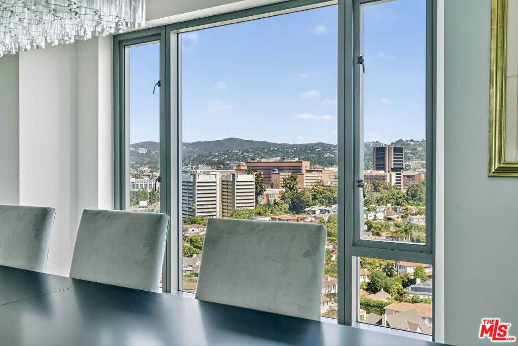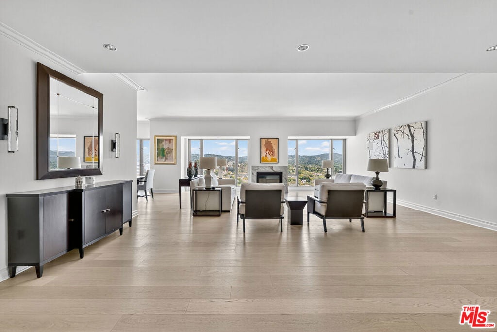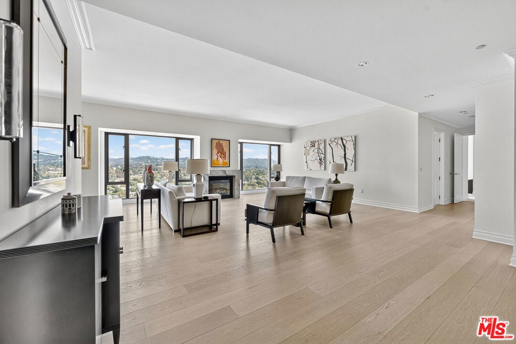 Unique high floor North facing Residence at The Remington offers elegant, full-service high-rise living in one of the Wilshire Corridor's most prestigious addresses. Located in the quiet rear corner of the building, this sophisticated home showcases sweeping 180-degree views of Westwood and Bel Air through sound-attenuating, floor-to-ceiling windows. Direct elevator access opens to a private foyer and expansive great room with 10-foot ceilings, marble and hardwood floors, a gas fireplace, and custom crown moldings. The state-of-the-art kitchen features premium appliances and custom cabinetry, while an adjacent family room or study provides flexible living space. The oversized primary suite includes dual walk-in closets and luxurious his-and-hers marble baths, both recently redone with exquisite finishes. Additional highlights include a large laundry room, custom built-ins, and multiple balconies ideal for enjoying panoramic city views.Residents enjoy 24-hour valet and concierge, a fitness center, lap pool, spa, private library, wine storage, and beautifully landscaped gardens all moments from UCLA, Century City, and Beverly Hills.