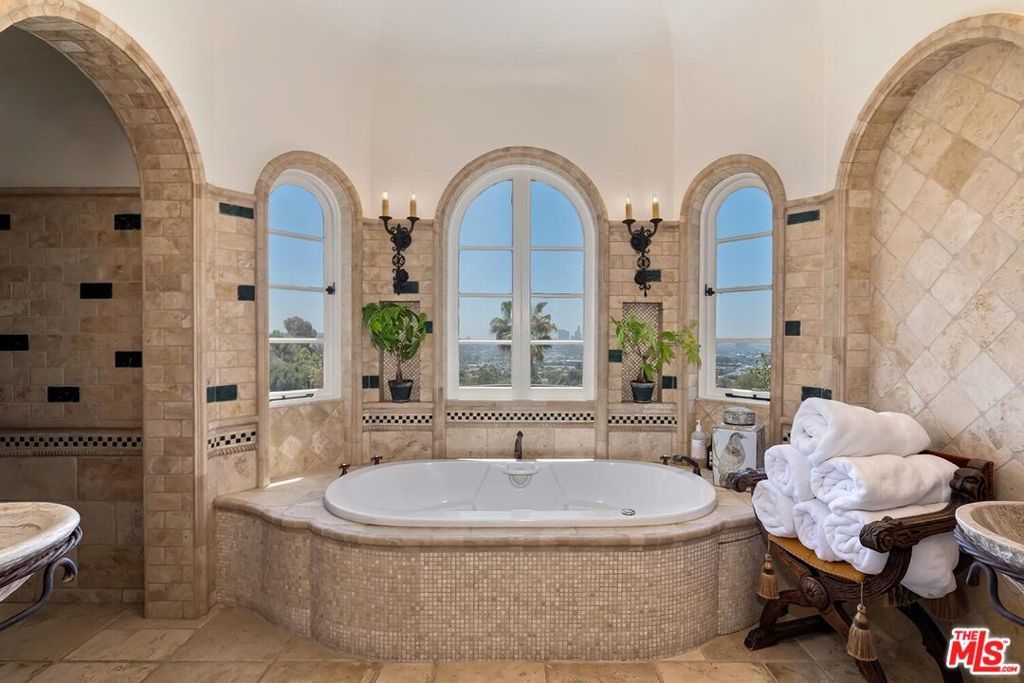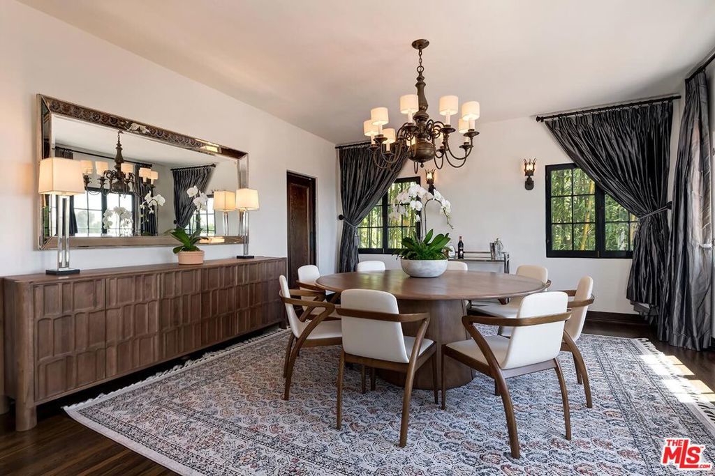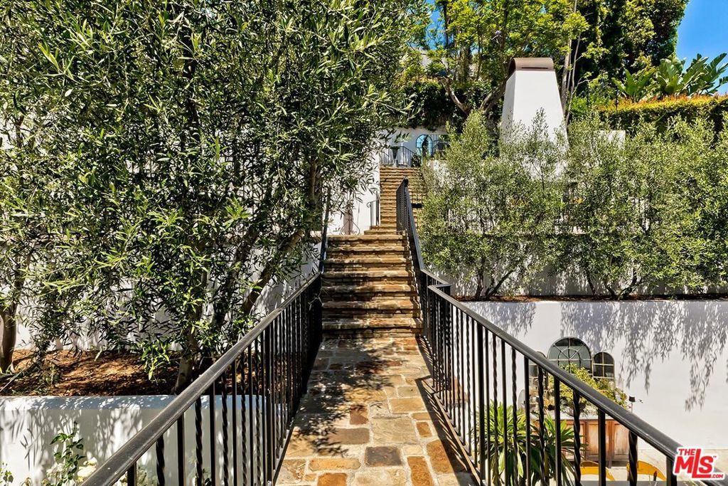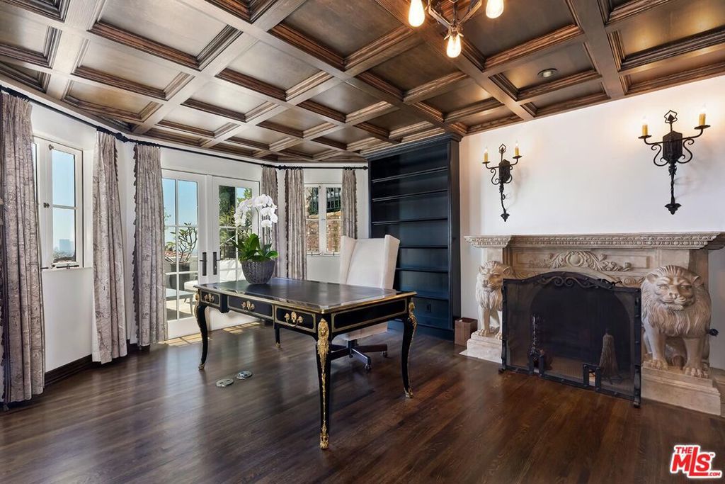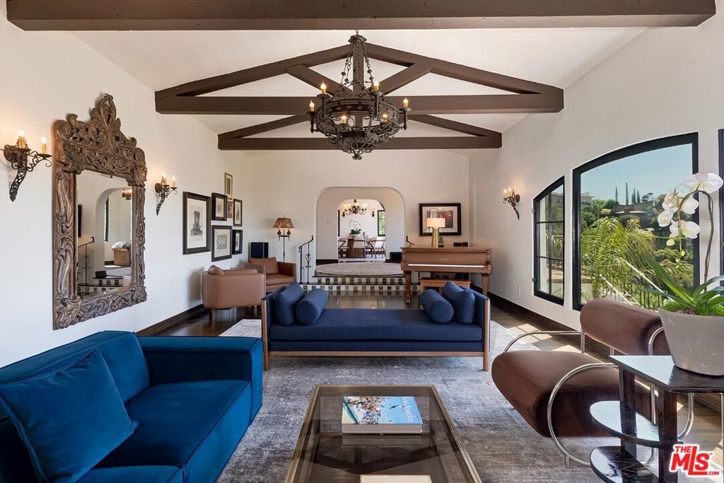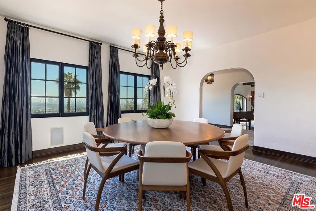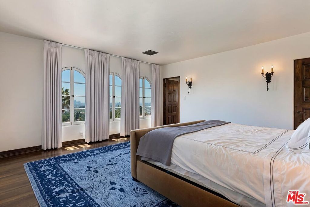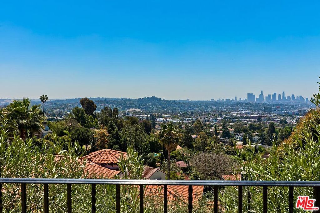 Meticulously curated Spanish stunner perched in the coveted hills of Los Feliz. This fully furnished entertainer's home features multiple indoor and outdoor living and dining spaces to optimize the California lifestyle. Panoramic views of the Los Angeles skyline visible from almost every room and multiple patios provide a jaw-dropping backdrop to everyday living. Upon entry, the formal living room anchored by a massive stone fireplace boasts original beams, a baby grand piano and designer furniture. Across the foyer sits the formal dining room complete with seating for 8 and windows flooding the room with light. A large chef's eat-in kitchen with ample storage and counter space opens to the picturesque back patio with outdoor dining and living. The main level bedroom, currently furnished as an office, offers a convenient and private workspace nearby to a full bathroom with designer tile. Up the colorfully tiled stairs sits the primary suite with a large en-suite bathroom with a walk-in shower and large soaking tub adorned with windows. Two additional guest bedrooms, one featuring a stunning front facing patio, and two full baths complete the second story. The lower level boasts a large family room with a bar, rich coffered ceiling and french doors to the sunny patio with views. Double doors open to an exquisitely designed office with plenty of built-in storage and regal fireplace. A spacious gym with views, a beautiful spa-like bathroom and attached two car garage complete this amazing property.